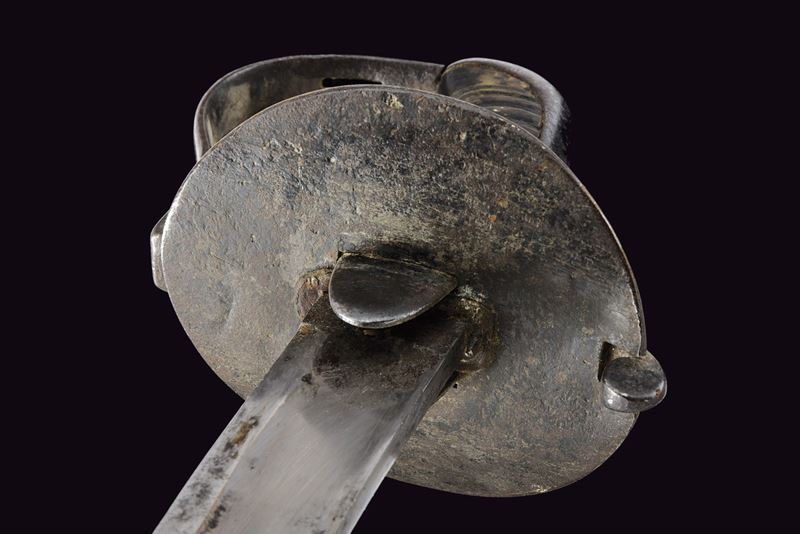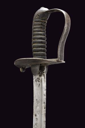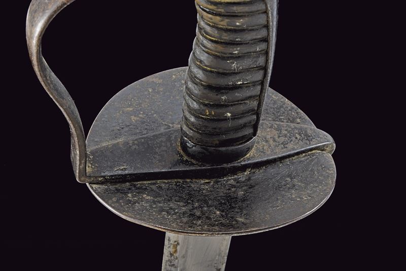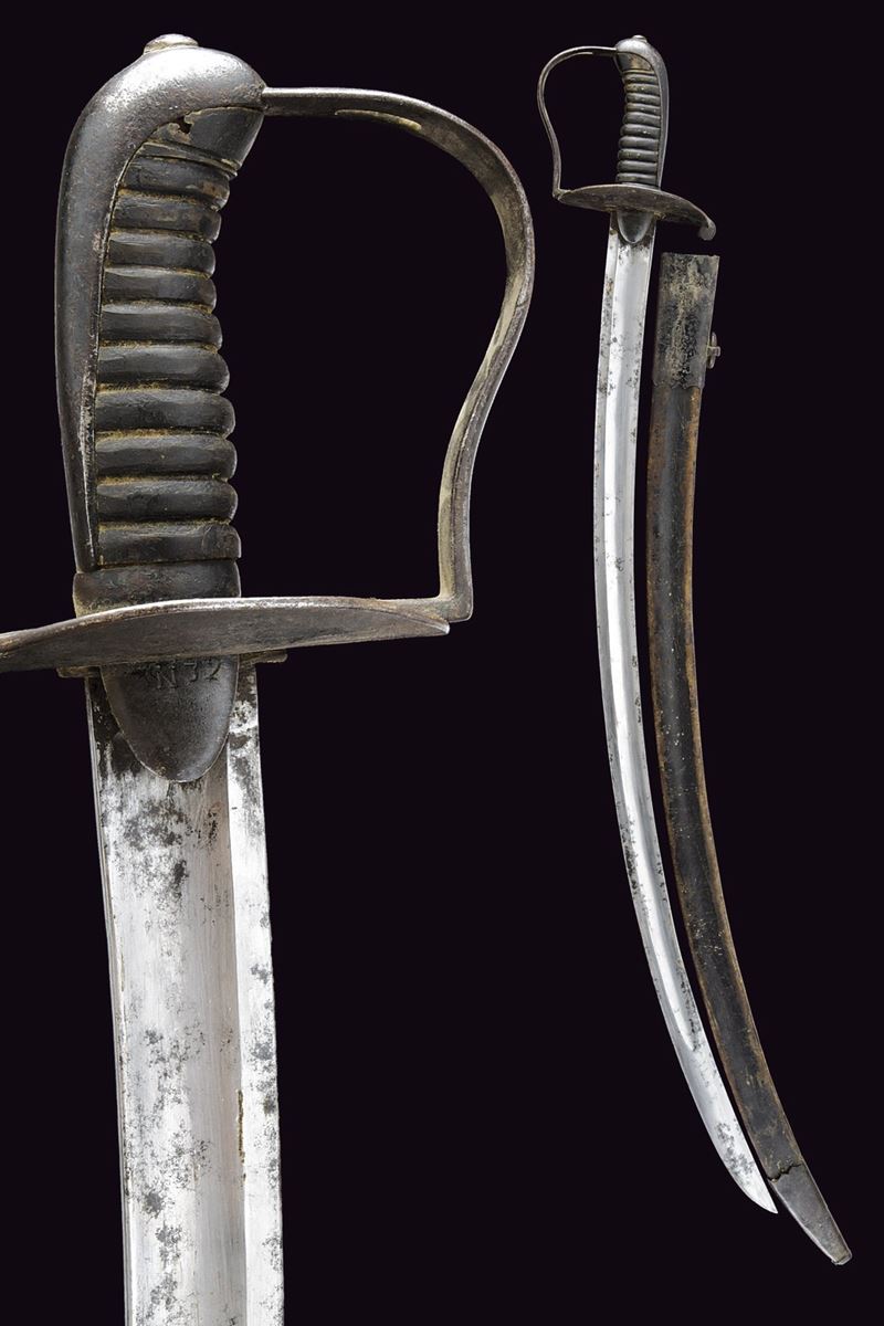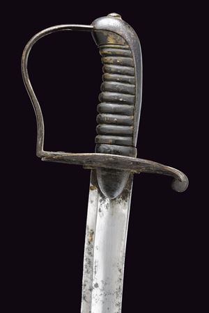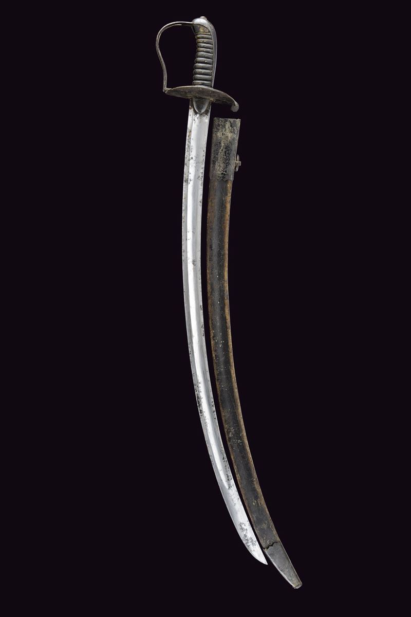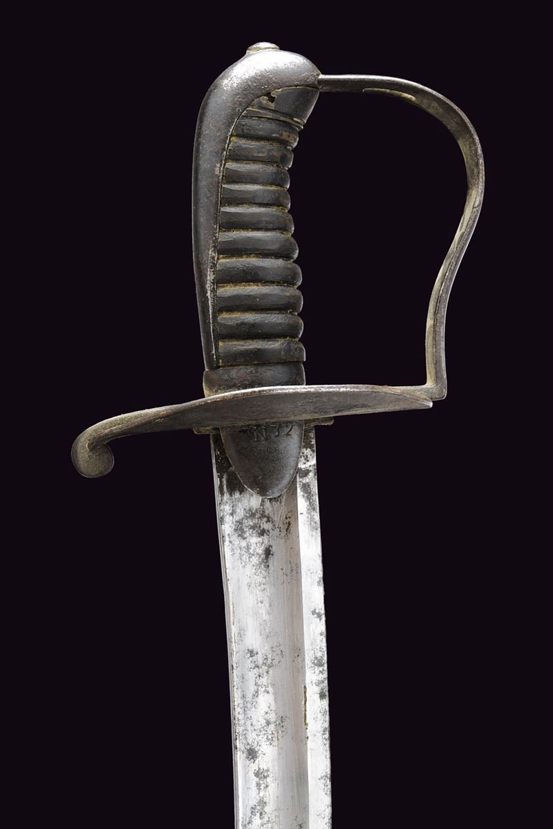 Larga lama da combattimento, curva a un filo e controfilo, con ampio sguscio centrale. Fornimento in ferro annerito con alette fermafodero tonde, una marcata “N 32”; coccia piatta con lati lunghi leggermente rialzati; un ramo di guardia con finestra per la dragona; cappetta lunga e liscia. Impugnatura in corno priva di trecciola. Completa del fodero in cuoio con fornimenti in ferro, la cappetta munita di un anello di sospensione. Rara. Inglese?