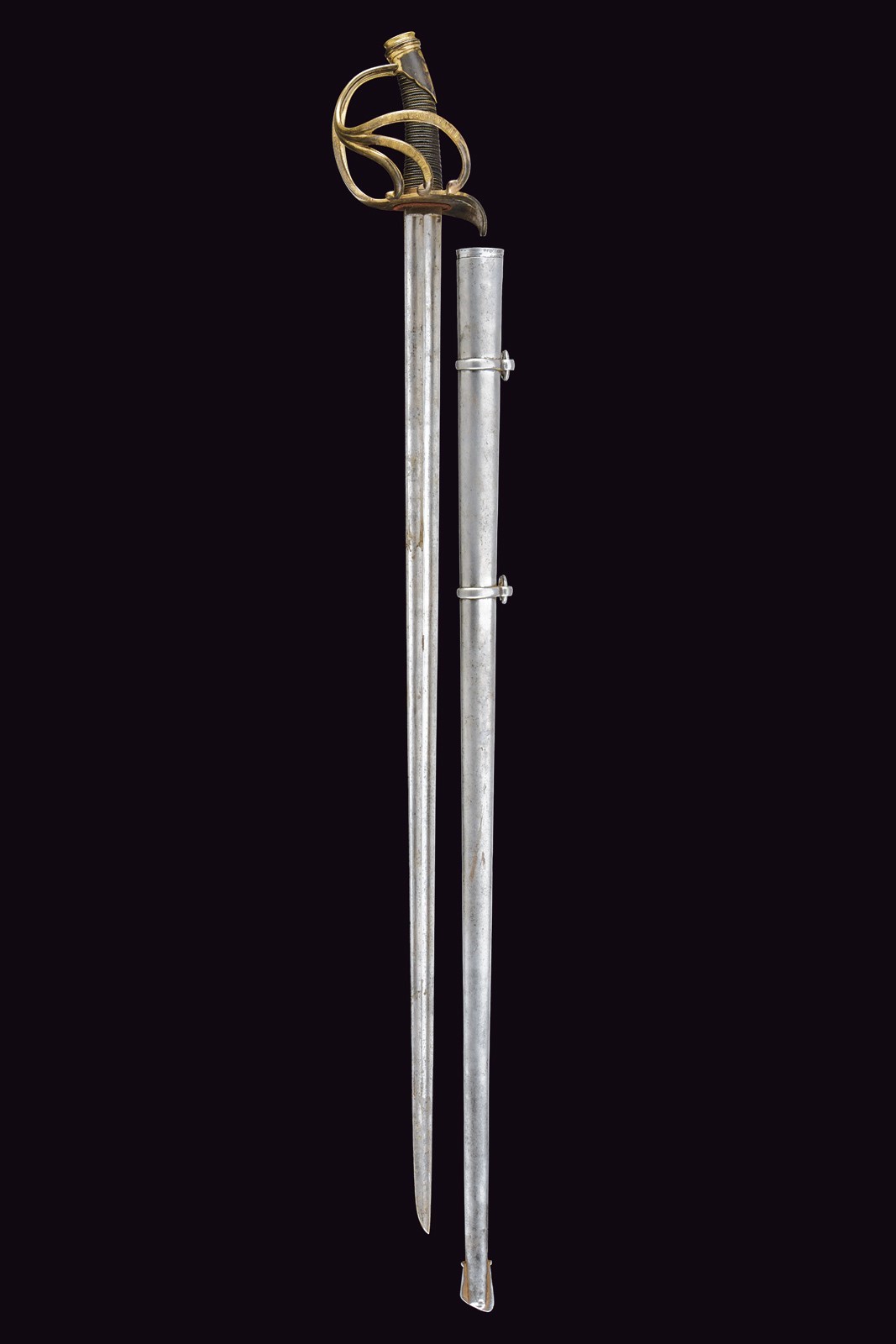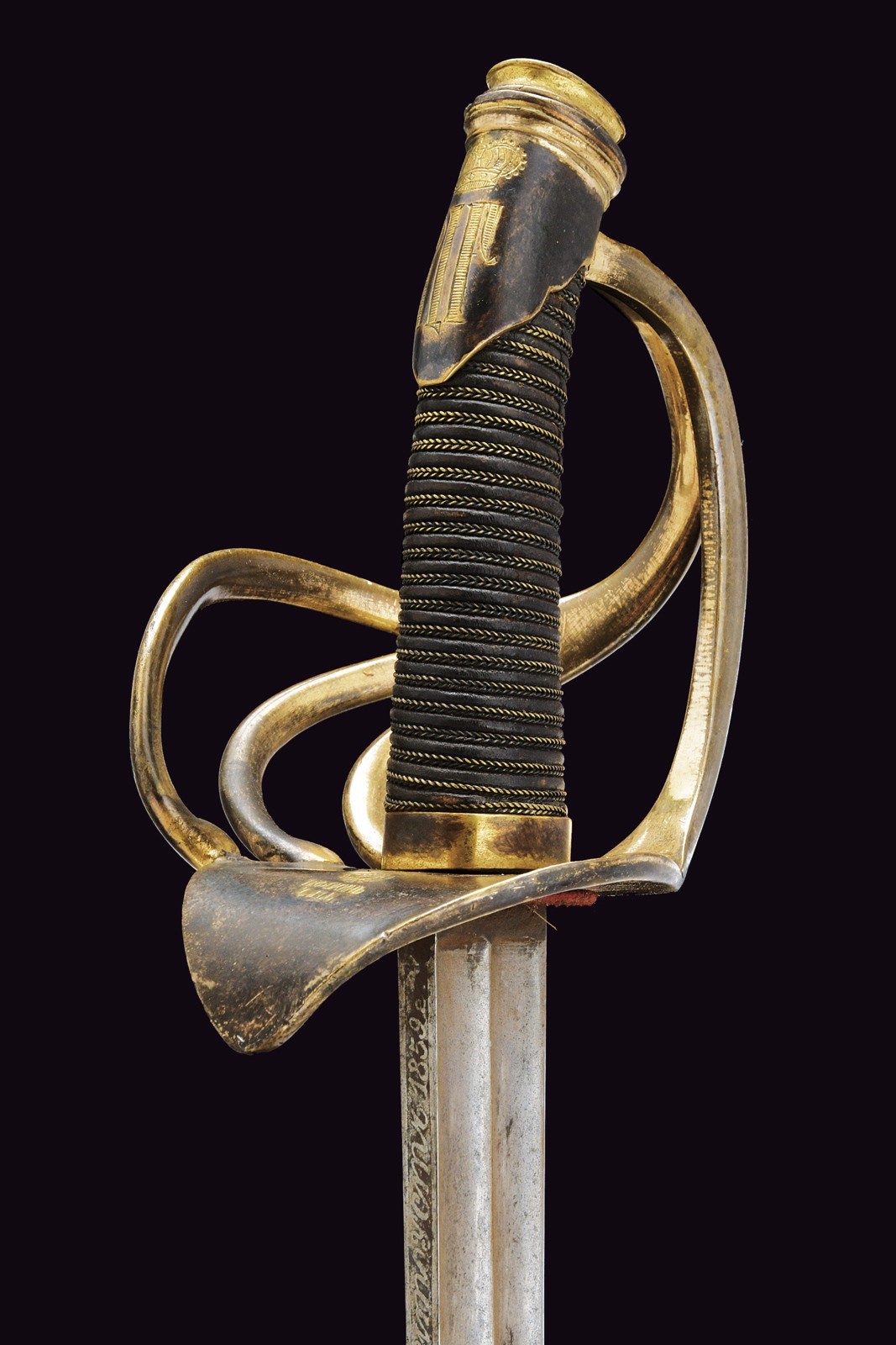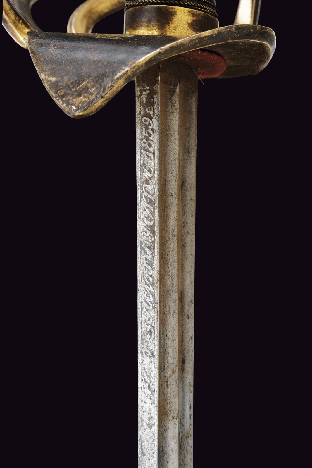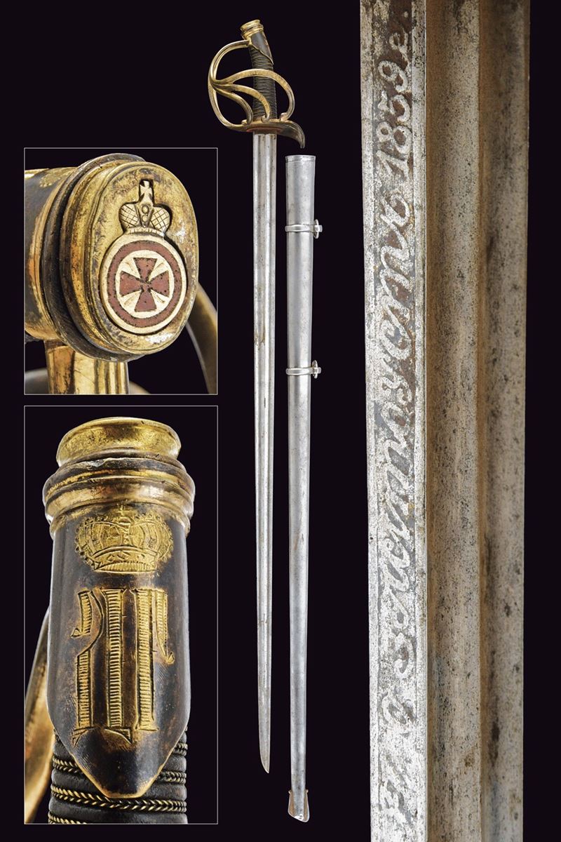 Lama dritta a un filo e controfilo, con duplice scanalatura e tallone, sul dorso è presente la marcatura di Zlatoust datata 1859. Fornimento tipico in ottone a quattro rami di guardia, due dei quali recano l’iscrizione “Per coraggio” in caratteri cirillici; la base marcata “P. FOKIN” e con la sigla di San Pietroburgo. Nel pomo è inserito l’Ordine di Sant’Anna, mentre la cappetta corta presenta un monogramma sormontato da corona. Impugnatura in legno rivestita di cuoio con trecciola in ottone. Fodero in ferro con due anelli di sospensione.