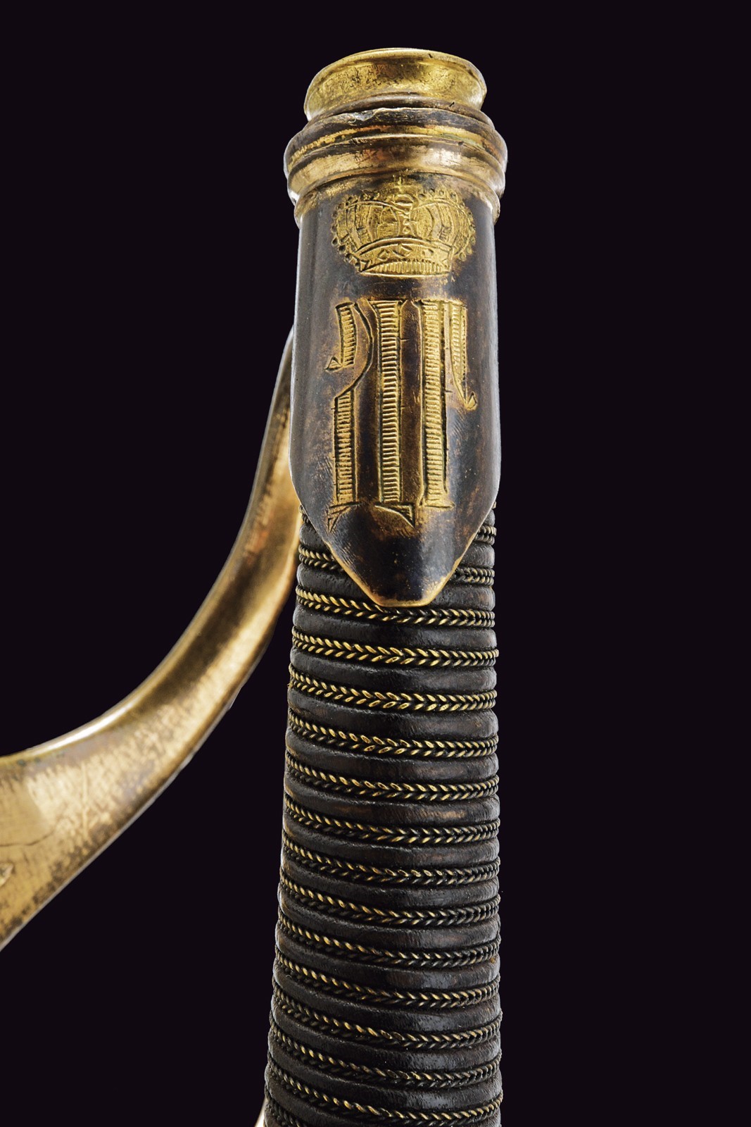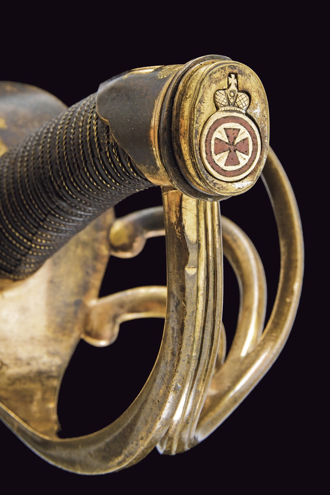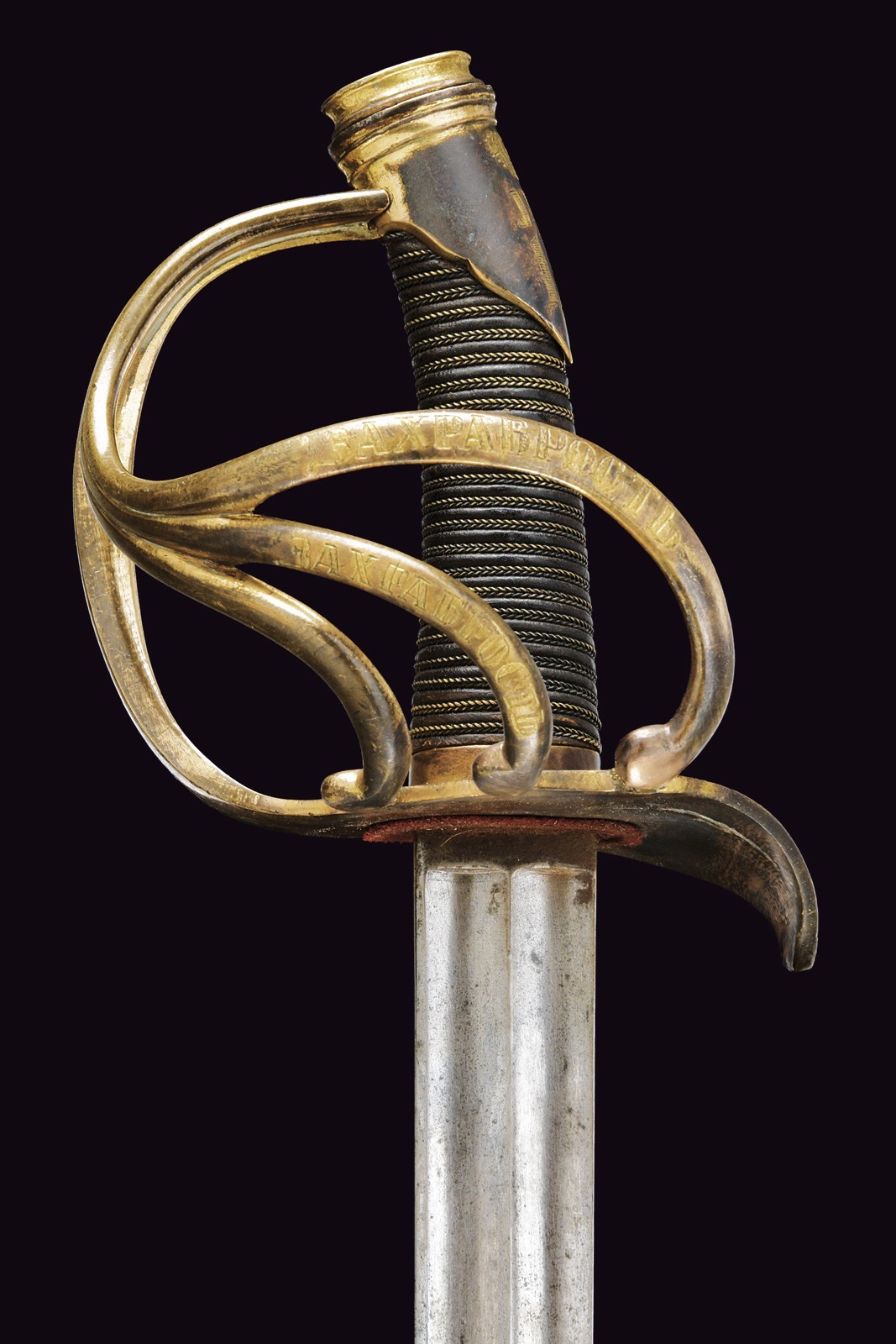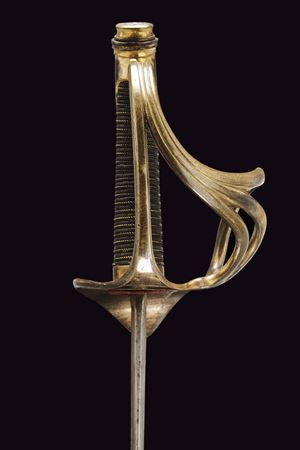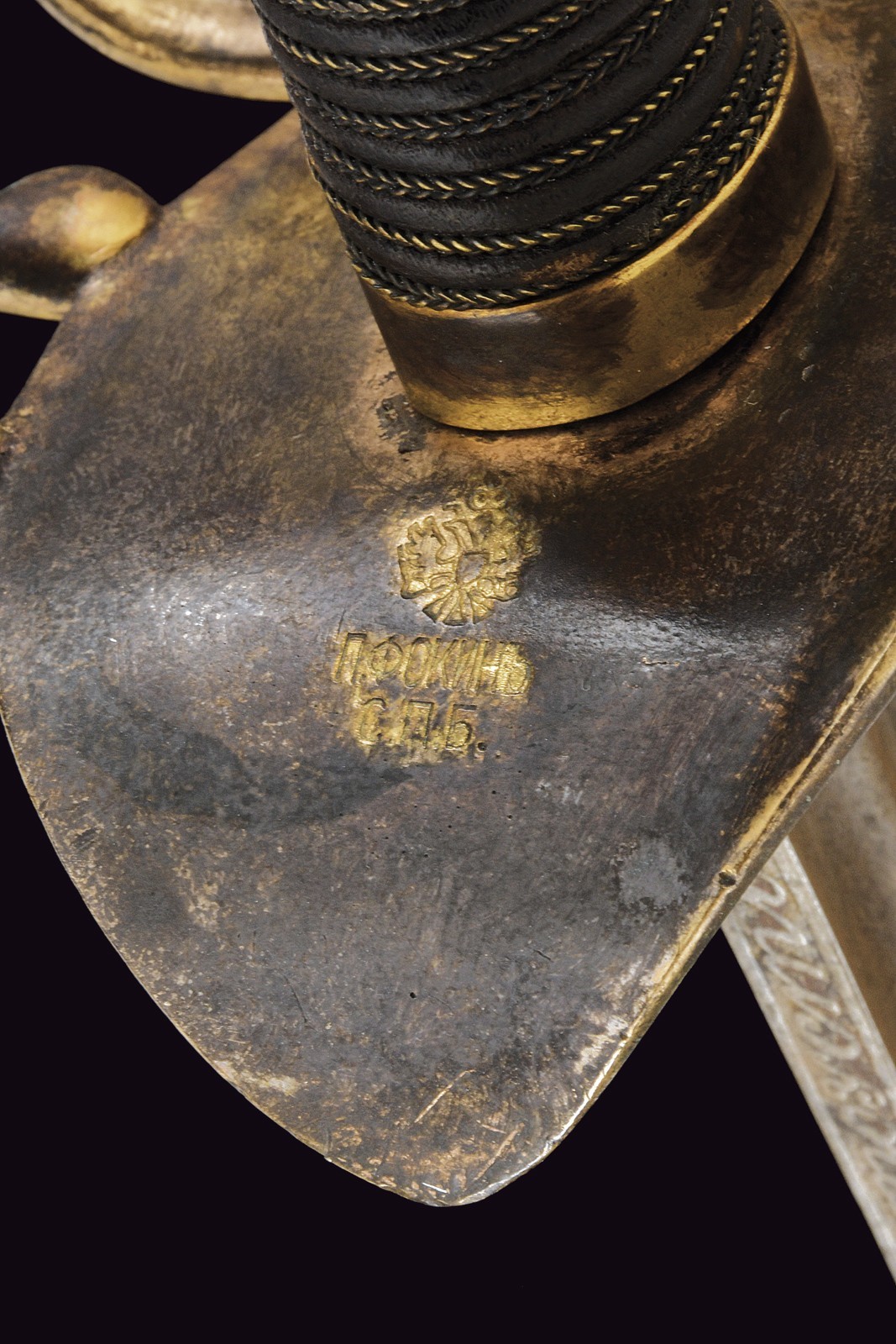 Lama dritta a un filo e controfilo, con duplice scanalatura e tallone, sul dorso è presente la marcatura di Zlatoust datata 1859. Fornimento tipico in ottone a quattro rami di guardia, due dei quali recano l’iscrizione “Per coraggio” in caratteri cirillici; la base marcata “P. FOKIN” e con la sigla di San Pietroburgo. Nel pomo è inserito l’Ordine di Sant’Anna, mentre la cappetta corta presenta un monogramma sormontato da corona. Impugnatura in legno rivestita di cuoio con trecciola in ottone. Fodero in ferro con due anelli di sospensione.