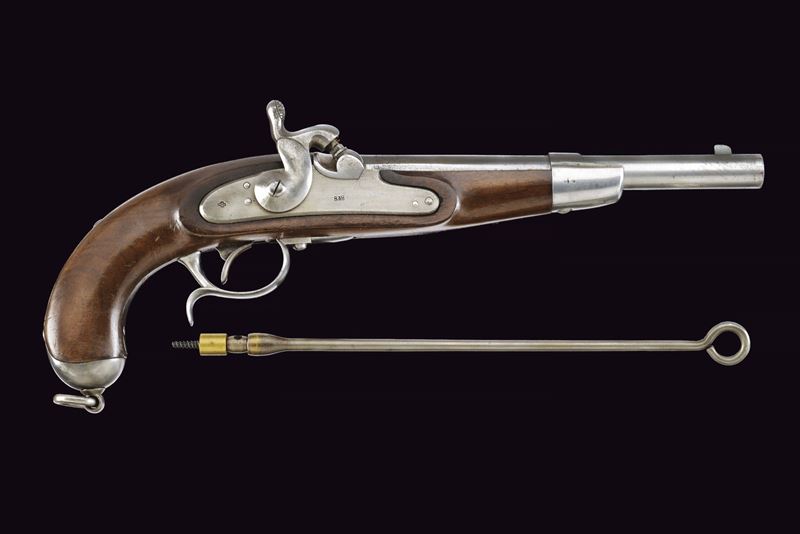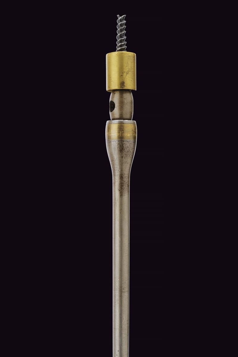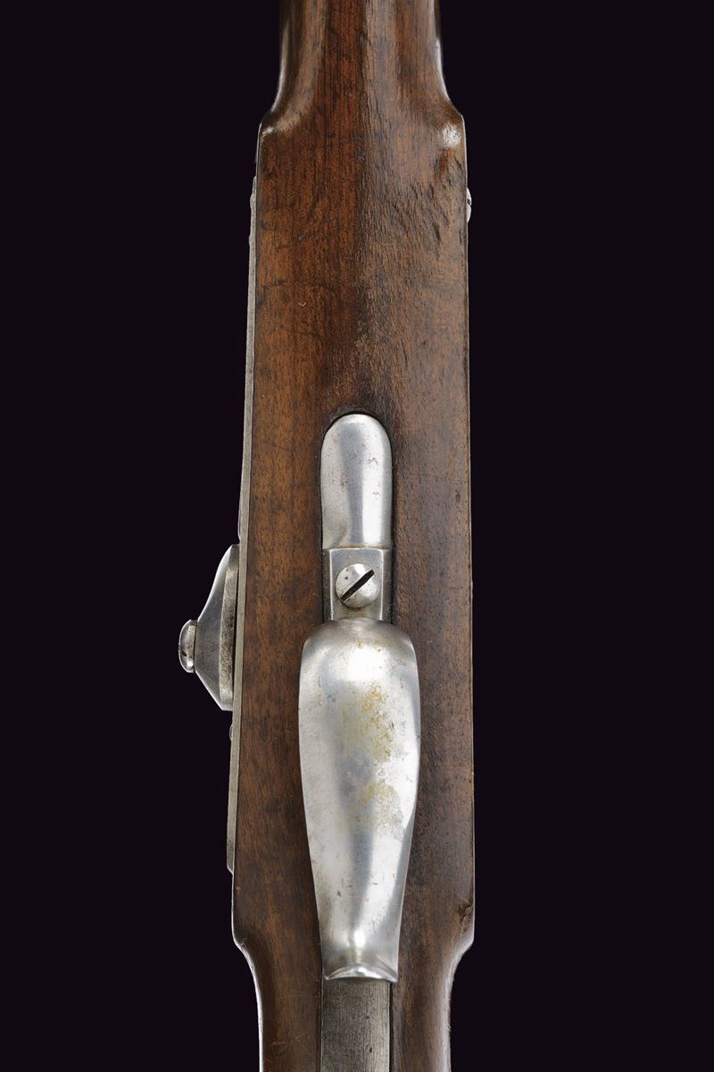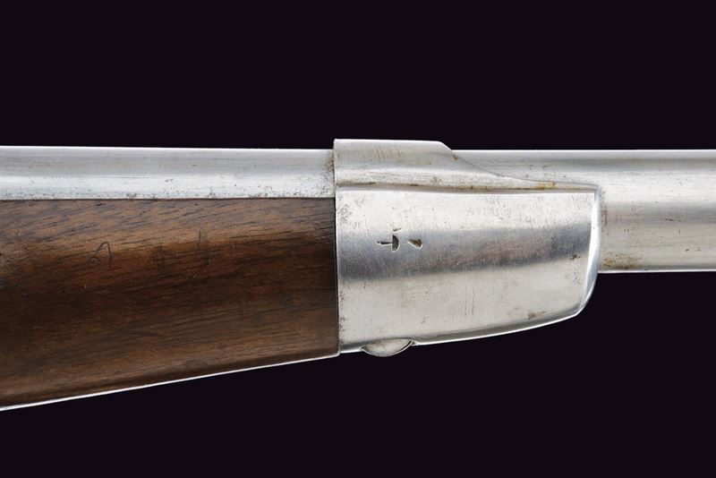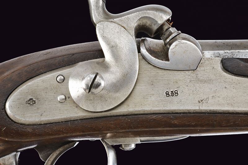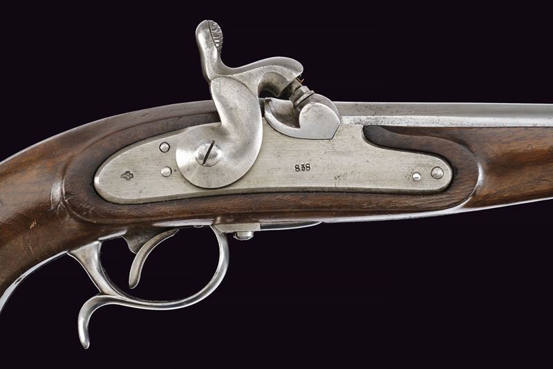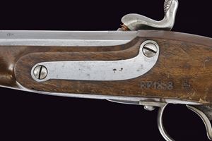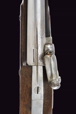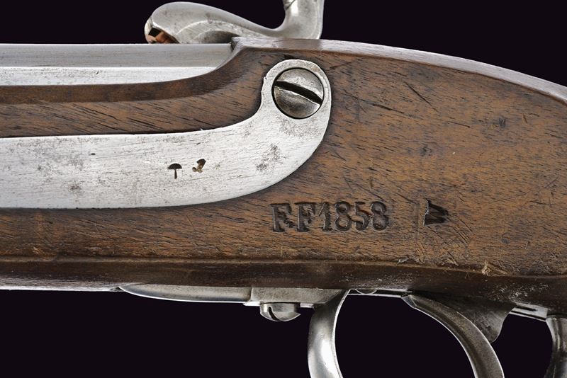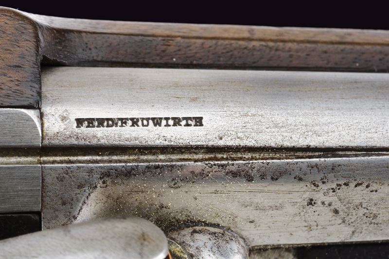 Canna rigata, anima pulita e rigatura ben visibile, tonda con base quadra, marcata "FERD. FRUHWIRTH" e "W" e con resti dell’aquila bicipite, scanalatura in mezzeria che funge da traguardo e si estende anche sulla codetta; mirino; calibro 13,9 mm. Batteria a molla in avanti datata "858" e con marchio imperiale, meccanica funzionante a due scatti. Cassa in legno marcata "FF 1858" e "W", fornimenti in ferro con punzoni. Ponticello con poggiadito, coccia con anello di sospensione. Completa della bacchetta disgiunta e di due attrezzi per la pulizia della canna.