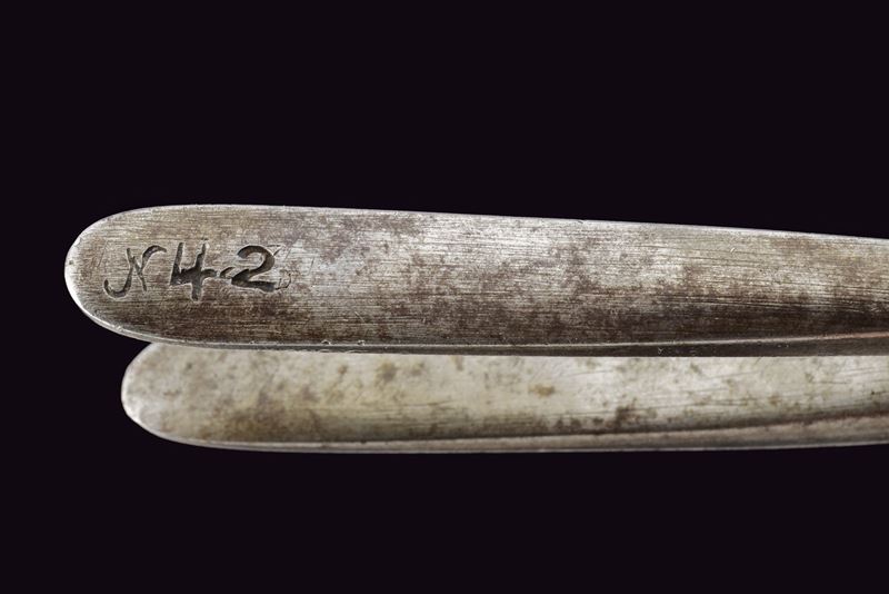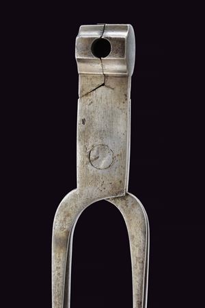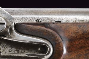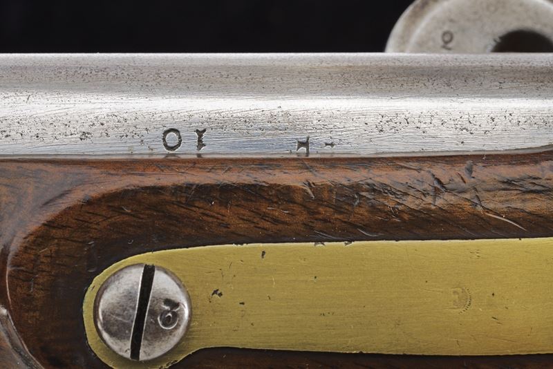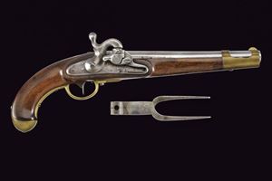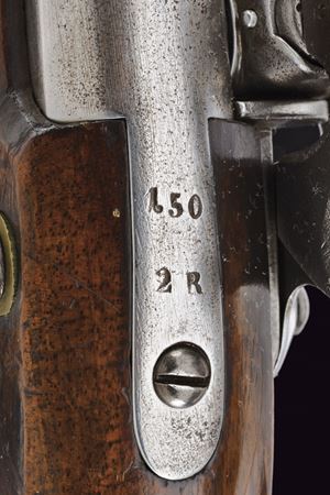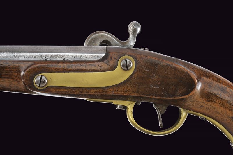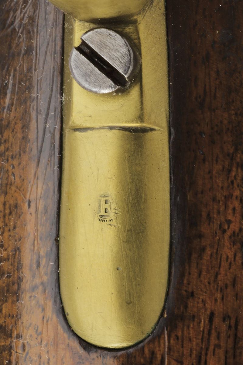 Canna liscia, tonda con base quadra marcata "FERD FRUHWIRTH", "FF", "10" e con marchio imperiale; mirino sul bocchino; calibro 17 mm; codetta tondeggiante marcata "150 2 R". Batteria sistema Augustin datata "850" e con aquila bicipite, meccanica funzionante a due scatti. Cassa intera in legno con fornimenti in ottone. Questo tipo di pistola fu fabbricata solo per un anno. Insieme al fondipalla.