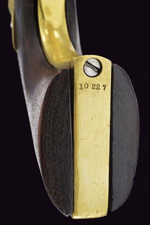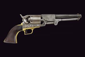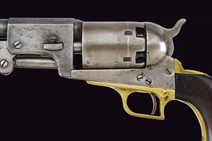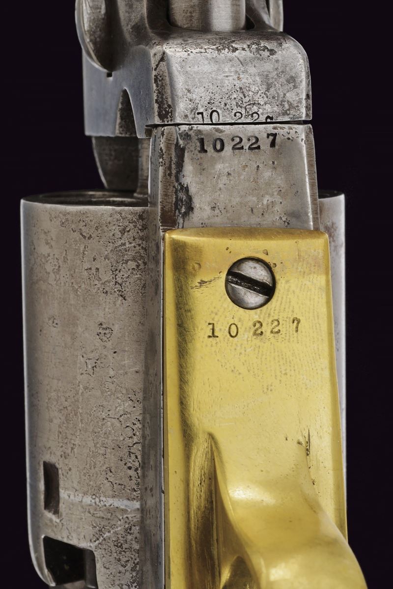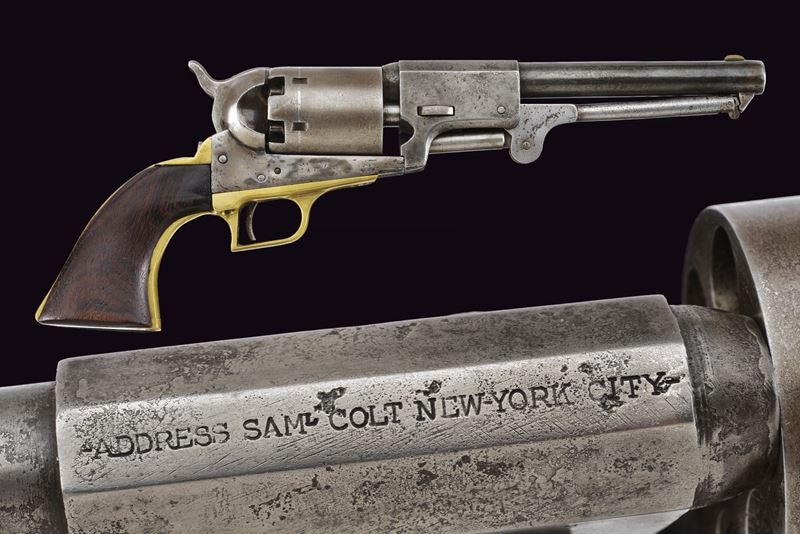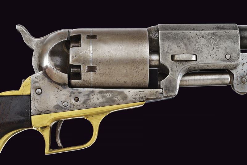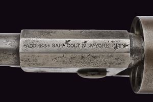 Canna cilindrica da 7-1/2" (anima pulita, rigatura scarsamente visibile) con base ottagonale, dotata di basso mirino in ottone, marcata "- ADDRESS SAM.L COLT NEW YORK CITY -" (rinfrescata?) con lettura verso la culatta, cal. 44. Tamburo liscio a sei colpi con tacche rettangolari, con incisioni non visibili. Il perno centrale privo di numerazione. Meccanica funzionante ma un po' incerta, tre scatti, sicura al grilletto non funzionante. Castello senza marcatura "COLTS PATENT". Ponticello del tipo squadrato, in ottone. Bande dell'impugnatura in ottone. L'impugnatura in noce senza marchi, non perfettamente aderenti. Intaccature, segni d'uso e del tempo. Matricola "102xx" presente sotto al castello, timbrata con caratteri apparentemente coevi all'epoca. Fermo canna non numerato. Su canna, tamburo e impugnatura è presente matricola coeva ma in caratteri lievemente differenti (ritimbrati?). Restauri, fra i quali una piccola rimozione praticata all'attacco della canna, forse per ottenere una migliore aderenza con il tamburo.