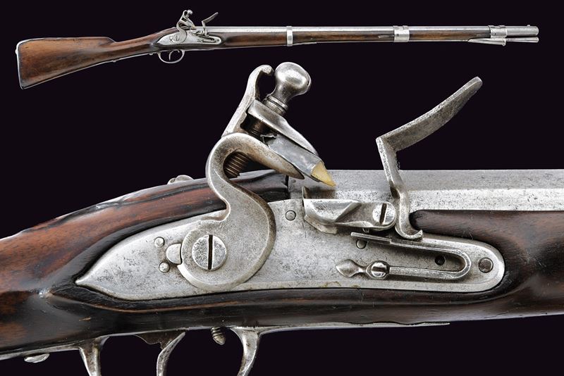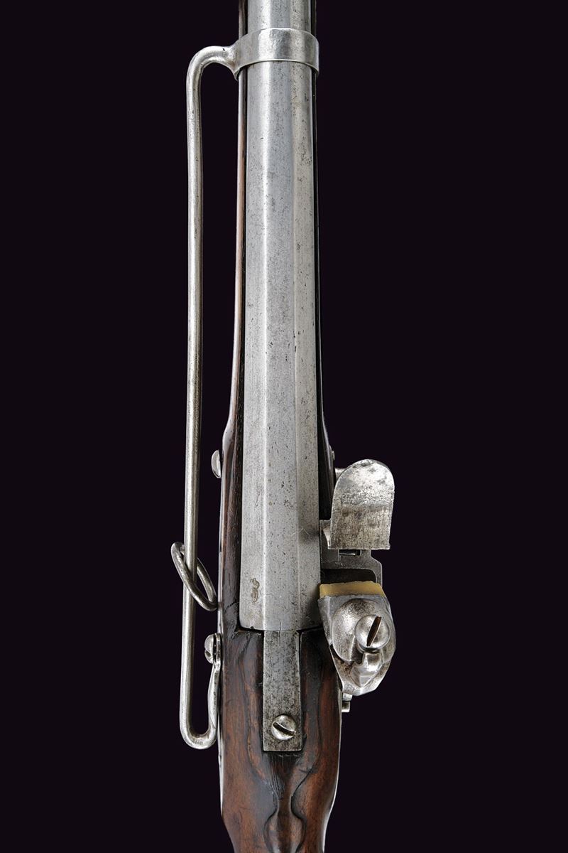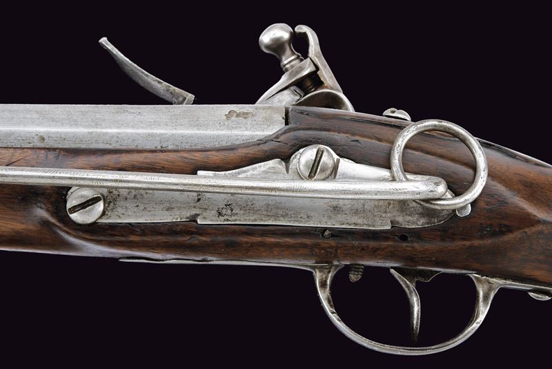 Canna liscia a due ordini, la parte anteriore ottagonale e poi tonda; base con resti di punzone; mirino; calibro 18,3 mm. Codetta liscia. Batteria a pietra focaia interamente in ferro. Cassa intera in legno, lievemente scolpita, con fornimenti attorno alla codetta, barra con anello da sella e bacchetta in ferro.