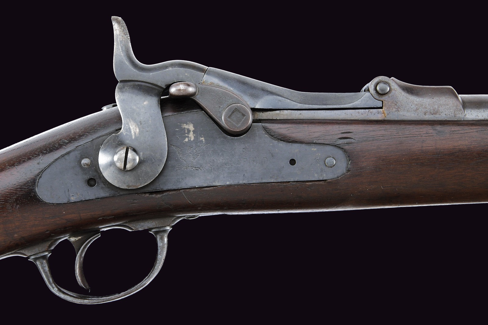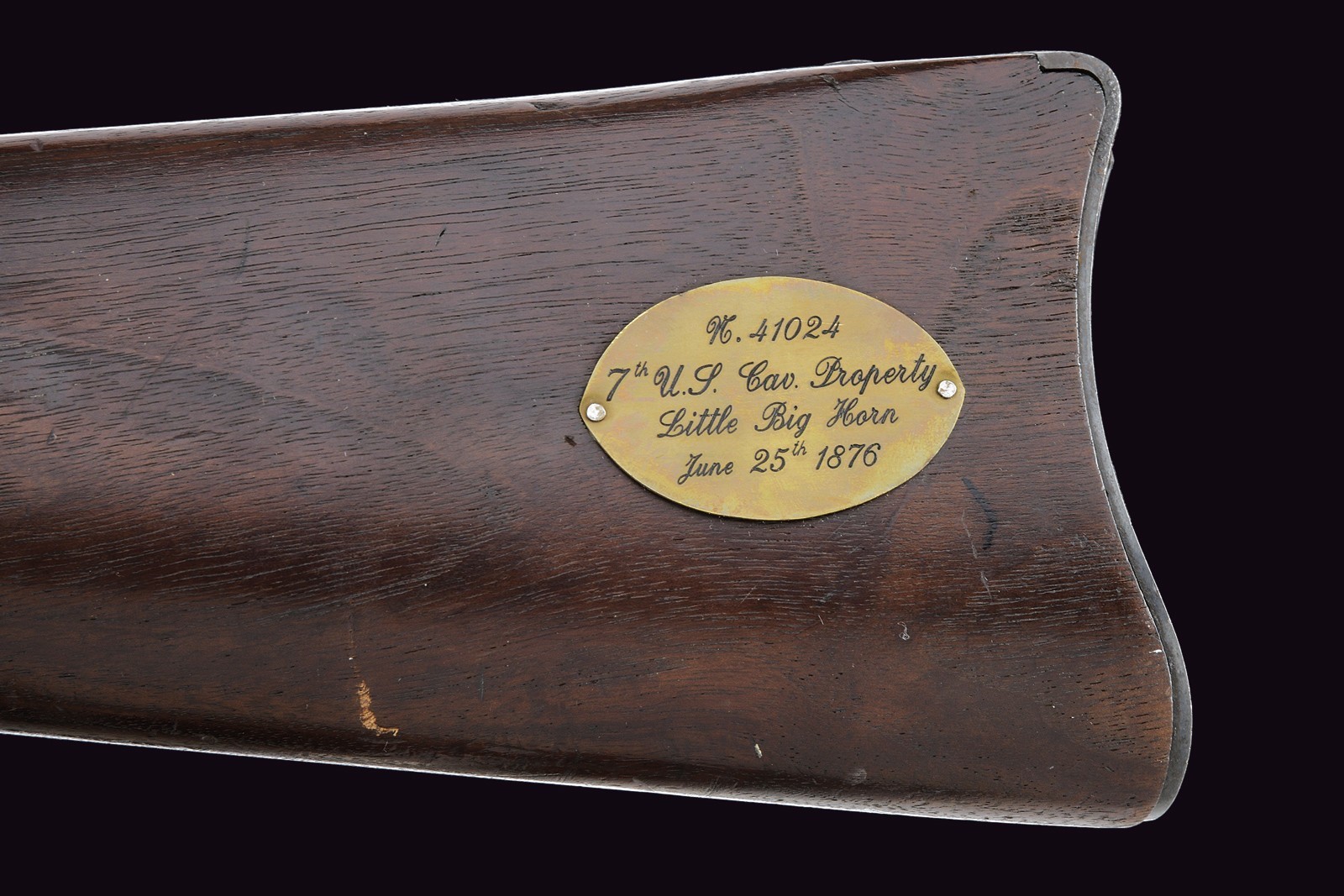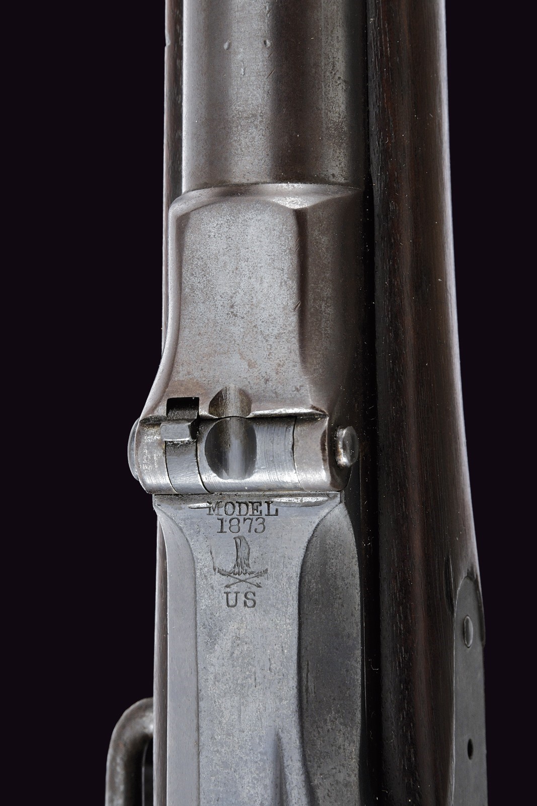 Canna tonda da 22", dotata di mirino, con alzo abbattibile numerato sino a "15", cal. 45-70 a percussione centrale. Anima pulita, rigatura visibile. Otturatore trapdoor marcato con dicitura "MODEL 1873" sormontante testa d'aquila posta su frecce incrociate e con iscrizione "US". Il codolo con matricola "410xx". Batteria con cartella marcata "US SPRINGFIELD" e con l'aquila statunitense incisa. Meccanica funzionante. Mezza cassa in noce, apparentemente senza timbri visibili. Calciolo marcato "US" (intaccature) dotato di sportellino, all'interno tre scomparti. Fornimenti in ferro. Reggicanna singolo. Staffa con anello da sella sul fianco sinistro. Qualche ribrunitura. Leggeri segni d'uso e del tempo. Sul lato sinistro della pala applicata una targhetta in ottone che ne indica l'appartenenza al Settimo Cavalleria.