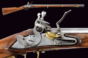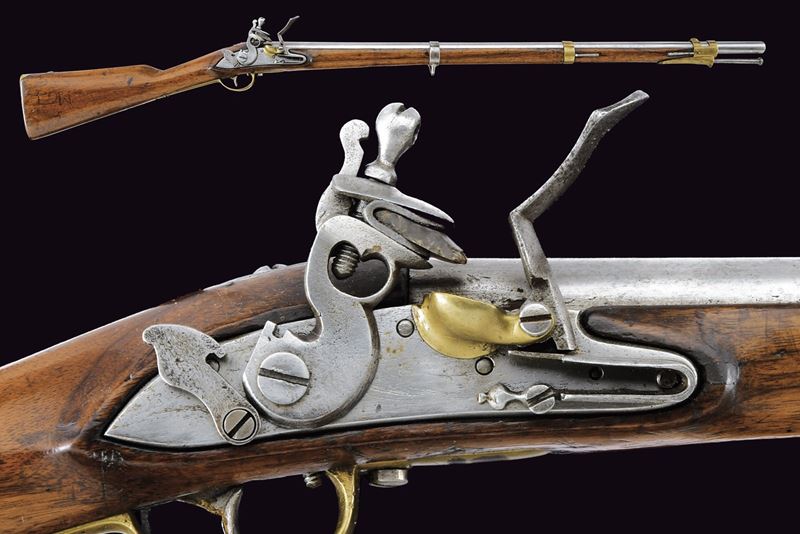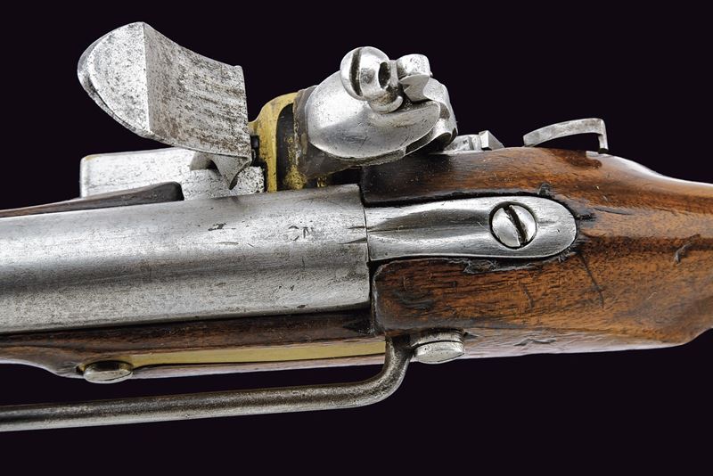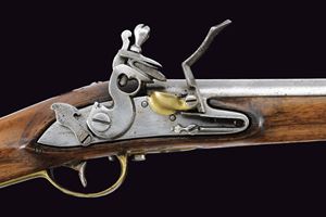 Canna tonda liscia con resti di marcatura alla base; mirino sul bocchino; calibro 17,5 mm. Codetta con traguardo. Batteria a pietra focaia provvista di scodellino in ottone e sicura. Cassa intera in legno (alcune marcature, piccole mancanze) con fornimenti in ottone, barra con anello da sella e bacchetta in ferro.