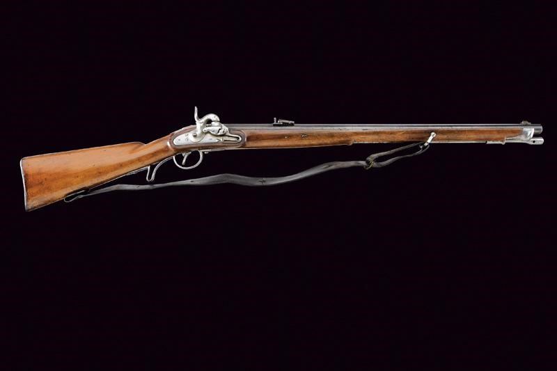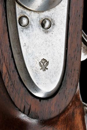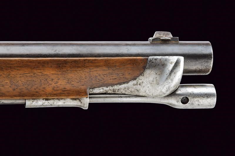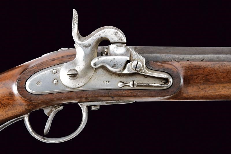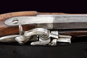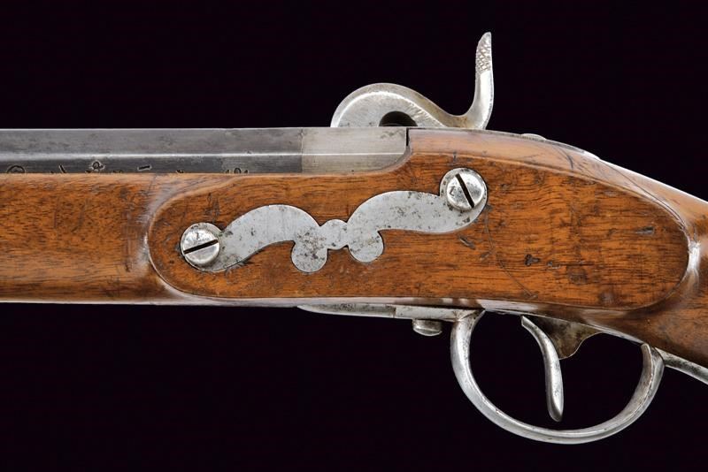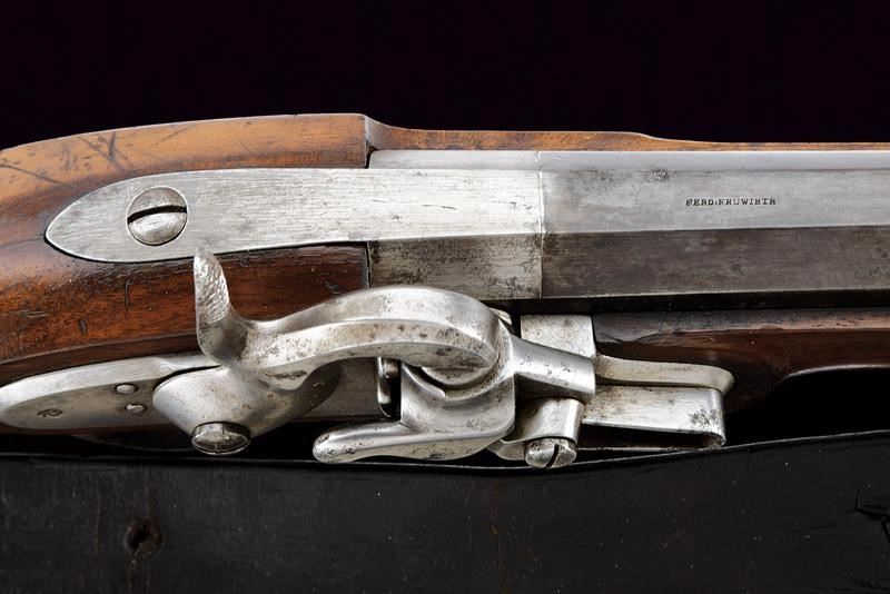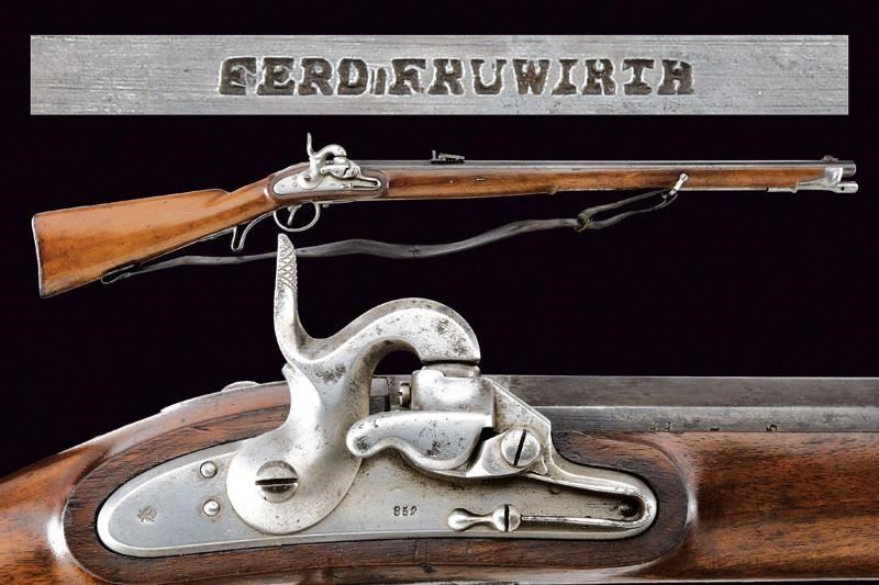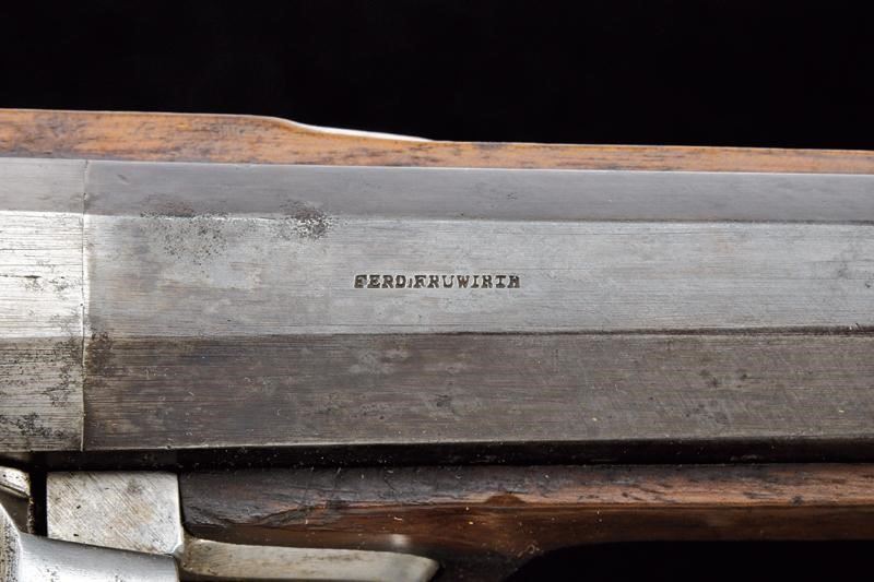 Canna rigata (anima con pitting, ma rigatura ben visibile), con brunitura rinfrescata; nella parte iniziale ottagonale, recante la firma “FERD. FRUHWIRTH”, con alzo abbattibile, quindi tonda con bindella e mirino (non predisposta per baionetta); calibro 16 mm. Codetta liscia. Batteria datata “852” e contrassegnata dall’aquila imperiale. Cassa intera con fornimenti in ferro, così come la bacchetta, e dotata di raro bocchino. Cinghia in cuoio. Esemplare molto interessante, probabilmente di uso marittimo.