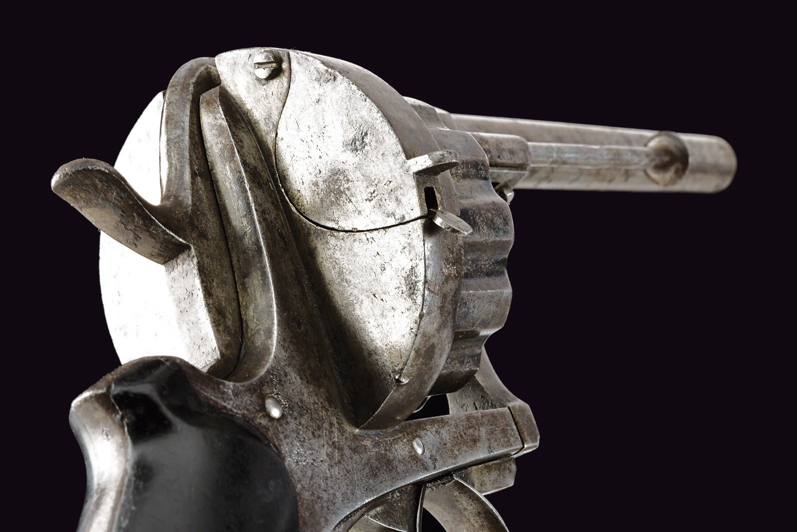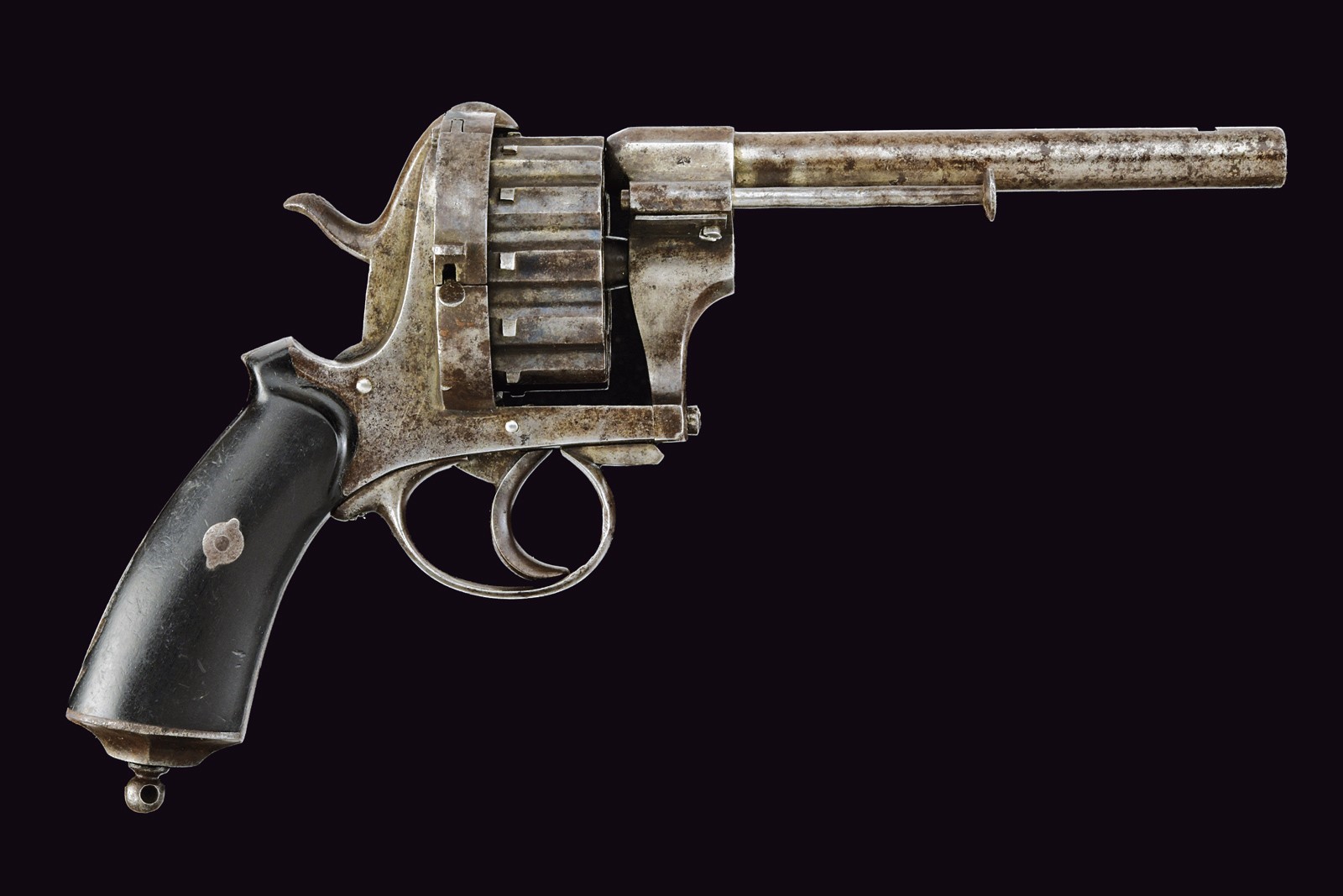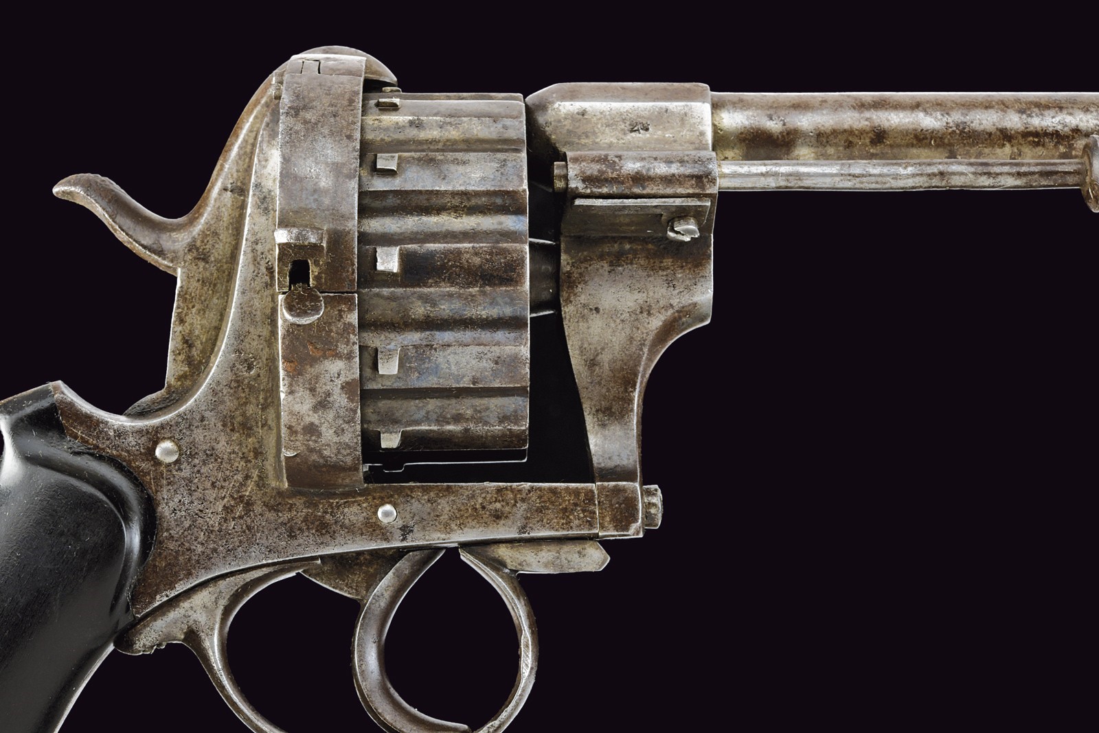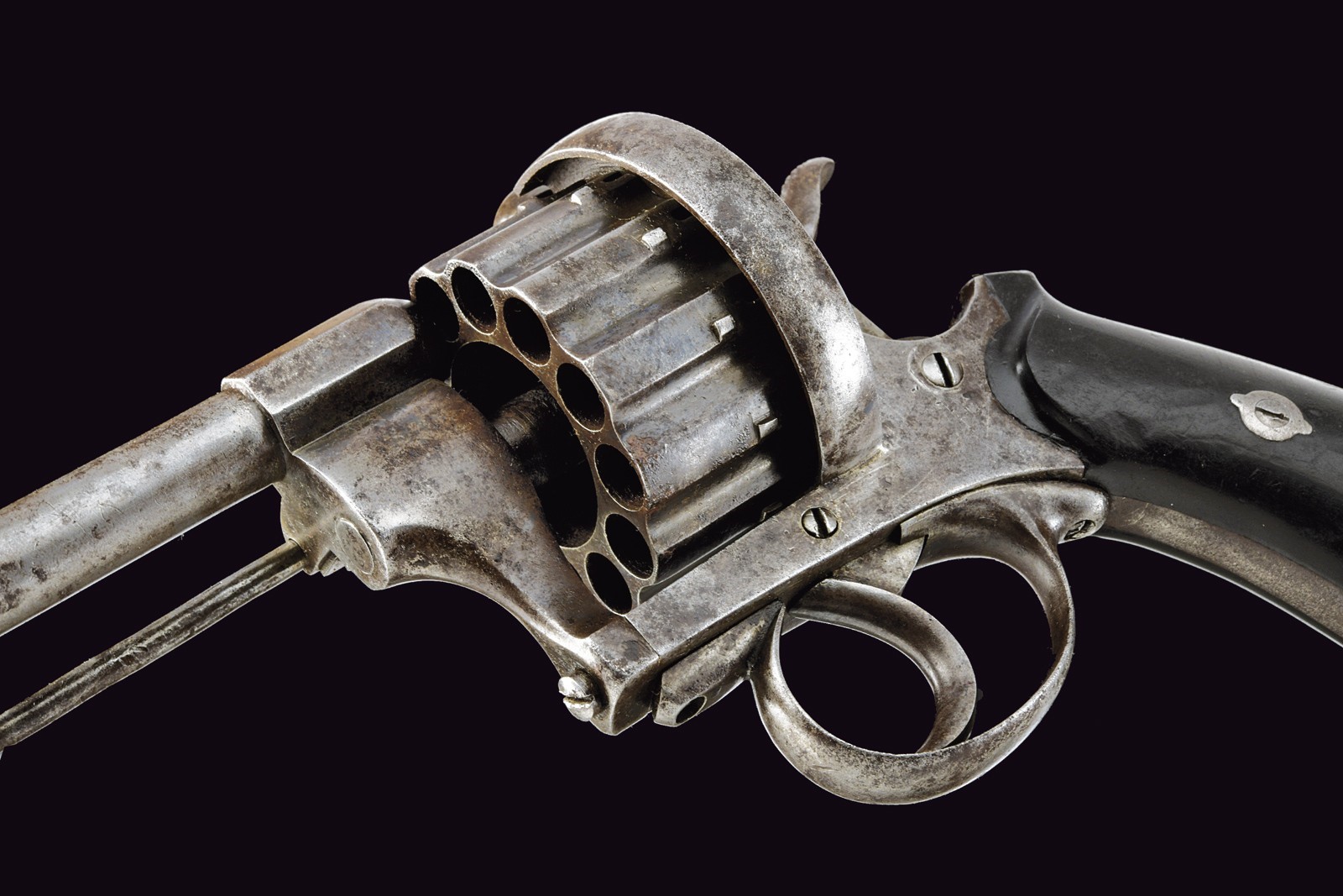 Canna rigata, tonda, con culatta ottagonale recante punzone “N” sotto corona; mirino assente, cal. 9 mm. Tamburo scanalato a dodici colpi con punzone del banco di prova di Liège. Castello liscio. Anello di sospensione mancante. Meccanica funzionante.
