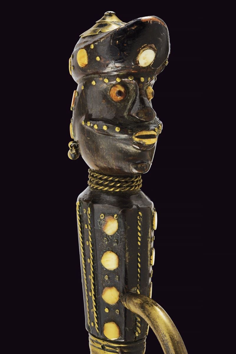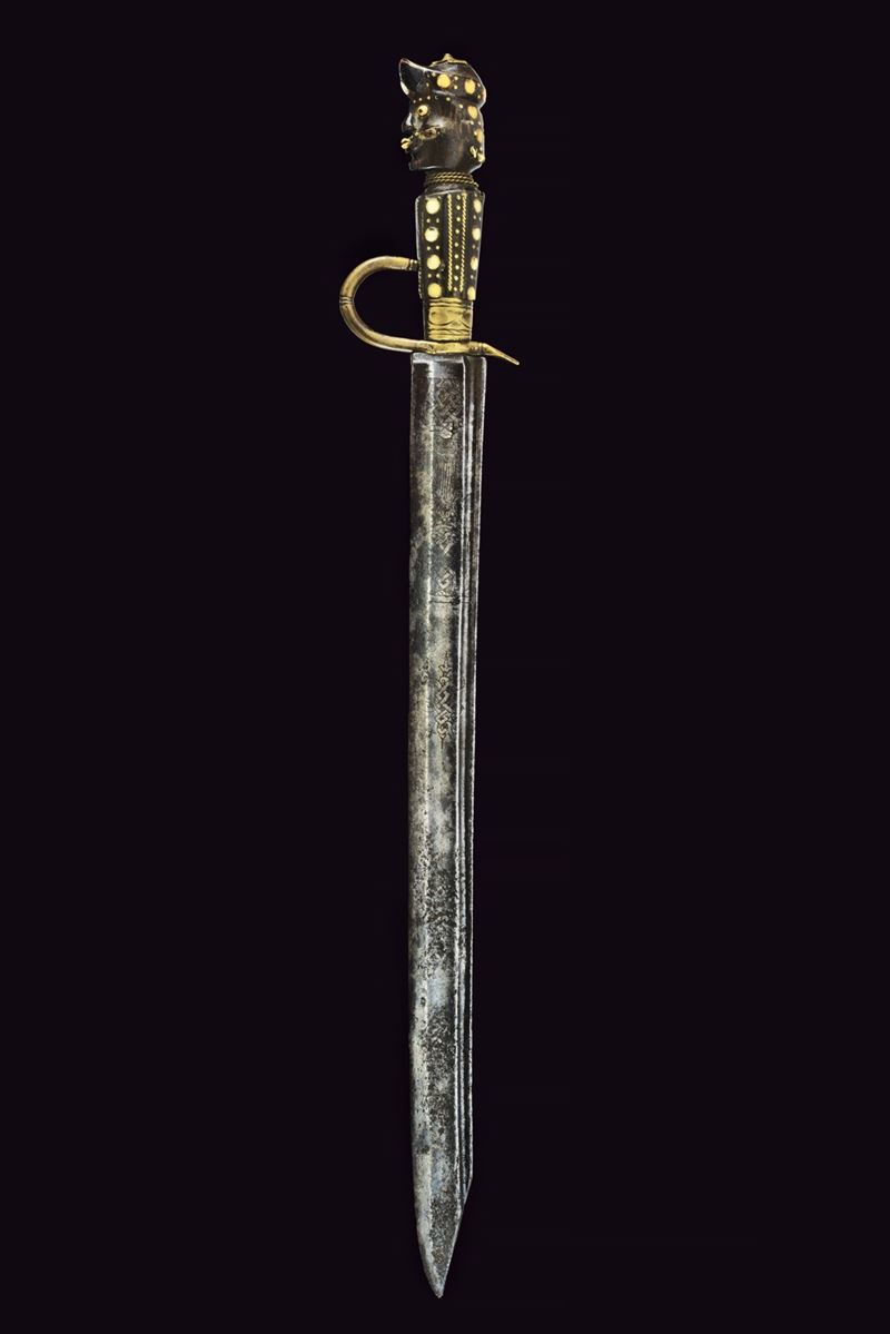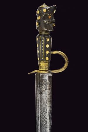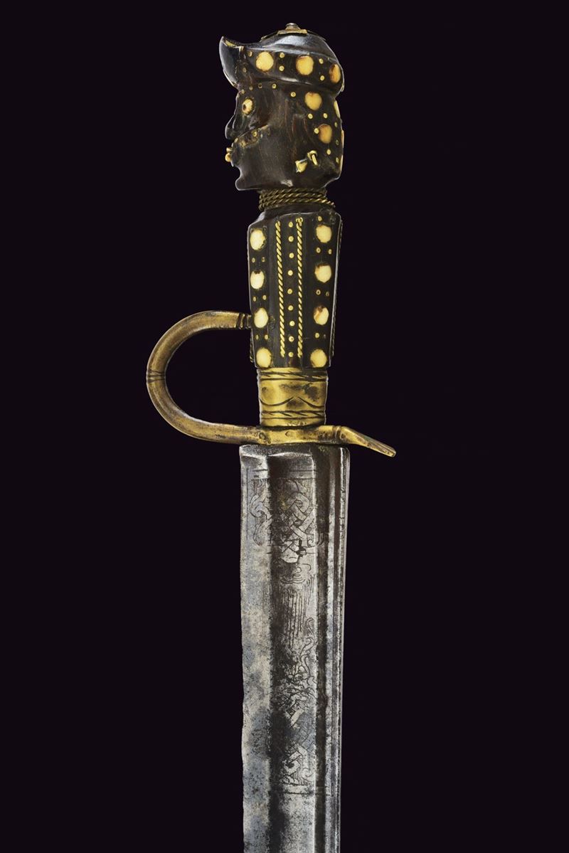 Lama a un filo, ricavata da una sciabola, scanalata verso il dorso ed incisa a bulino con figure e motivi geometrici. Piccolo fornimento in ottone, con guardia a ricciolo e appoggio per il pollice. Ghiera in ottone delineato. Bella e tipica impugnatura in corno, intagliata a testa di moro nella parte superiore, il tutto ornato da balaustre in filo d'ottone a tortiglione, come pure l'ornamento del collo; il tutto ornato da piccole chiodature in ottone e dischetti in osso; il volto con labbra e occhi sempre in osso e piccoli orecchini mobili in ottone. Cappellotto in ottone inciso.