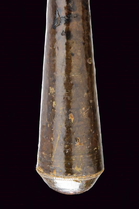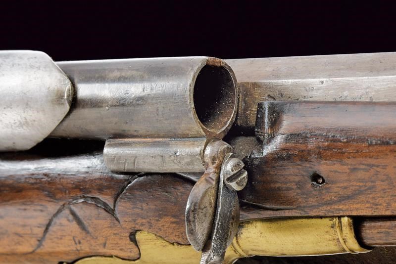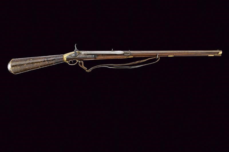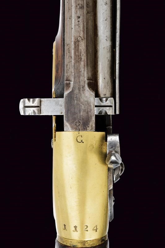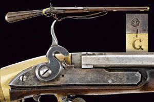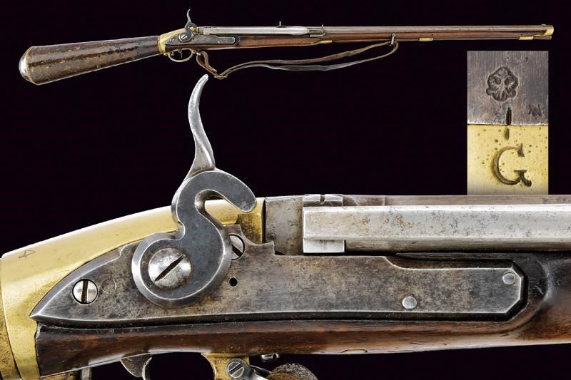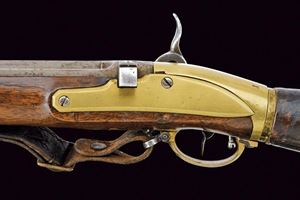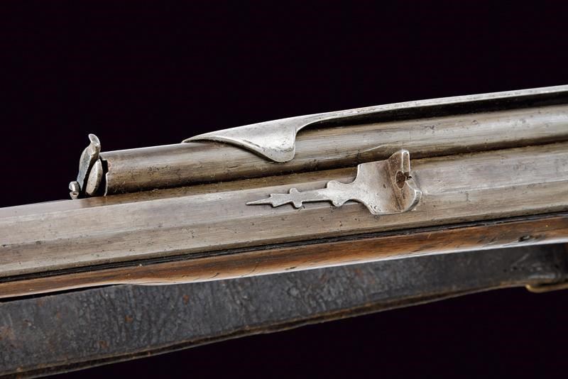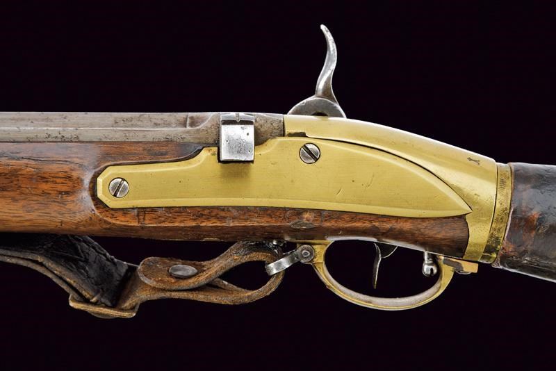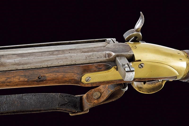 Canna rigata (anima pulita, rigatura ben visibile), ottagonale, con punzone imperiale e sistema di caricamento alla base; alzo e mirino; calibro 11,5 mm. Sul lato destro serbatoio tubolare per venti pallottole. Batteria a molla in avanti con cane, meccanica funzionante; castello in ottone con matricola “11xx” e lettera “G” per Girandoni. Cassa in legno con fornimenti in ottone, calcio in ferro contenente il serbatoio dell’aria, rivestito in cuoio. Tracolla in cuoio. Esemplare estremamente raro.