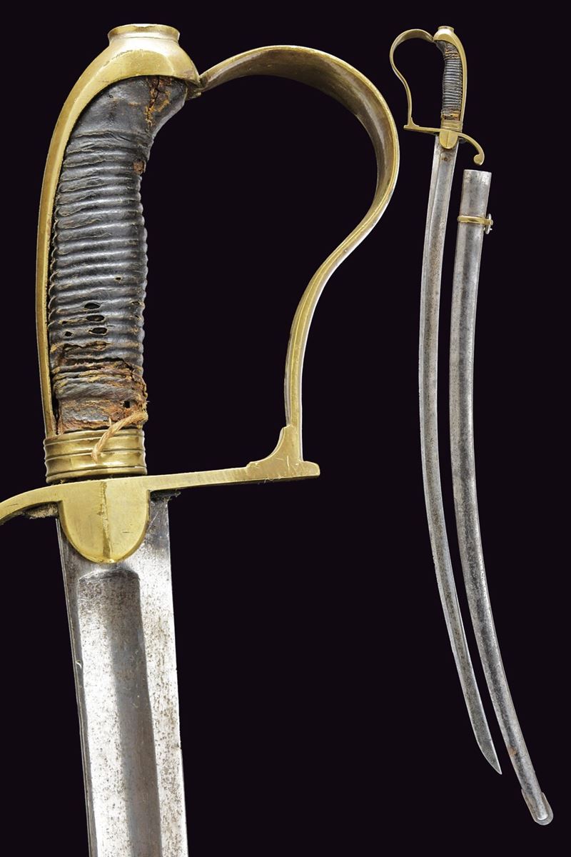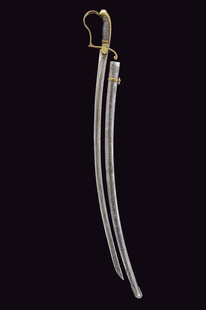Lama curva sgusciata, a un filo, punta e controfilo; tallone. Fornimento in ottone con braccio di parata a ricciolo e guardia bombata. Cappetta lunga in ottone con sommità a bottone ellittico. Impugnatura in legno rivestita di cuoio (mancanze e difetti). Fodero in ferro con una fascetta in ottone munita di campanella ovale.