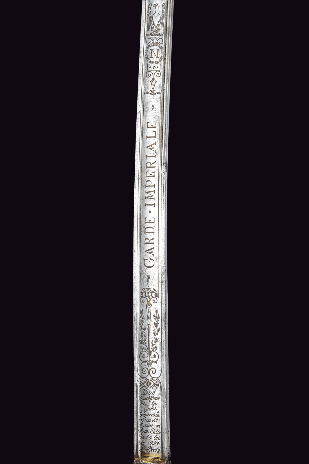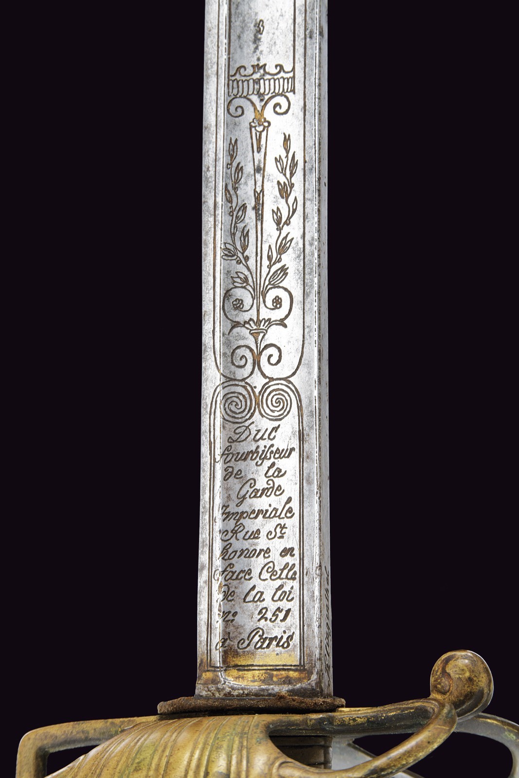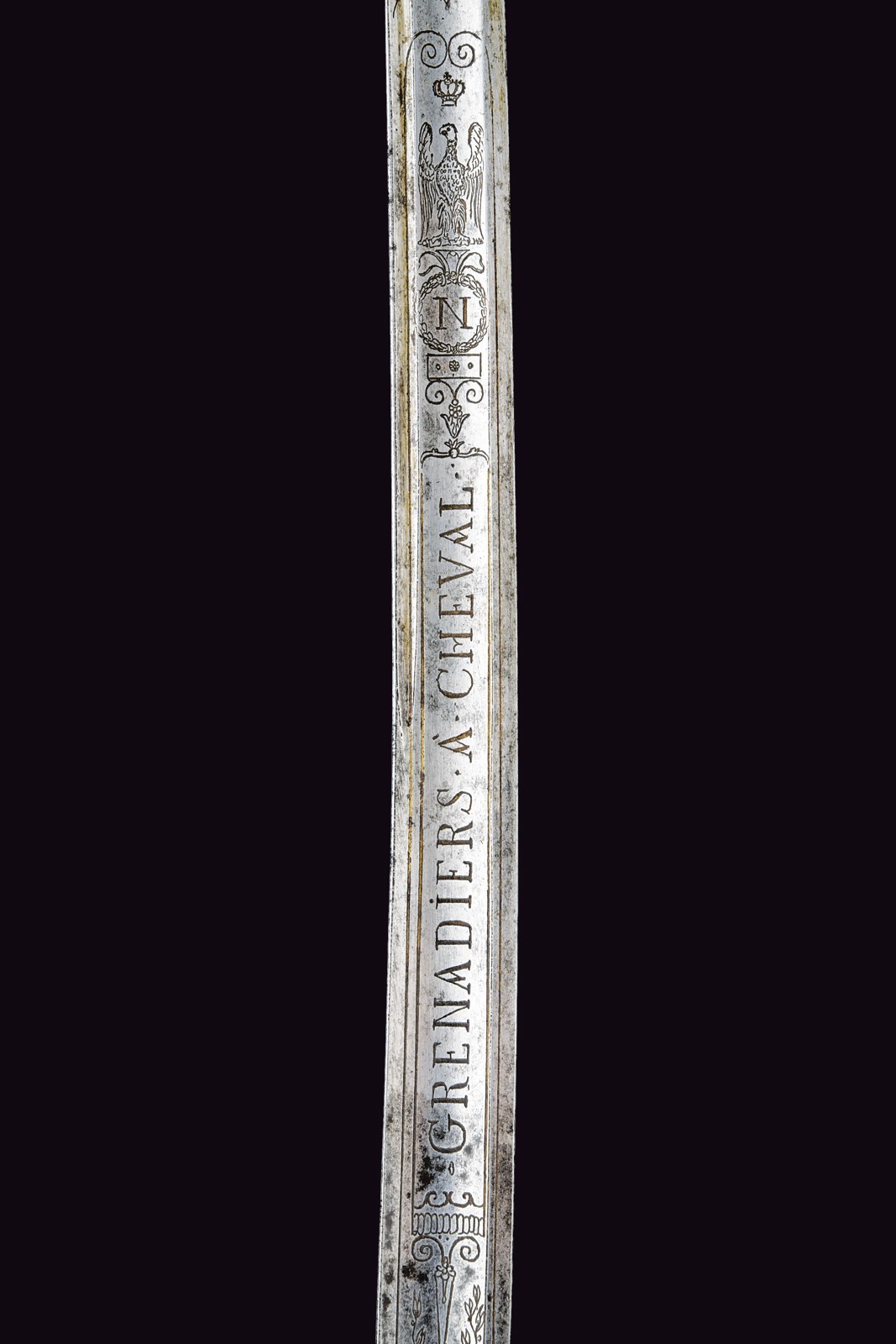 Lama curva a un filo e breve controfilo, sgusciata e con scanalatura accanto al dorso nel segmento centrale. In punta lievi intaccature. Il dorso marcato "Klingenthal". La prima metà incisa sul lato di terza con l'iscrizione "GRENADIERS A CHEVAL" entro un cartiglio sormontato dalla "N" posta entro un serto il quale è a sua volta soprastato dall'aquila imperiale francese coronata. In basso un trofeo d'armi e decorazioni floreali. Sul lato di quarta "GARDE IMPERIALE", lo stesso fregio napoleonico e, alla base l'iscrizione "Duc Fourbisseur de la Garde Imperiale / Rue St. Honore en face Celle de la Loi No. 251 a Paris". Tracce di doratura. Fornimento in bronzo a "garde de bataille" (leggermente traballante) in patina antica. Cappetta corta liscia di sezione ottagonale. Impugnatura in ebano senza trecciola, con lievi mancanze. Resti del fodero antico in cuoio con evidenti segni d'uso e del tempo. Presenti ancora cappa e fascetta a due campanelle, con patina coeva all'elso.