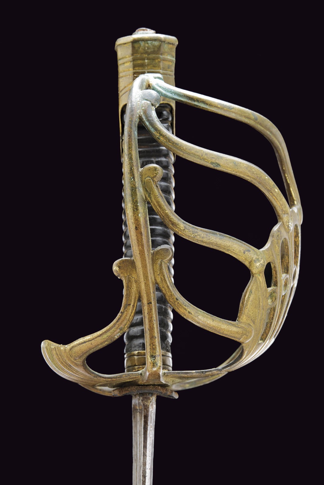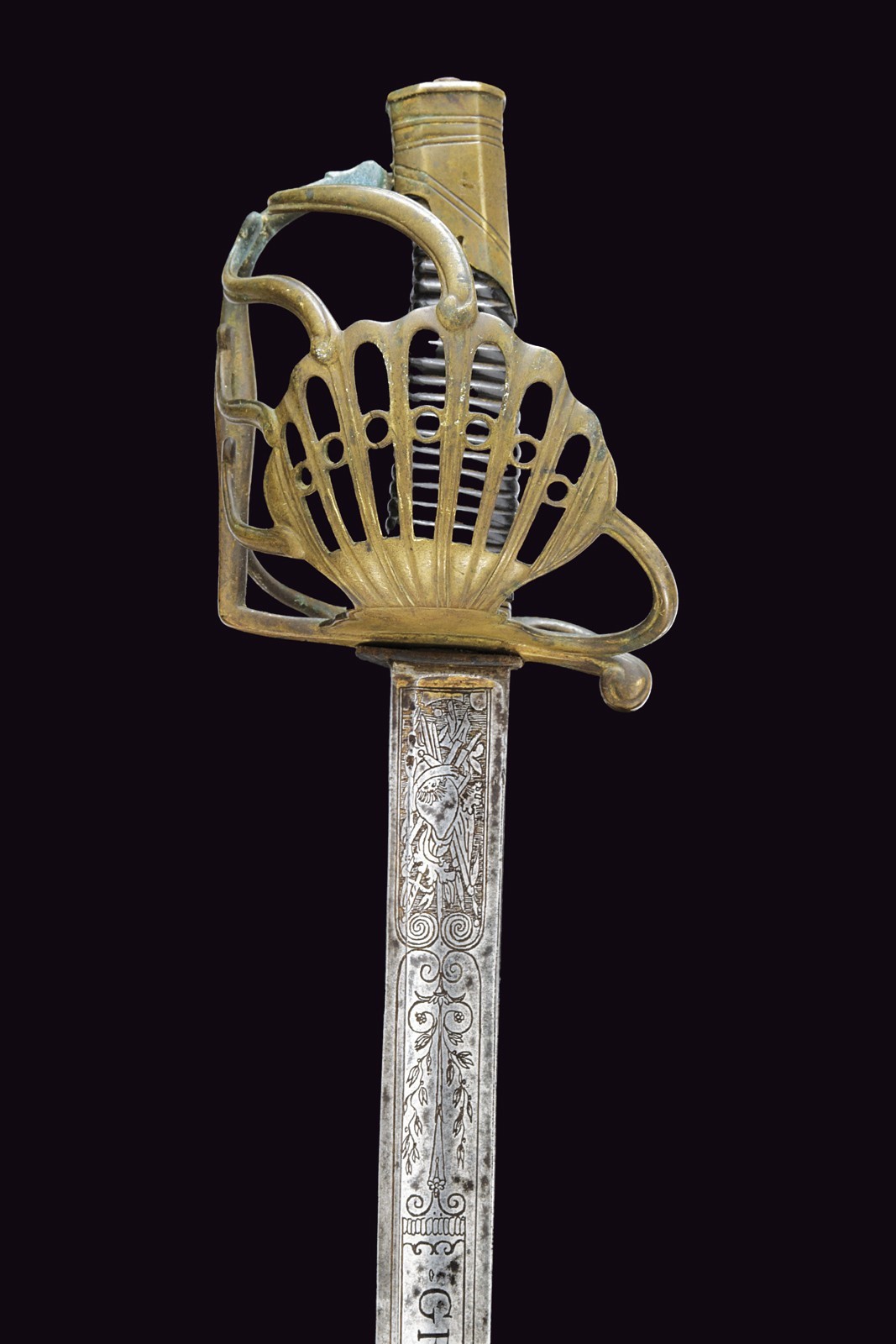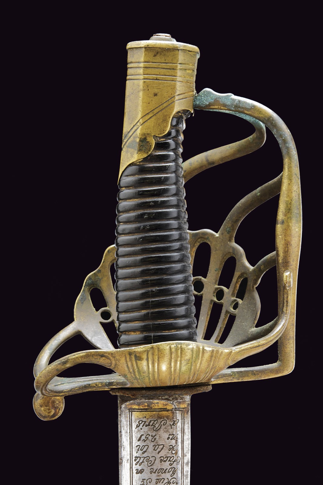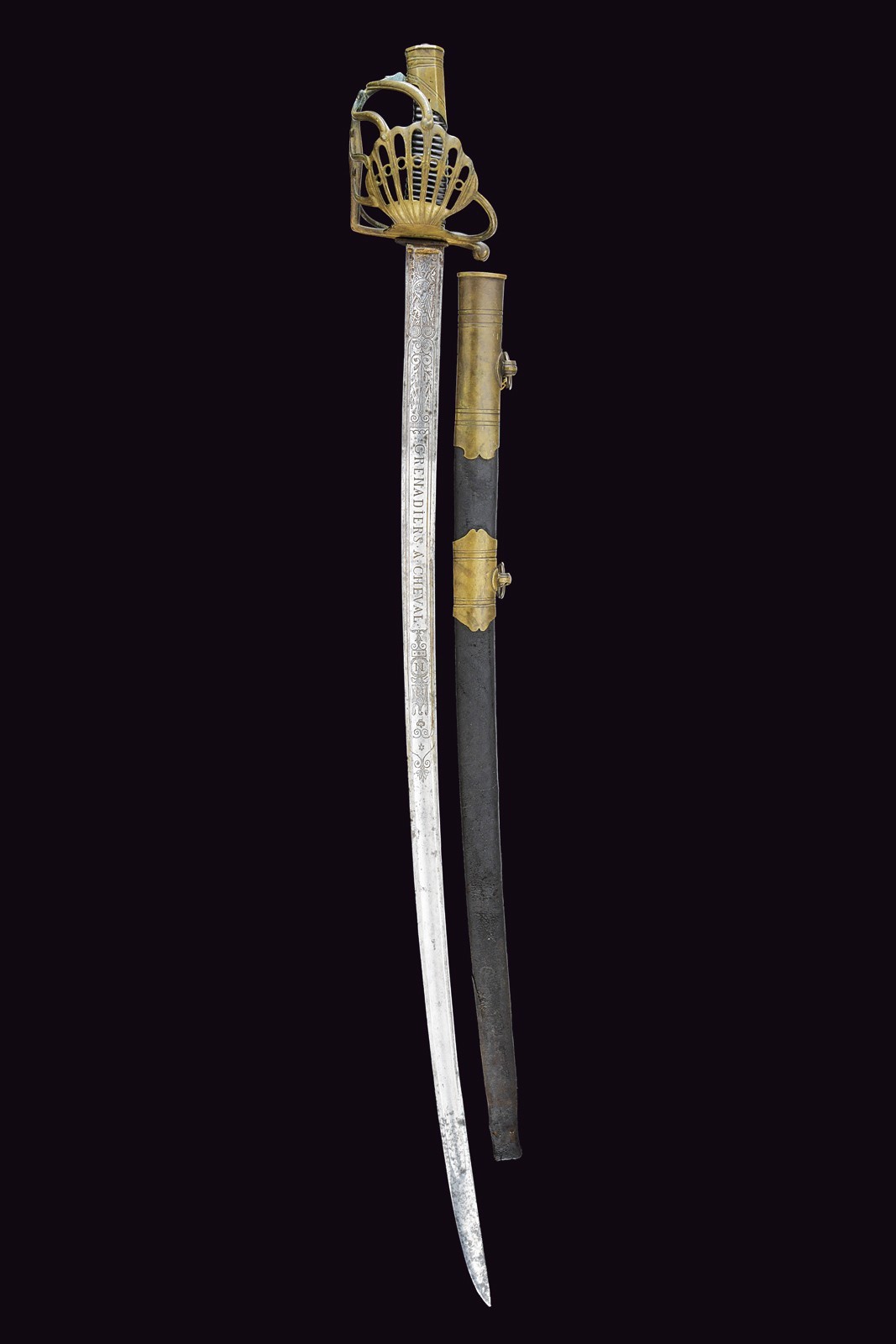 Lama curva a un filo e breve controfilo, sgusciata e con scanalatura accanto al dorso nel segmento centrale. In punta lievi intaccature. Il dorso marcato "Klingenthal". La prima metà incisa sul lato di terza con l'iscrizione "GRENADIERS A CHEVAL" entro un cartiglio sormontato dalla "N" posta entro un serto il quale è a sua volta soprastato dall'aquila imperiale francese coronata. In basso un trofeo d'armi e decorazioni floreali. Sul lato di quarta "GARDE IMPERIALE", lo stesso fregio napoleonico e, alla base l'iscrizione "Duc Fourbisseur de la Garde Imperiale / Rue St. Honore en face Celle de la Loi No. 251 a Paris". Tracce di doratura. Fornimento in bronzo a "garde de bataille" (leggermente traballante) in patina antica. Cappetta corta liscia di sezione ottagonale. Impugnatura in ebano senza trecciola, con lievi mancanze. Resti del fodero antico in cuoio con evidenti segni d'uso e del tempo. Presenti ancora cappa e fascetta a due campanelle, con patina coeva all'elso.