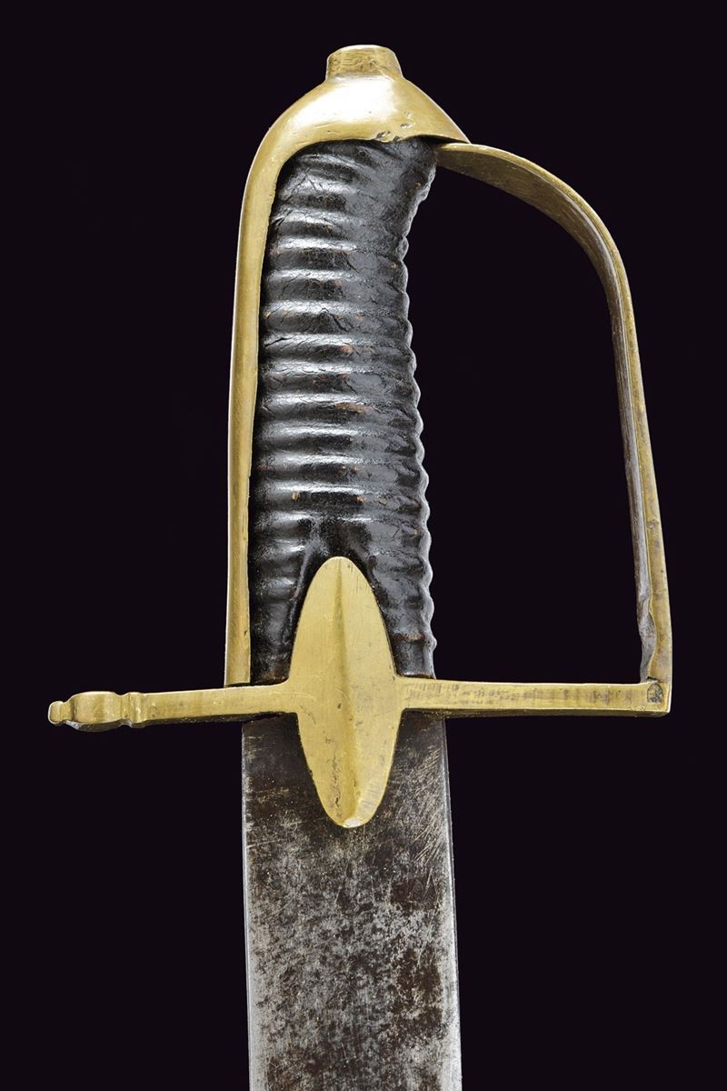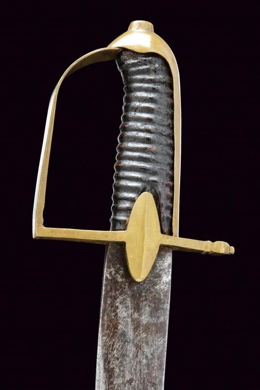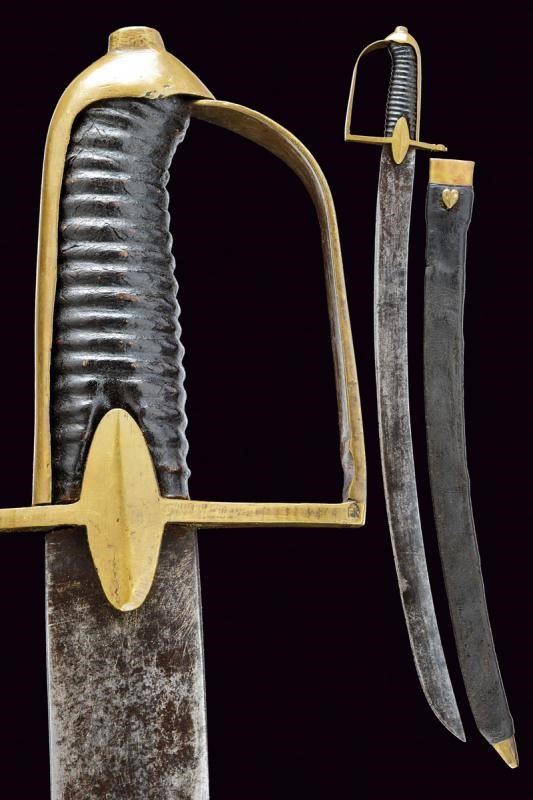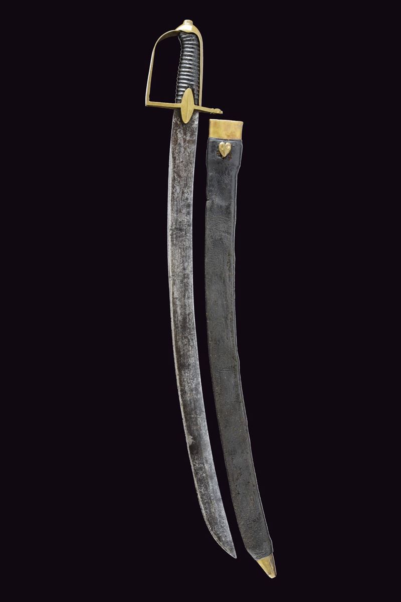 Larga lama piatta, lievemente curva, a un filo e con controfilo. Fornimenti in ottone con alette fermafodero e un ramo di guardia, cappetta lunga liscia, impugnatura in legno rivestita in cuoio priva di trecciola. Fodero in cuoio con fornimenti in ottone, la cappa con bottone a forma di cuore.