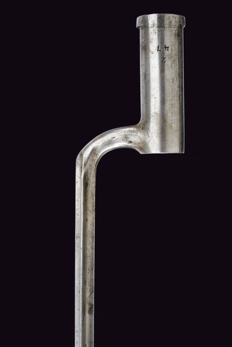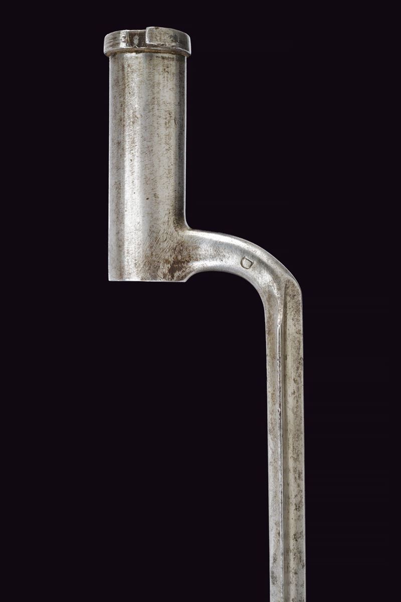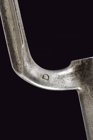 La sciabola con lama piatta, curva, a un filo, fornimento in ferro con un ramo di guardia e cappetta lunga liscia, impugnatura in legno rivestita di cuoio priva di trecciola. Fodero in cuoio con fornimenti e bottone a forma di cuore in ferro. Baionetta a ghiera con lama di sezione cruciforme, collo marcato "D", completa di fodero in cuoio con fornimenti e gancio in ferro. Entrambi insieme in una tracolla in cuoio bianco.