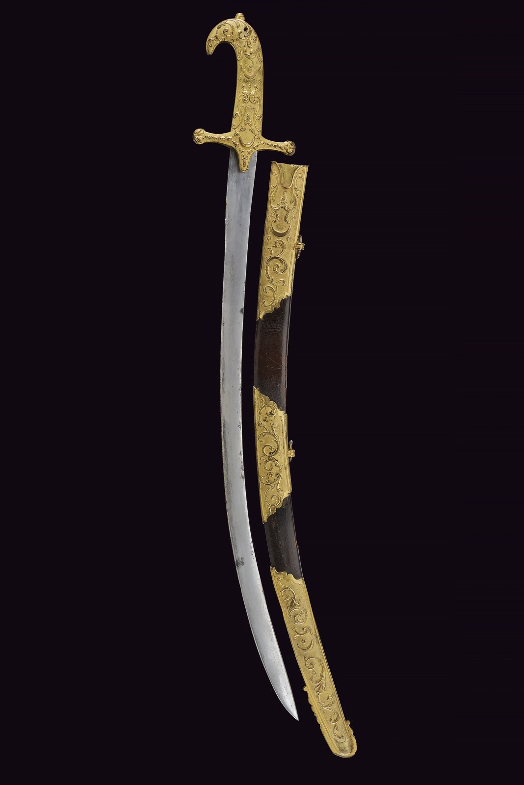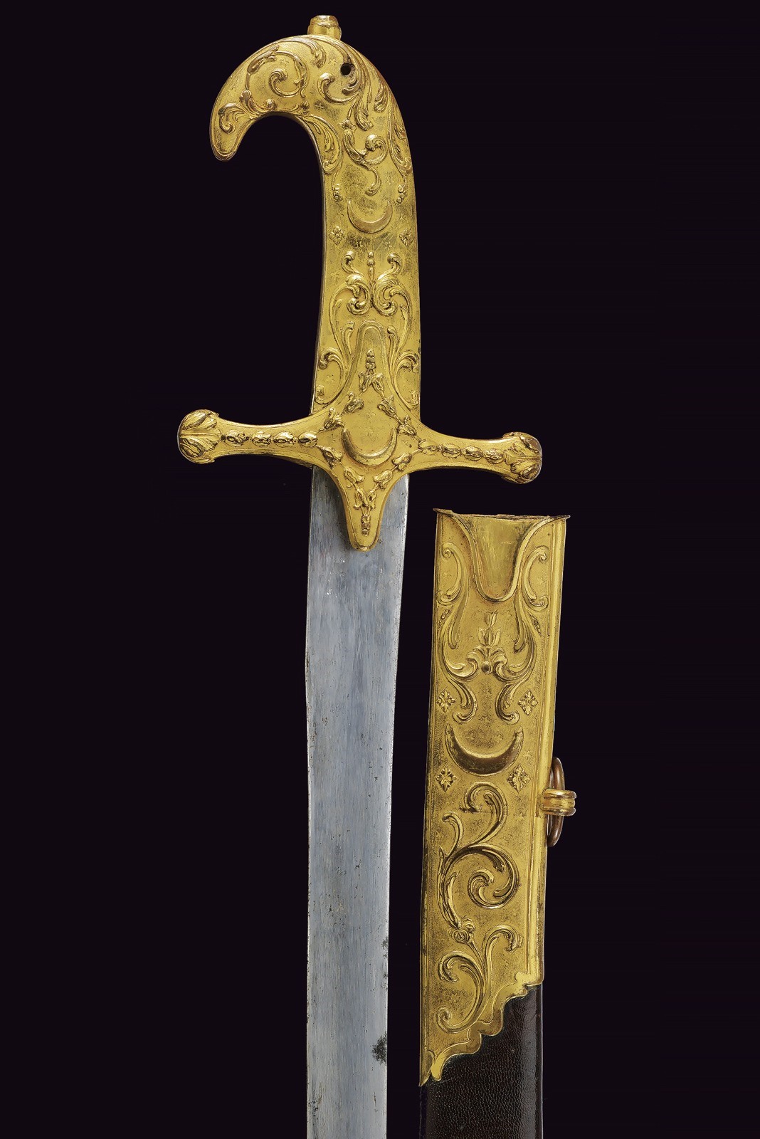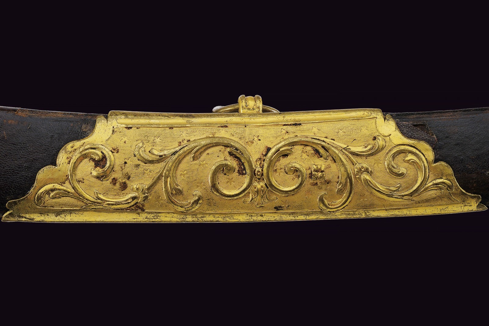 Lama curva a un filo e breve controfilo, di sezione triangolare a facce piane. Lievi intaccature e segni di pulizia. Elegante fornimento in bronzo decorato in rilievo con buona parte della vecchia doratura ancora presente. L'elso a croce con brevi alette fermafodero, decorato in rilievo sia alla testa dei bracci che sulla superficie con fiorami, il resto della superficie a granuli appena accennati e stelle incise. L'impugnatura sempre decorata con fiorami in rilievo, disposti a volute. Una sforatura praticata accanto al dorso. L'impugnatura culmina in una forma appuntita e fortemente curvata verso il basso. Al dorso il bottone, non dorato. Con il suo fodero, in legno, rivestito di cuoio ben conservato (antico?); i fornimenti en suite con la sciabola, nella stessa pregevole fattura, a tre lunghe bande dorate e lavorate a fiorami che formano volute. Due campanelle sempre in bronzo.