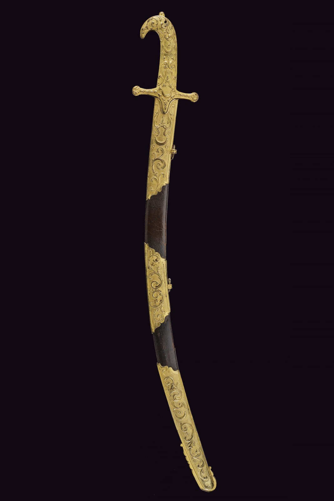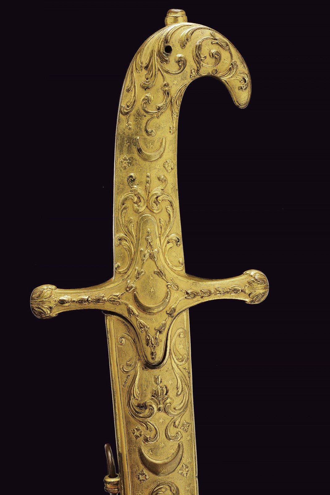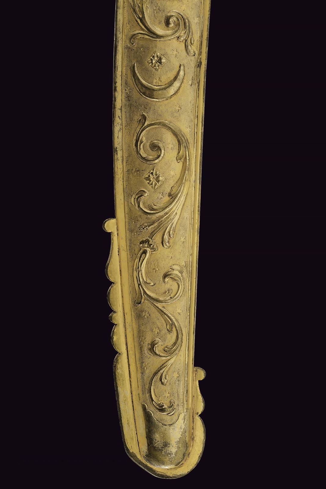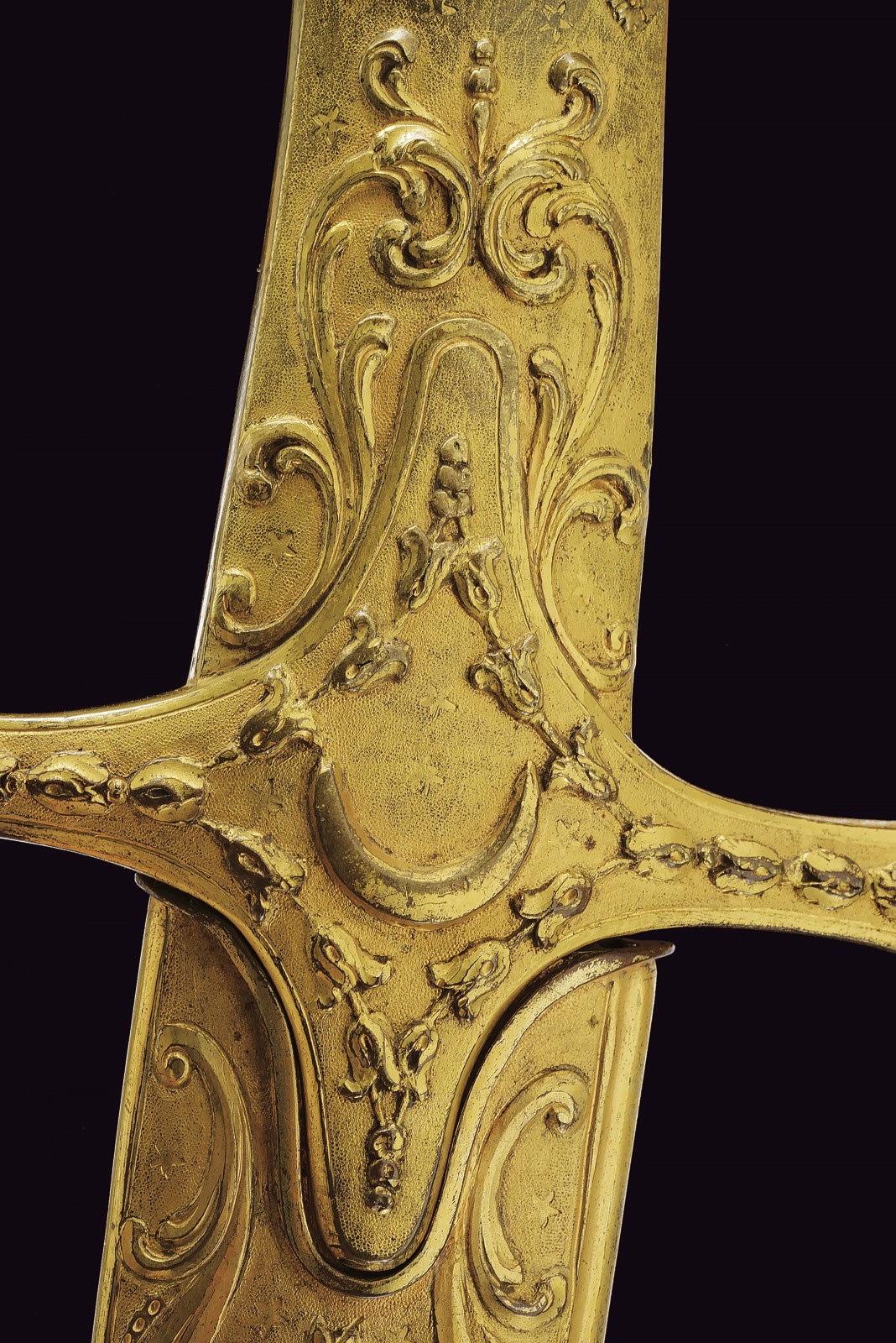 Lama curva a un filo e breve controfilo, di sezione triangolare a facce piane. Lievi intaccature e segni di pulizia. Elegante fornimento in bronzo decorato in rilievo con buona parte della vecchia doratura ancora presente. L'elso a croce con brevi alette fermafodero, decorato in rilievo sia alla testa dei bracci che sulla superficie con fiorami, il resto della superficie a granuli appena accennati e stelle incise. L'impugnatura sempre decorata con fiorami in rilievo, disposti a volute. Una sforatura praticata accanto al dorso. L'impugnatura culmina in una forma appuntita e fortemente curvata verso il basso. Al dorso il bottone, non dorato. Con il suo fodero, in legno, rivestito di cuoio ben conservato (antico?); i fornimenti en suite con la sciabola, nella stessa pregevole fattura, a tre lunghe bande dorate e lavorate a fiorami che formano volute. Due campanelle sempre in bronzo.