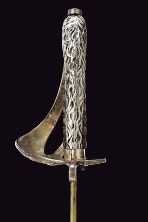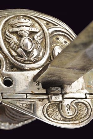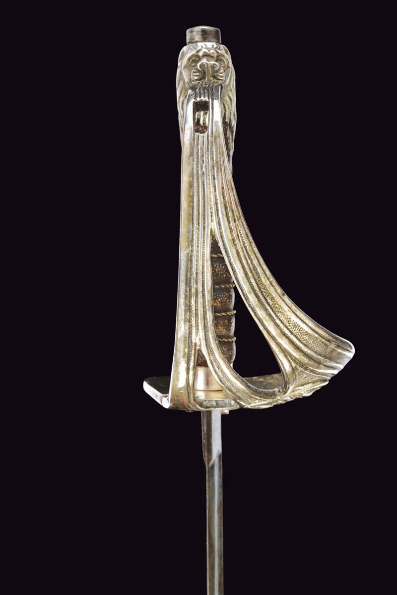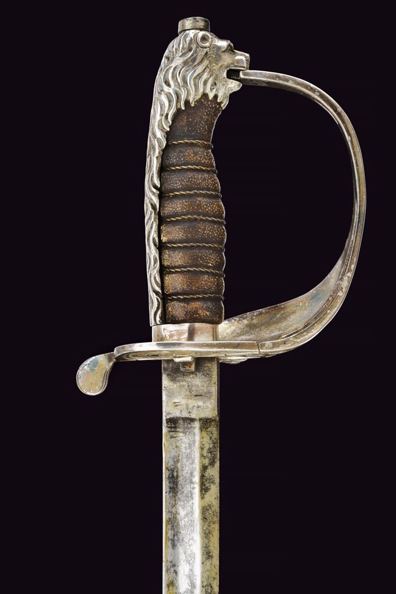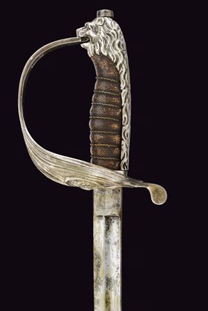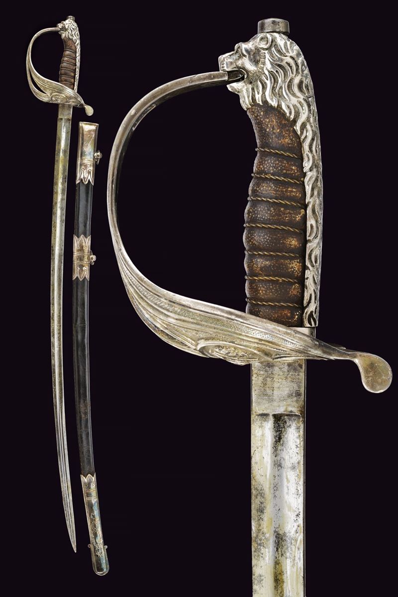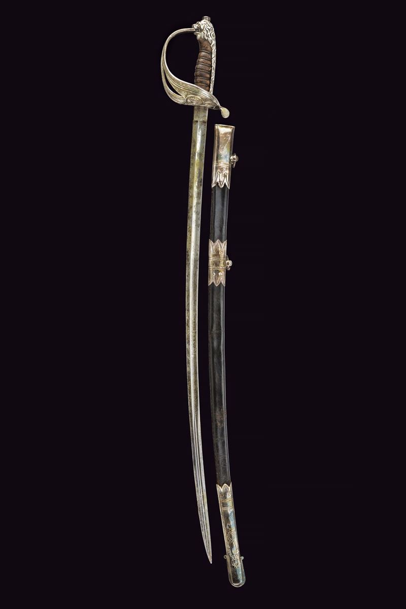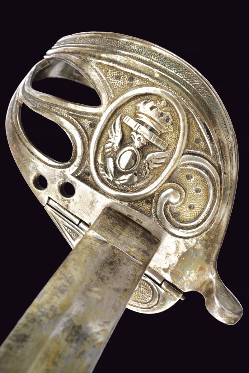 Lama curva con sguscio che si fa duplice al debole. La superficie con resti di incisioni. Fornimento leggermente da fissare, con bella guardia a vela in ottone placcato argento marcato "9", recante scudo ellittico caricato con l'aquila sabauda sormontata da corona, il tutto in rilievo. Due spacchi a goccia e sforatura per la dragona. Sul retro una piccola valva tornante, sempre placcata in argento e punzonata "9". Cappetta lunga in ottone placcato argento culminante a testa di leone. Rivestimento dell'impugnatura in pelle di pesce, brunita probabilmente dall'uso e dal tempo, con trecciola metallica. Fodero in cuoio di vecchia produzione con fornimenti argentati, il puntale forse con piccolo punzone alla vela. Due campanelle, sempre in argento. La valva tornate spinge, se richiusa, spinge un dente d'arresto che ferma il fodero alla spada. Condizioni medio-buone, con un po' di usura alla lama e segni del tempo. Rara variante da ufficiale della Regia Marina realizzata in argento.