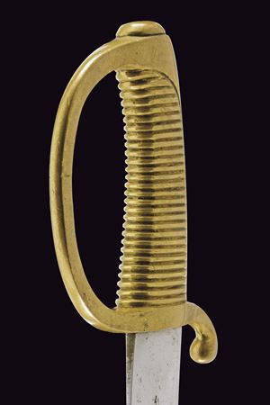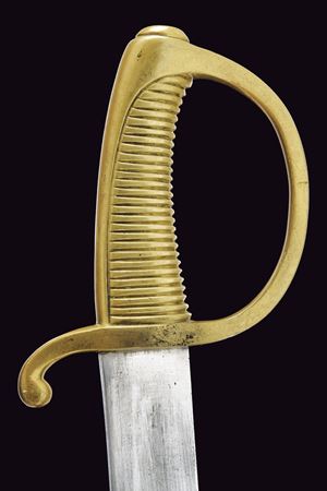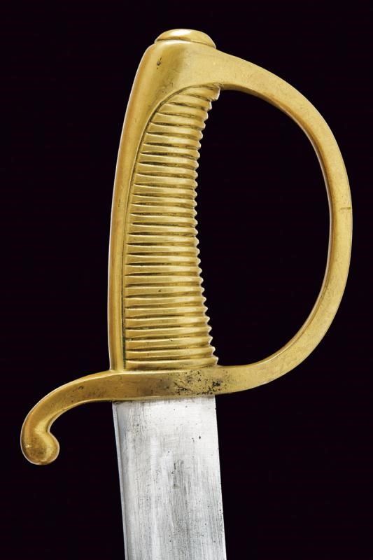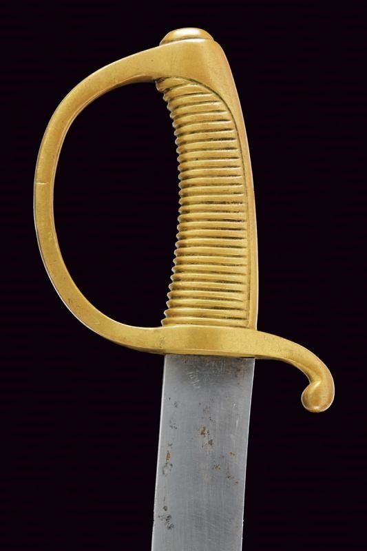 Larga lama piatta, curva, a un filo e con breve controfilo. Fornimento monoelso in ottone massiccio. Fodero in cuoio con fornimenti in ottone e taschetta in cuoio.