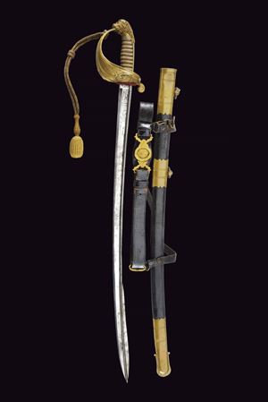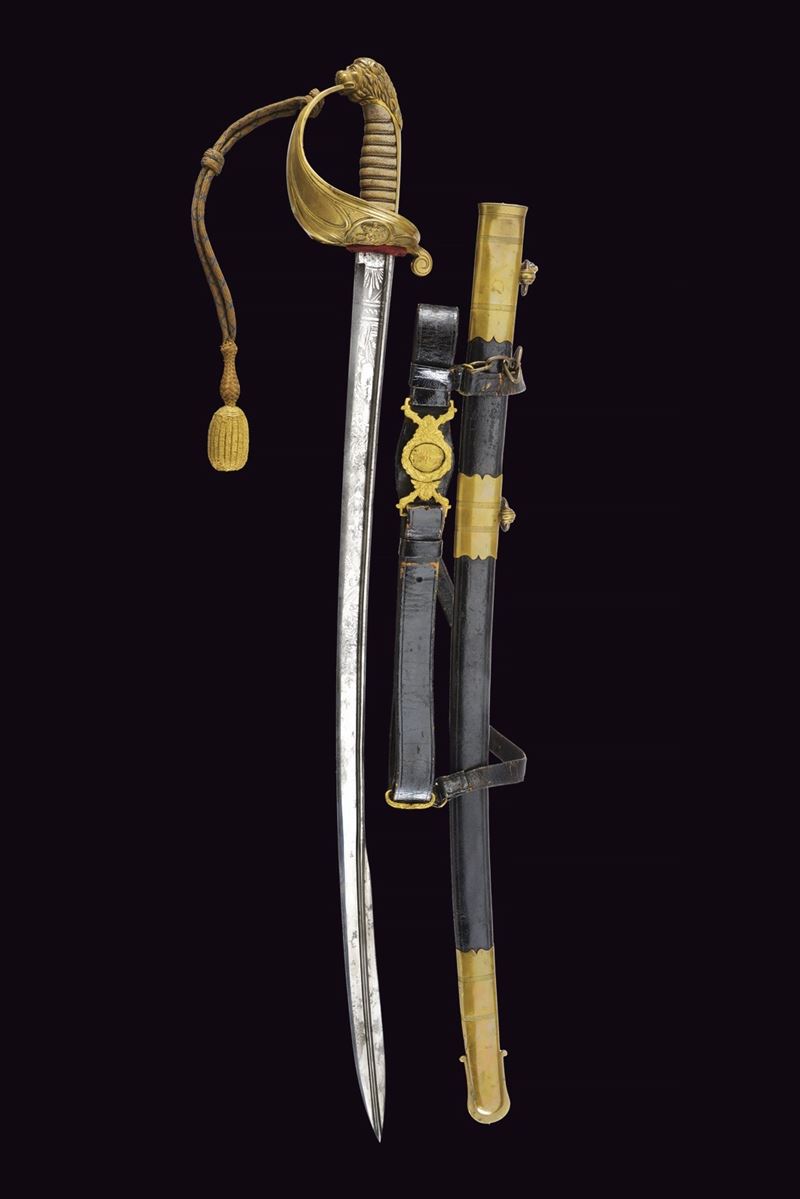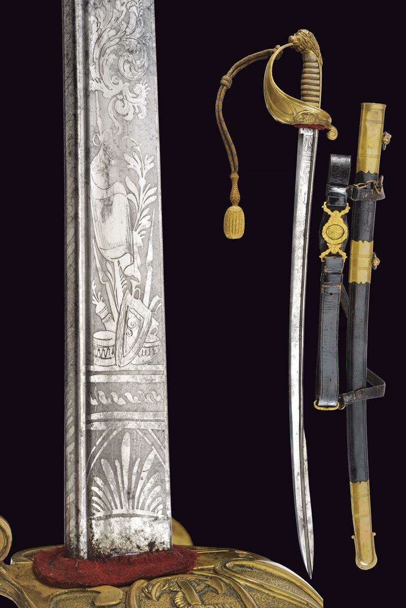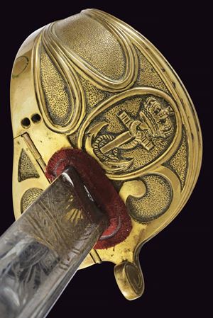 Lama leggermente curva a un filo e mezzo, con dorso a bacchetta che corre sino alla punta. La superficie incisa per metà, recante su entrambe le facce fiorami e trofei; sul lato di terza anche l'àncora, su quello di quarta lo scudo sabaudo coronato. Il dorso inciso a foglie. Fornimento in ottone con resti di doratura, con guardia a vela ornata a puntini e caricata con scudo recante l'àncora coronata in rilievo. Sul retro una valva tornante. Impugnatura rivestita in manica di pelle di pesce e con avvolgimento di trecciola e filo di rame. Cappetta lunga culminante in bellissima testa di leone. Fodero in cuoio di vecchia produzione, con fornimenti in ottone. Due campanelle. Dotata di un cinturone da ufficiale e di attacchi (segni d'usura al cuoio). Lievi segni d'uso e del tempo. Non comune accompagnata dal cinturone.