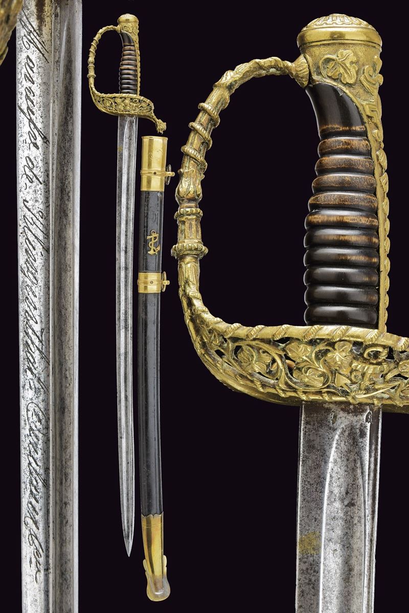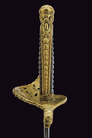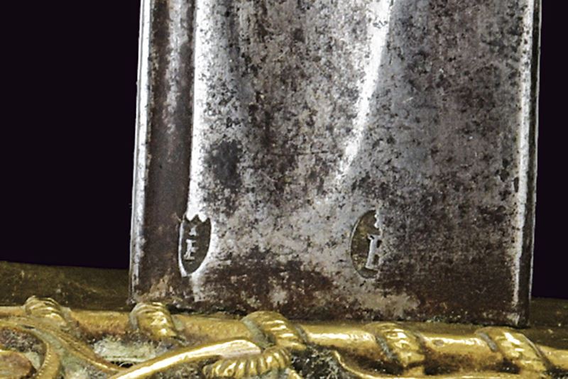 Lama curva sgusciata e scanalata, recante alla base i punzoni "E" sotto stella e "B" entrambi entro scudi. Fornimento in ottone con guardia a vela traforata recante tralci di vite e àncora. Varie decorazioni in rilievo alla codetta, lunga e ornata con conchiglie. Impugnatura in corno senza trecciola. Fodero in cuoio antico stampigliato "MANT..." (il resto non leggibile). Fornimenti in ottone, cappa con marcatura "J. MAL...AUX A PARIS" (non del tutto leggibile). Sul cuoio un fregio ad àncora in ottone, cocn piccola mancanza. Due campanelle.
