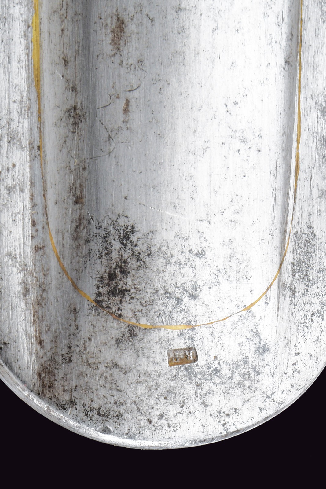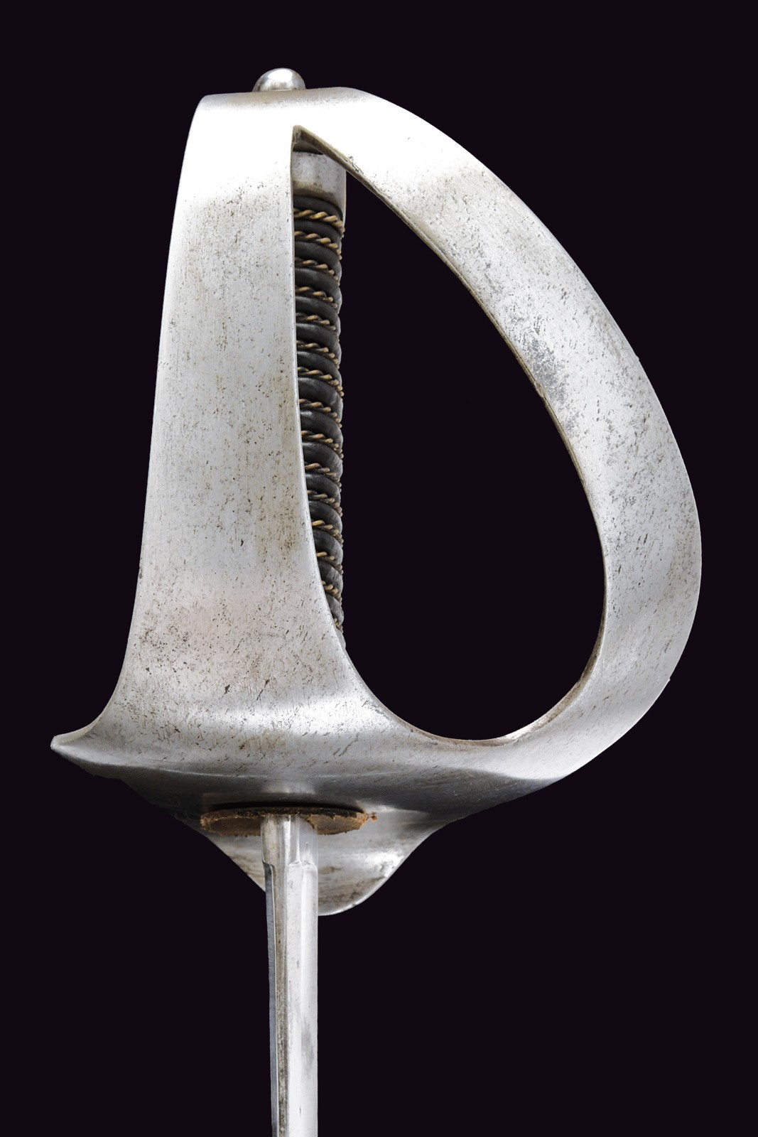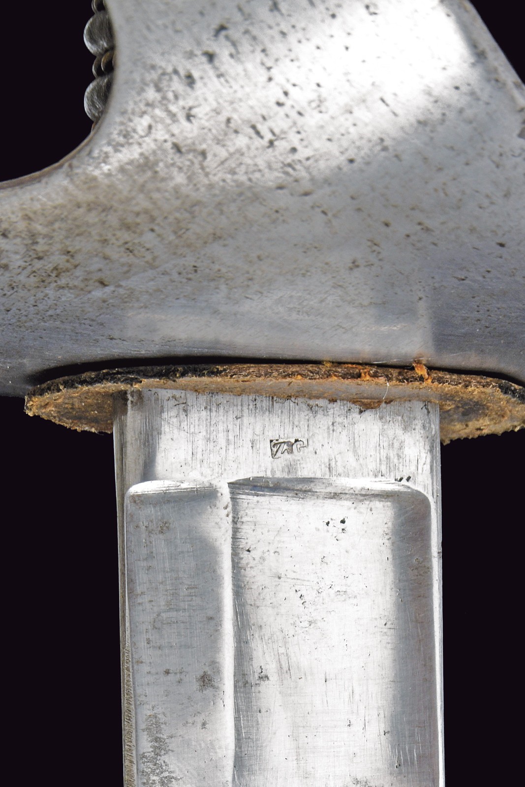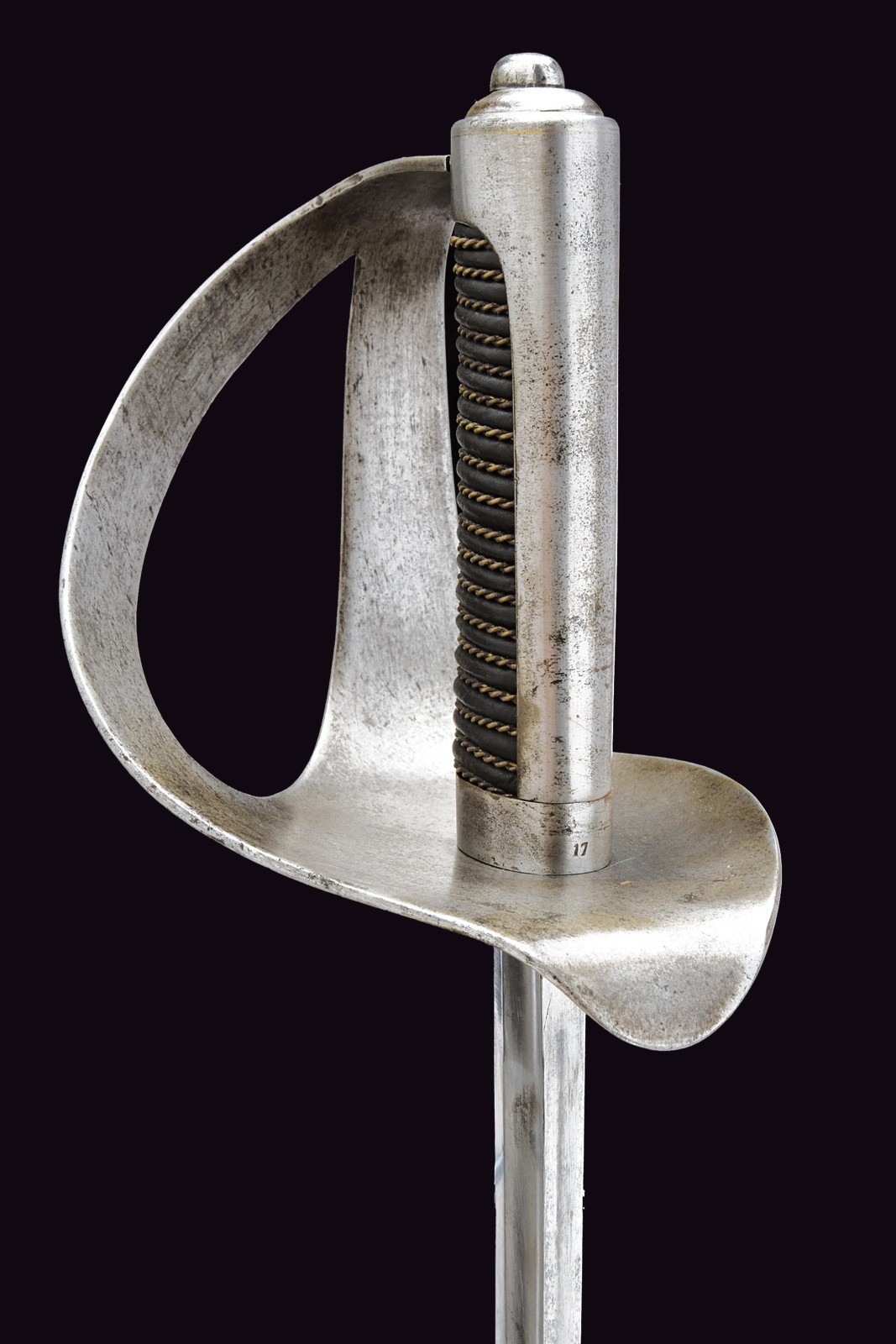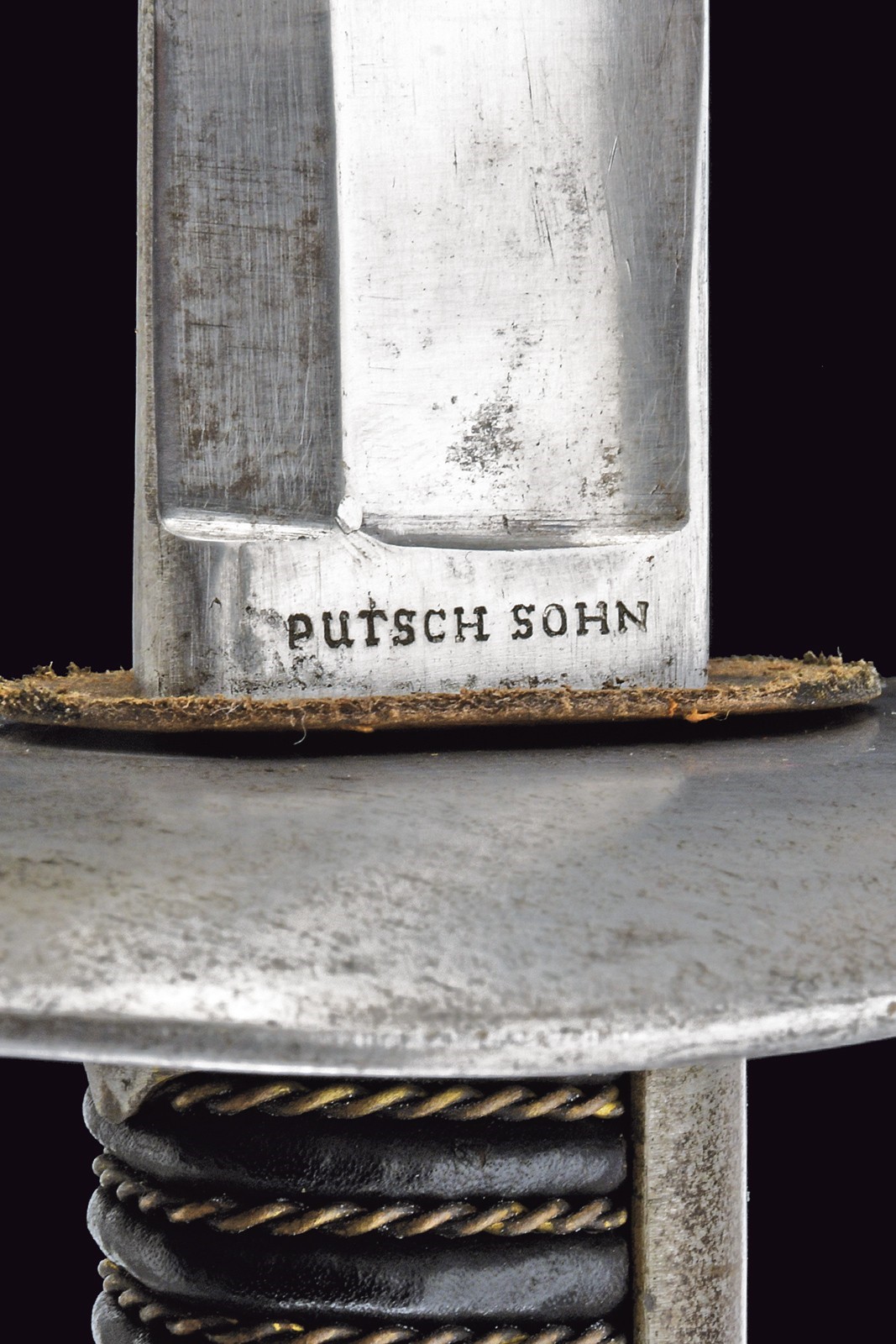 Lama leggermente curva a un filo e controfilo con ampio sguscio centrale, costolata al debole, recante marcatura "PUTSCH SOHN" e con punzone. Fornimento in ferro con grande spacco a goccia, cappetta lunga liscia dritta ed impugnatura rivestita di cuoio con trecciola in filo d'ottone. Fodero in ferro a due campanelle.