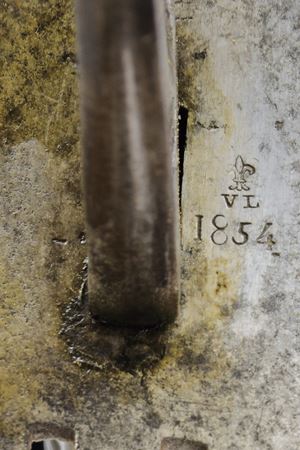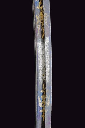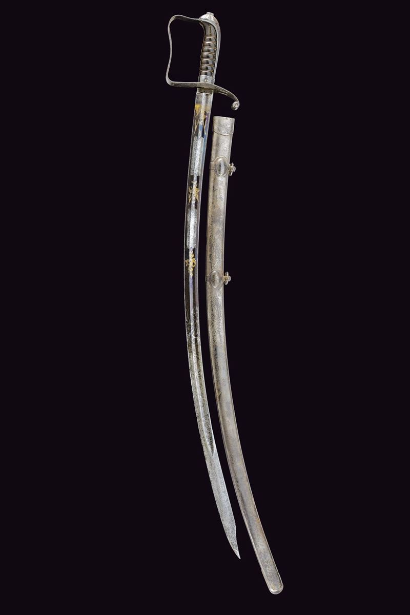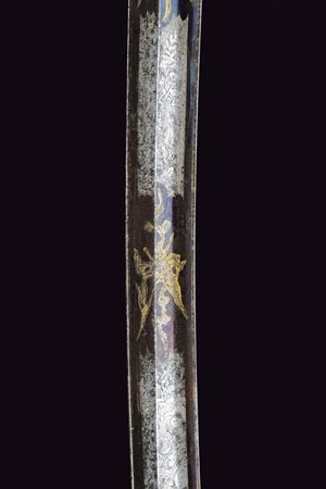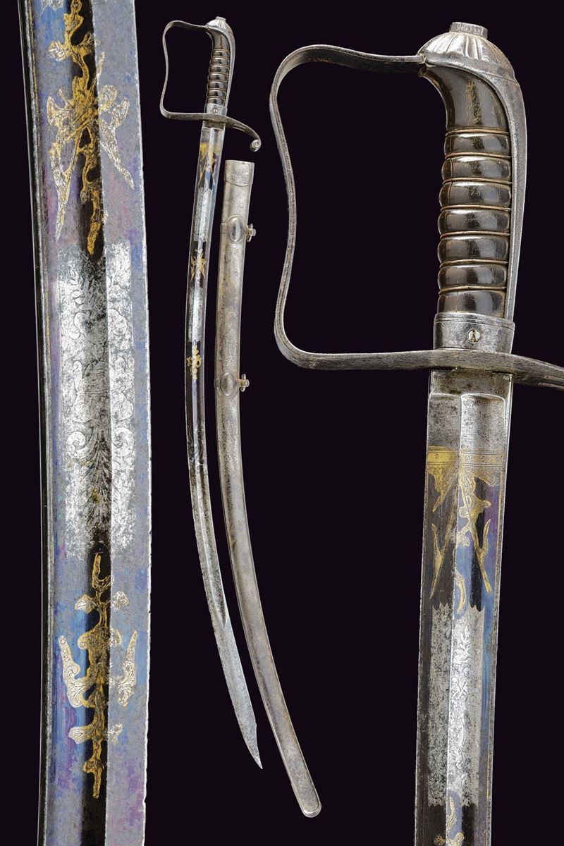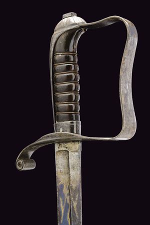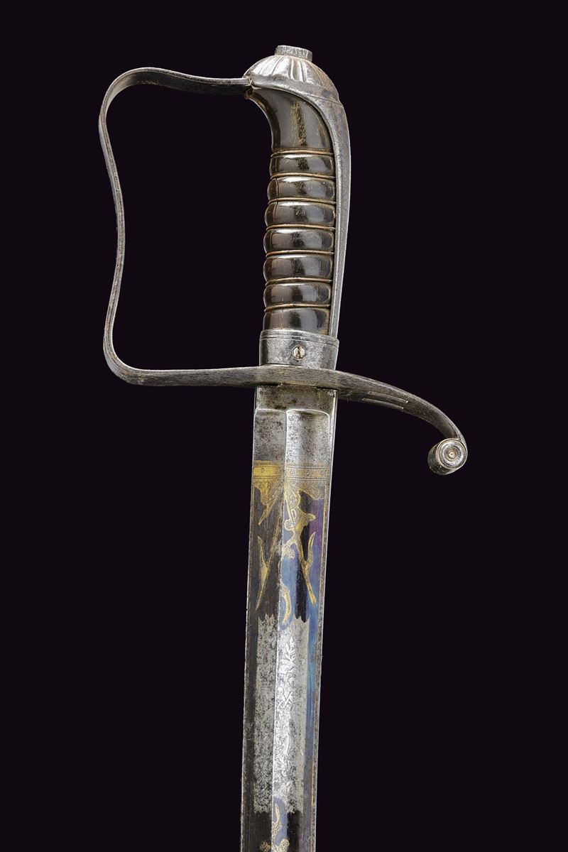 Lama curva con punta incavata al dorso, sgusciata per tre quarti e ornata su entrambe le facce per metà con brunitura azzurrata nella quale sono ricavati due cartigli al naturale finemente incisi con mascheroni, trofei e fiorami; alternati ai cartigli fregi a racemi e trofei recanti resti di doratura. Fornimento all'austriaca da fanteria con ampia guardia a staffa dotata di doppia sforatura per la dragona. Impugnatura in corno bruno con spirale di filo di rame. Cappetta lunga con cappellotto lavorato a raggi. Fodero in ferro a due campanelle. Condizioni medio-buone, intaccature soprattutto al fodero, segni d'uso. Non comune.