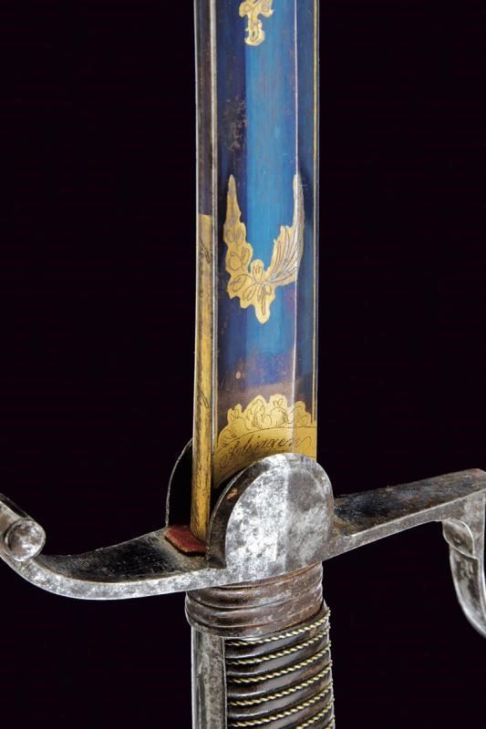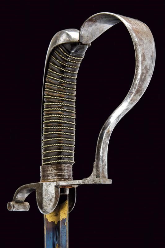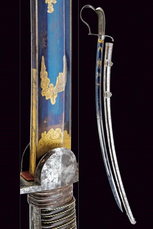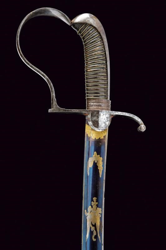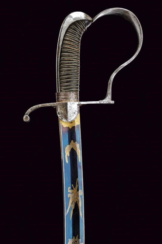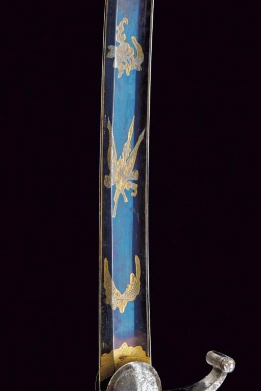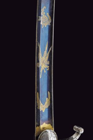 Lama curva a un filo con controfilo e ampio sguscio centrale, nella prima parte incisa e dorata su fondo blu con trofei e motivi floreali. Fornimento in ferro con alette fermafodero, un ramo di guardia, cappetta lunga faccettata e impugnatura in legno rivestita di cuoio con trecciola metallica. Fodero in ferro con due anelli di sospensione su fasce tonde bombate. Il ferro presenta zone danneggiate dalla ruggine.