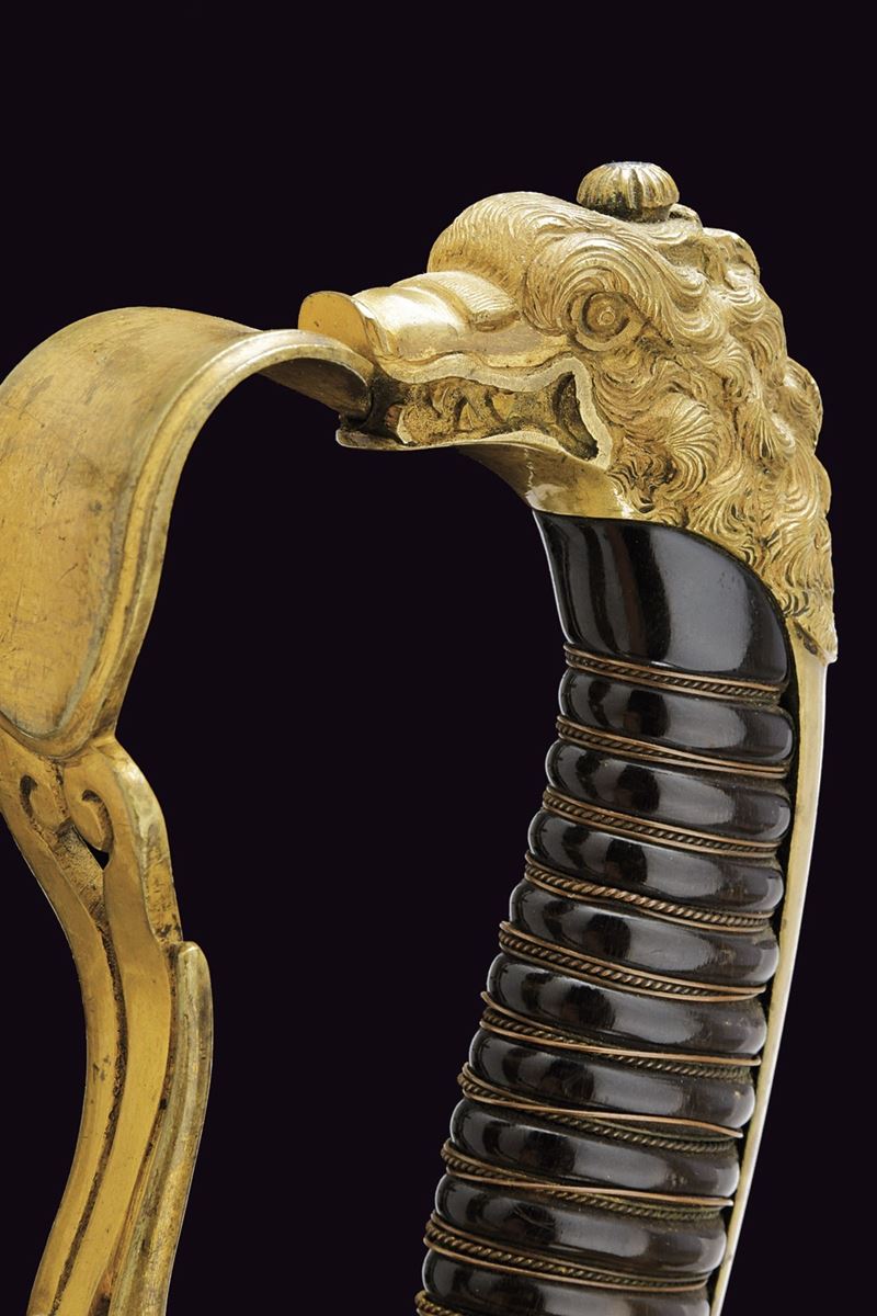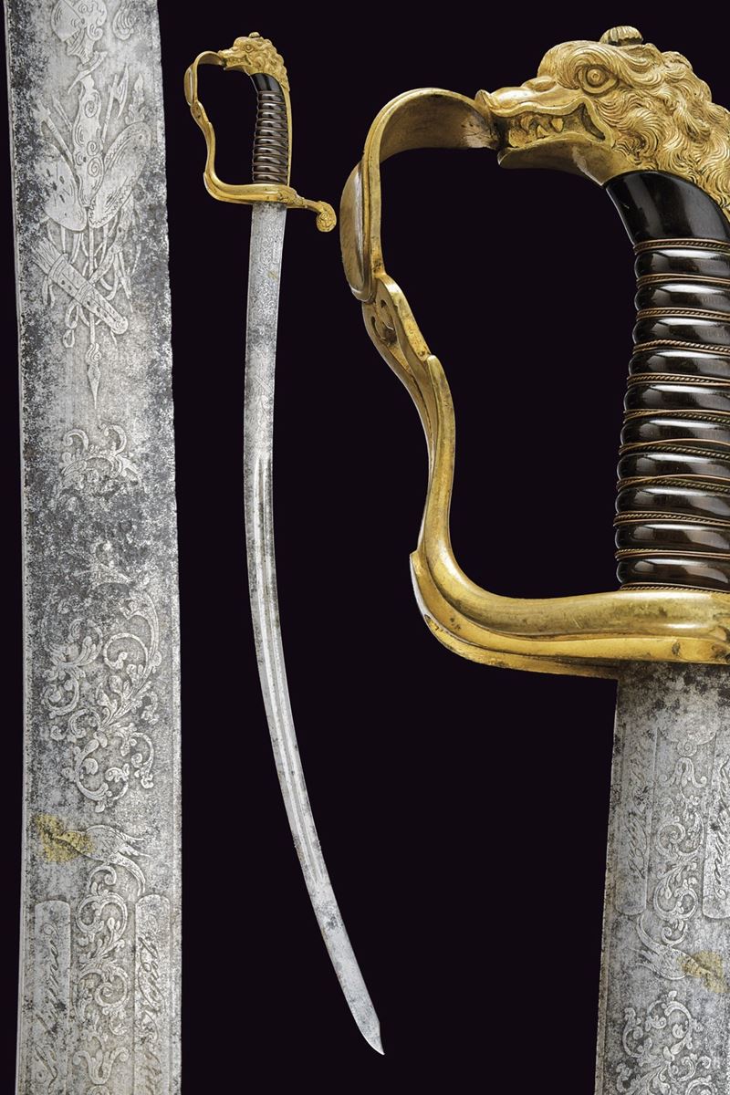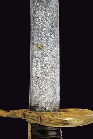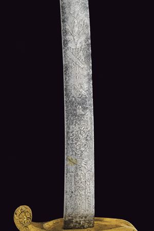 Larga lama curva a un filo e controfilo, prima piatta e finemente incisa a trofei e motivi floreali, poi con duplice sgusciatura; Il tallone firmato "Labruna 1849 Napoli".. Bel fornimento in ottone, largo ramo di guardia con piccolo ramo di parata, pomo a testa di drago ed impugnatura in corno a spire con trecciola metallica.