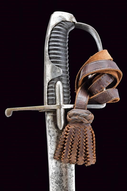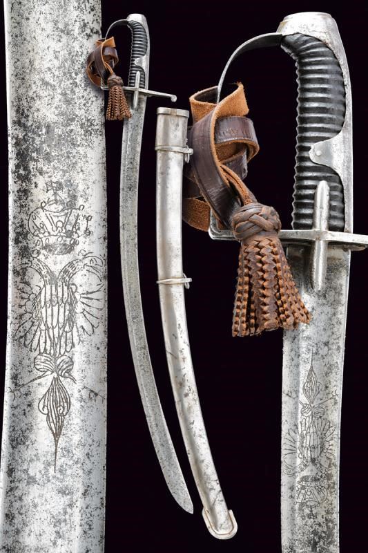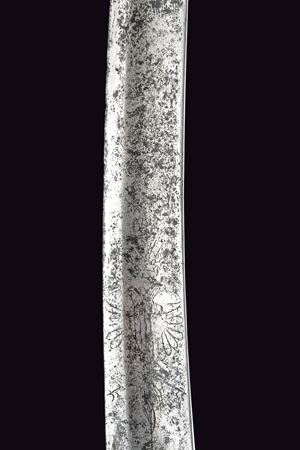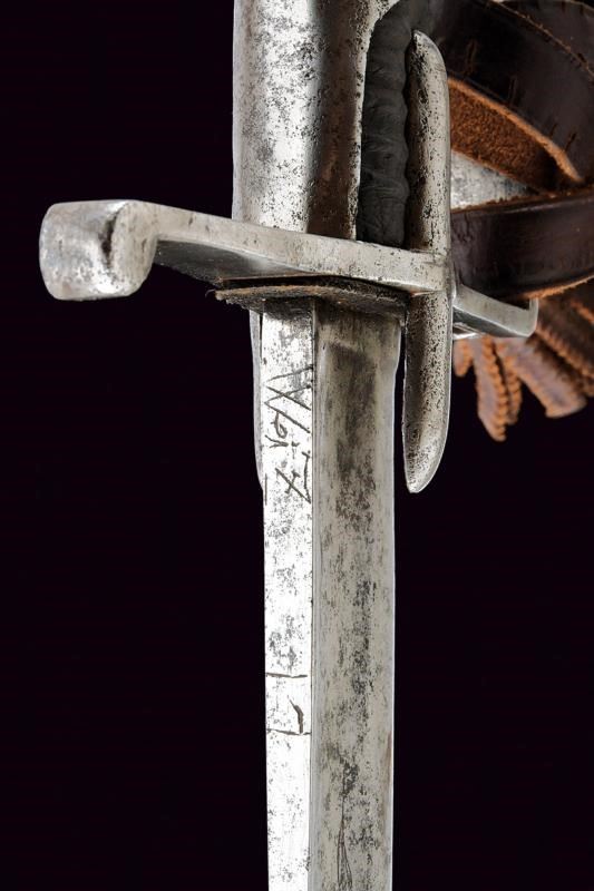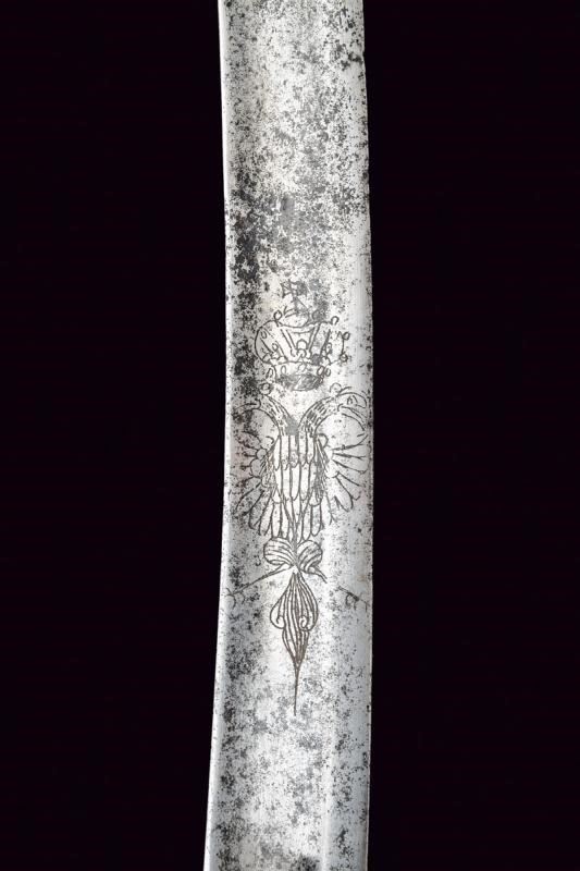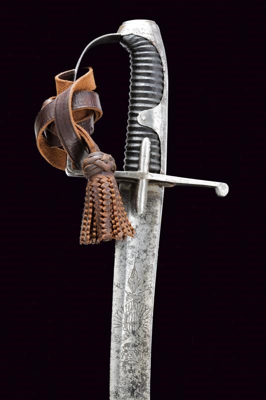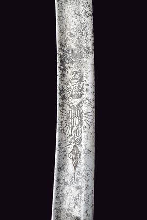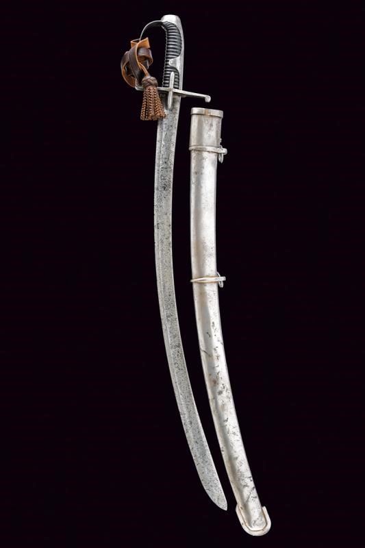 Larga lama curva a un filo e con controfilo, con ampio sguscio e tallone, la base incisa con aquila bicipite su entrambi i lati, il dorso con marcatura incompleta "WeiZ...". Fornimenti in ferro con alette fermafodero, un ramo di guardia e cappetta lunga. Impugnatura in legno rivestita in cuoio, priva di trecciola. Imponente fodero in ferro con due anelli di sospensione su fasce. Zone con danni da ruggine su sciabola e fodero, fodero con restauro nella parte superiore. Dragona in cuoio.