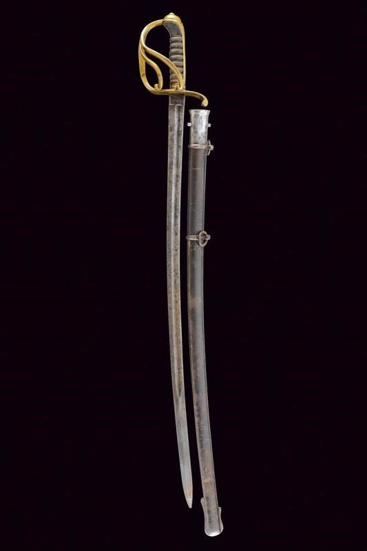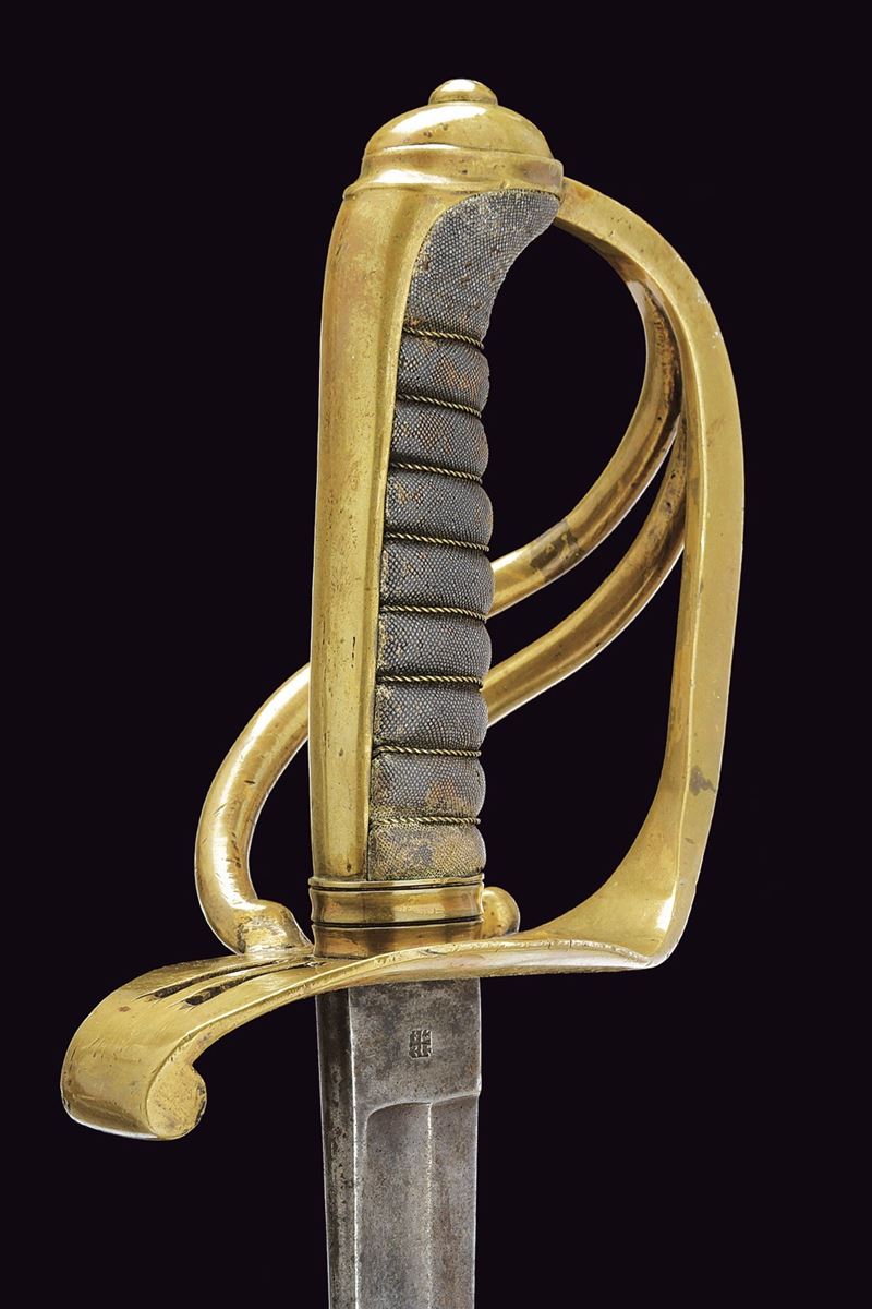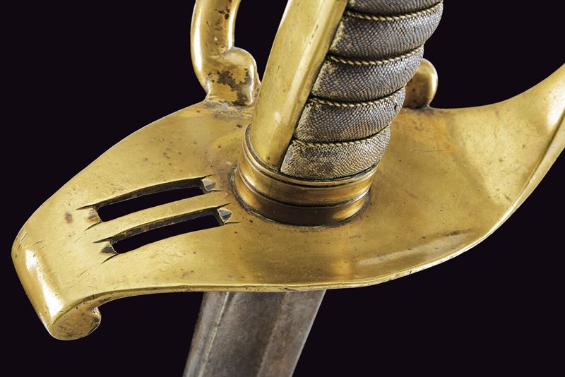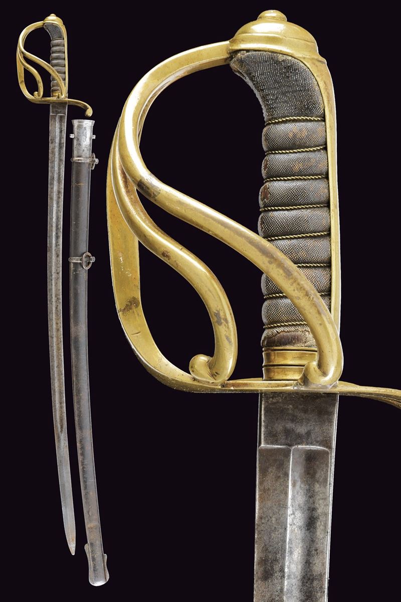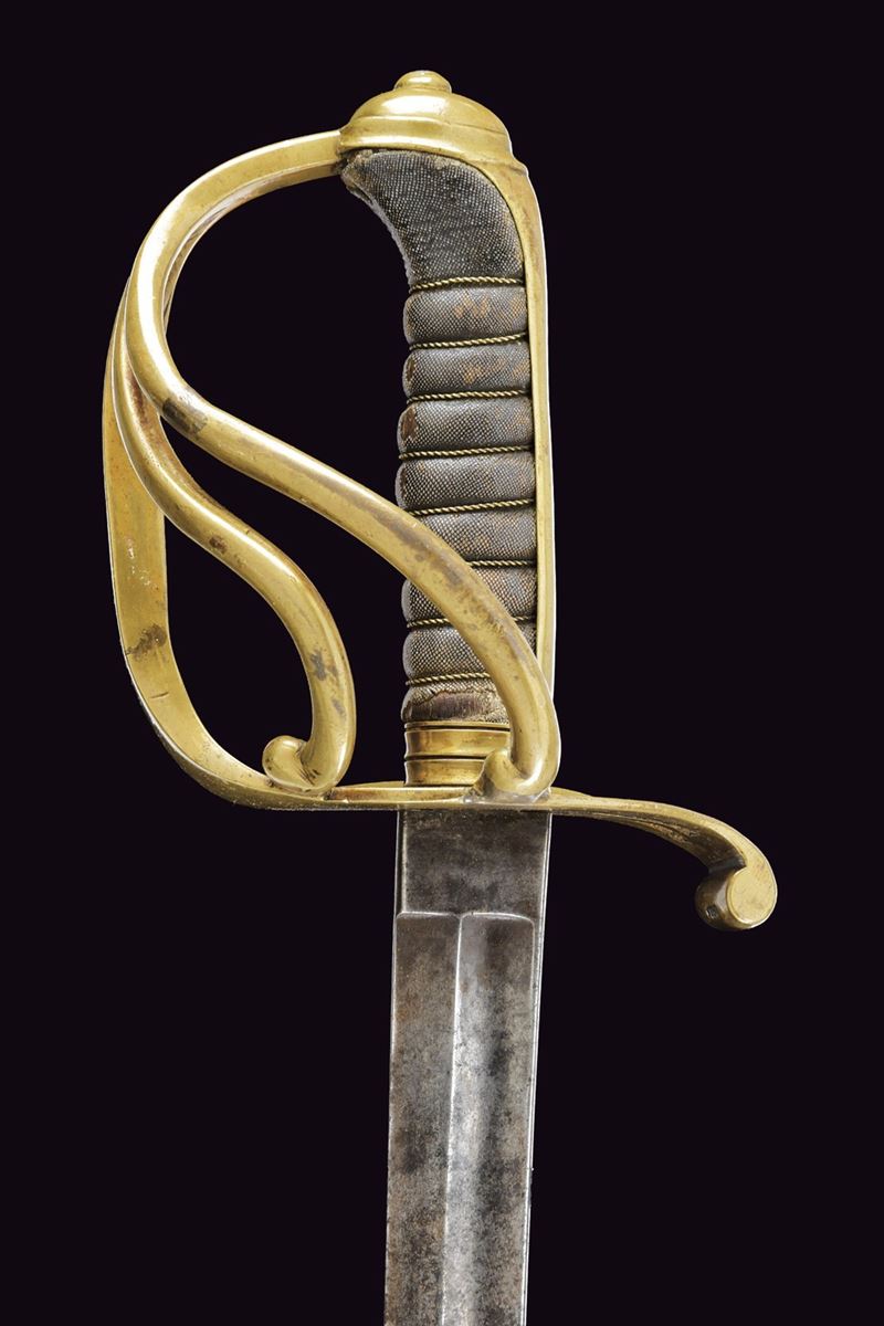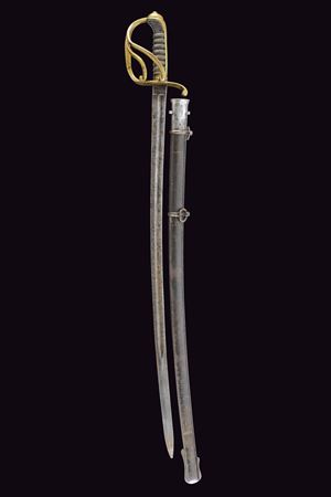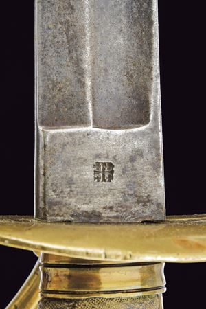 Lama curva, a un filo con controfilo, con sguscio su entrambe le facce; tallone con marca. Fornimento in ottone a tre rami di guardia e cappetta lunga liscia. Impugnatura in legno rivestita di pelle di pesce (shagreen) con trecciola metallica. Variante con fodero in ferro con due anelli di sospensione.
