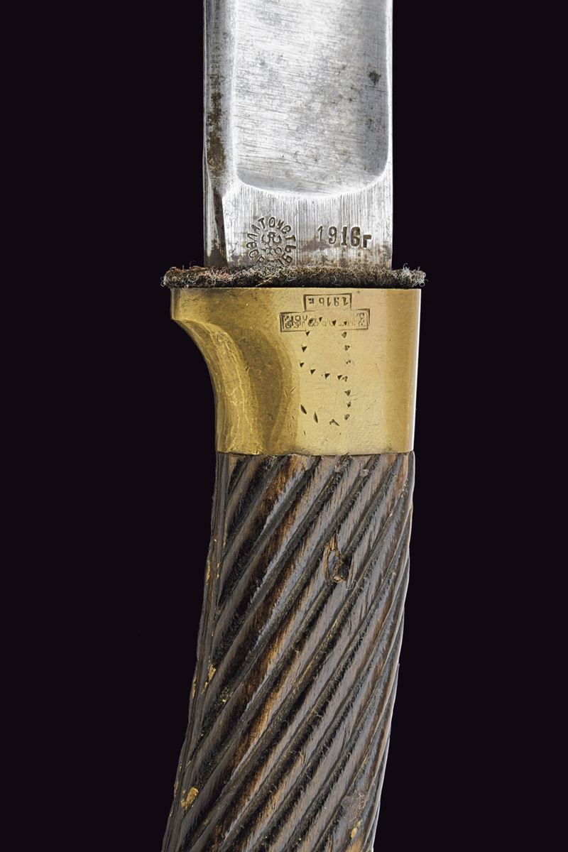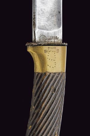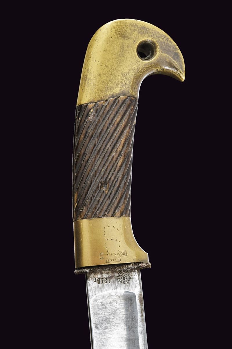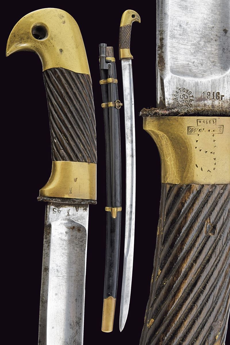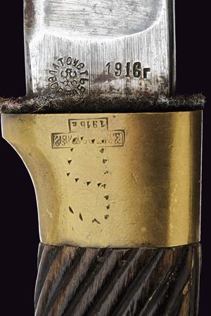 Lama curva sgusciata, sul tallone numerosi punzoni e data "1916"; fornimento in ottone con iscrizione in cirillico, punzoni e data "1916", impugnatura in legno scolpito a bande oblique. Fodero in legno rivestito di cuoio con fornimenti in ottone e baionetta. Epoca Russia Imperiale.