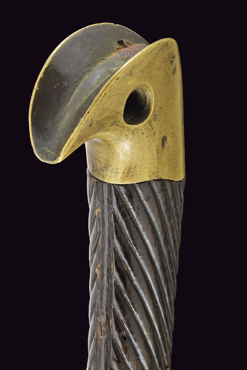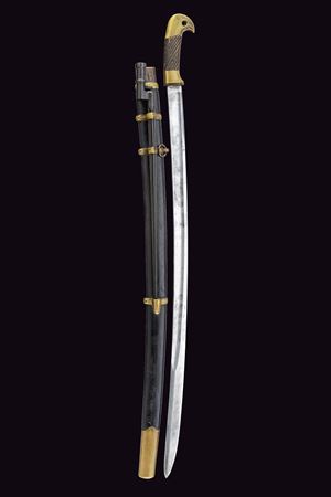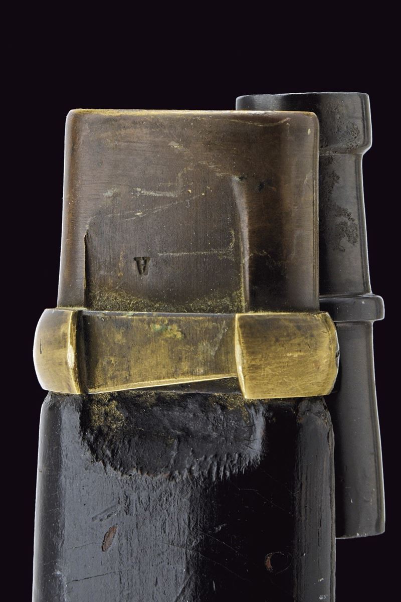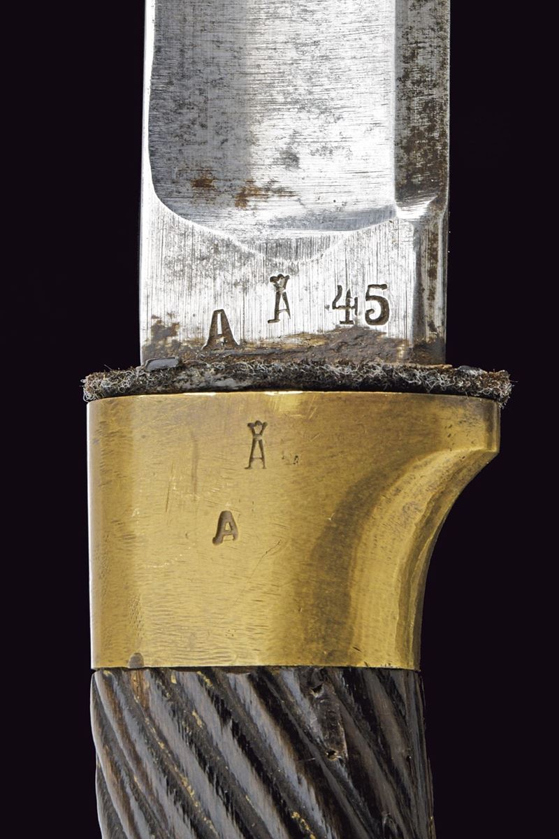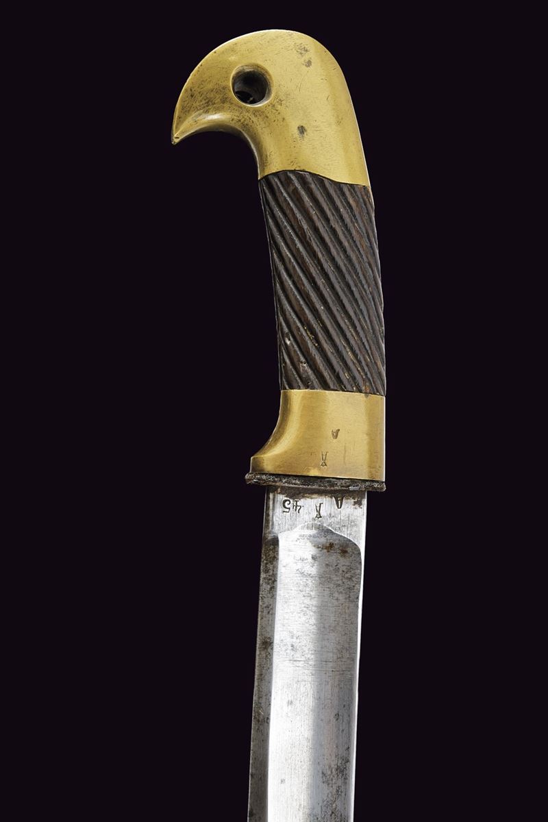 Lama curva sgusciata, sul tallone numerosi punzoni e data "1916"; fornimento in ottone con iscrizione in cirillico, punzoni e data "1916", impugnatura in legno scolpito a bande oblique. Fodero in legno rivestito di cuoio con fornimenti in ottone e baionetta. Epoca Russia Imperiale.