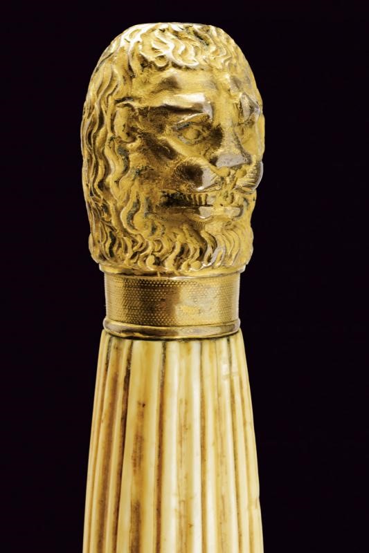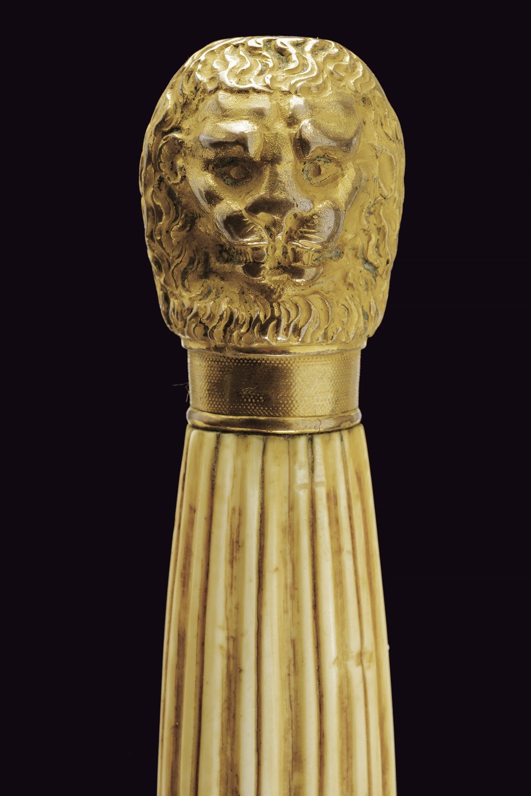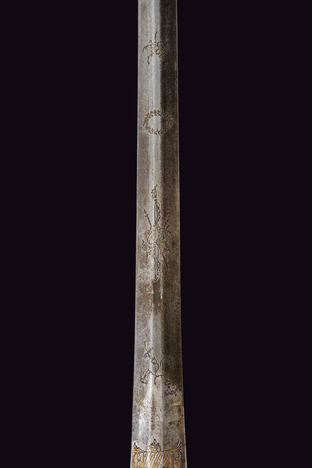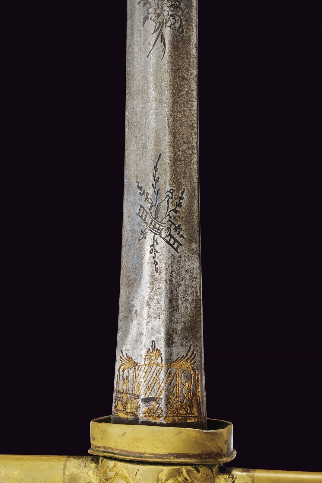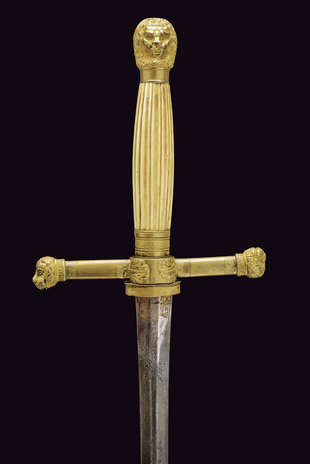 Lama dritta a due fili di sezione esagonale, incisa al forte a trofei e a motivi floreali, con resti di doratura. Fornimento in bronzo dorato, elso a bracci dritti, le estremità a testa di leone. Pomo a testa di leone bifronte. Impugnatura in corno di cervo con scanalature longitudinali. Ghiera decorata con una banda d'alloro. Priva di fodero.