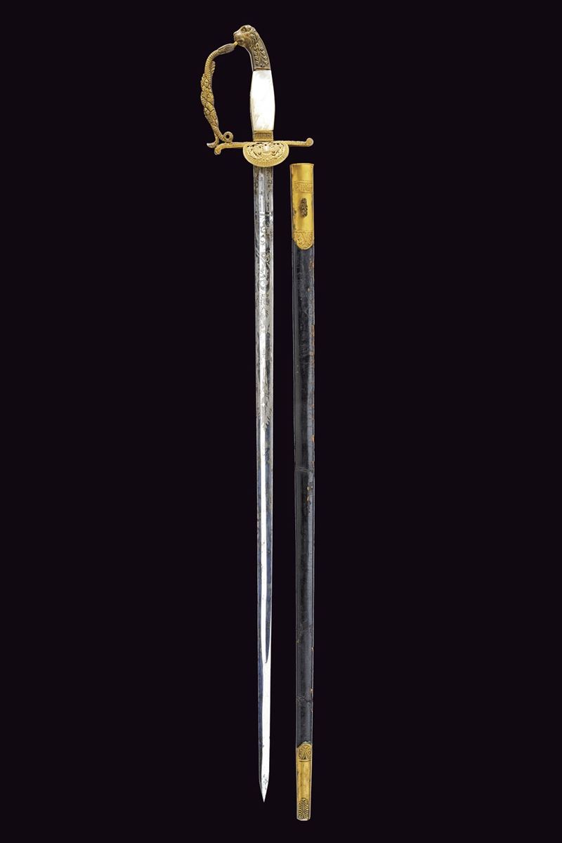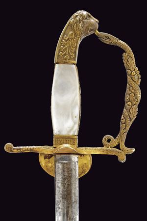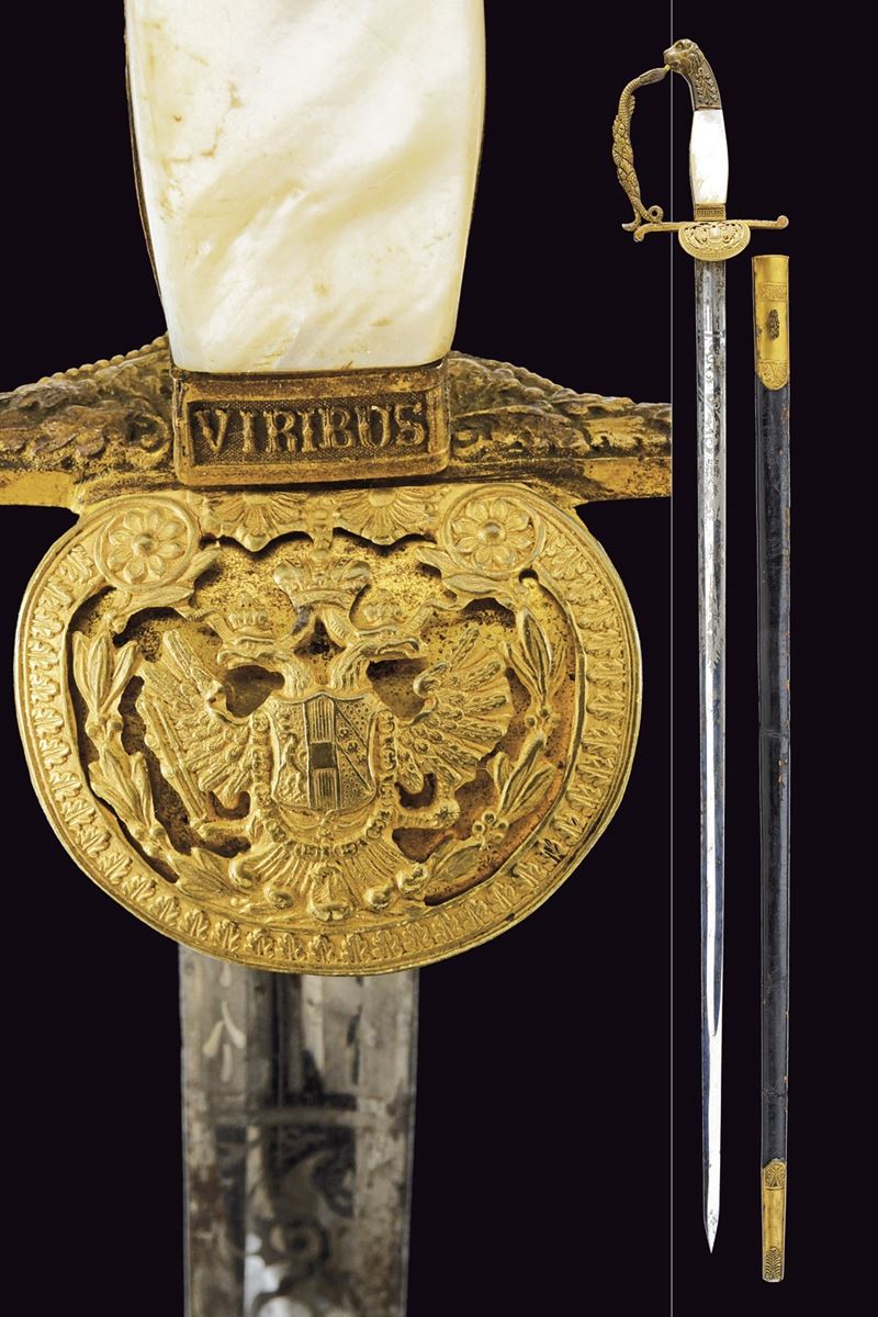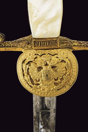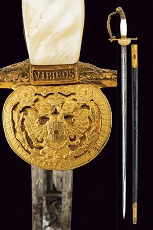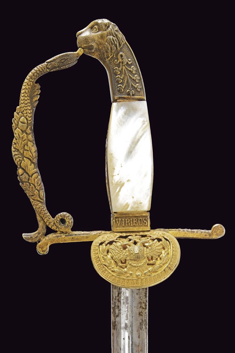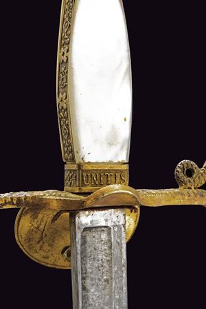 Lama dritta, a un filo e controfilo, con sguscio centrale e incisioni all'acquaforte. Fornimento in ottone, pelta traforata con aquila imperiale, pomo con testa di leone, guancette in madreperla con ghiera marcata "VIRIBUS UNITIS". Fodero in cuoio con fornimenti in ottone, incisi a motivi floreali.