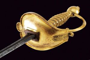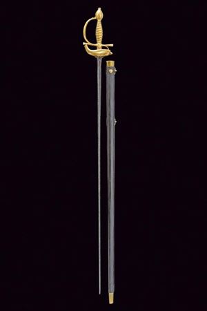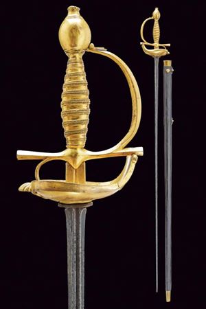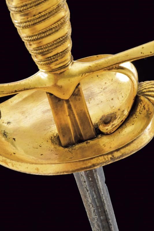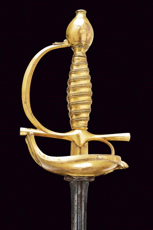 Lama dritta di sezione a losanga, la prima parte scanalata con resti di iscrizione. Fornimento in bronzo massiccio, dorato a mercurio, con valva a forma di cuore recante una conchiglia su un lato, ramo di guardia faccettato, pomo ovoidale e impugnatura lavorata a imitazione della trecciola. Fodero in legno rivestito di cuoio con fornimenti in ottone. Due anelli di sospensione.