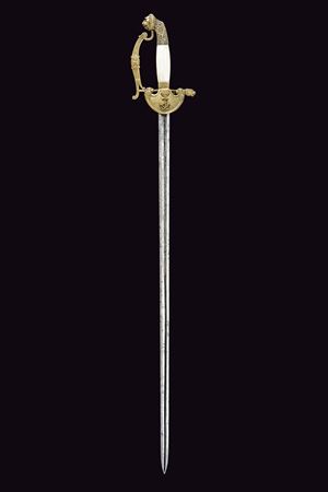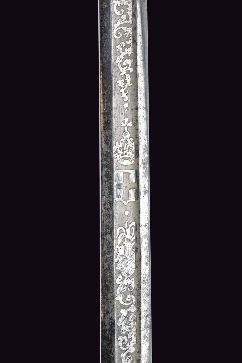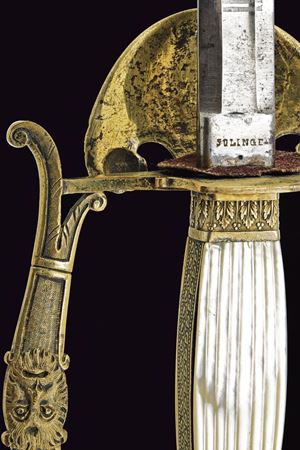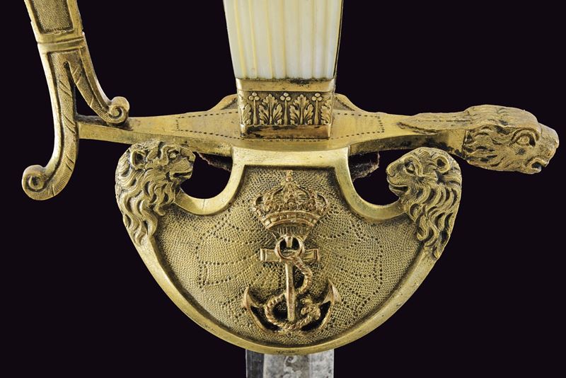 Lama dritta a doppio filo con sgusciatura centrale; al forte incisioni a bulino con stemma sabaudo sotto corona, trofei e motivi floreali. Tallone marcato “SOLINGEN”. Fornimento in metallo chiaro, con la valva recante un’ancora sormontata da corona, posta tra due teste di leone. Altre teste di leone alle estremità del braccio dell’elso, al centro del ramo di guardia e sul pomo. Impugnatura in legno con guancette in madreperla. Privo di fodero.