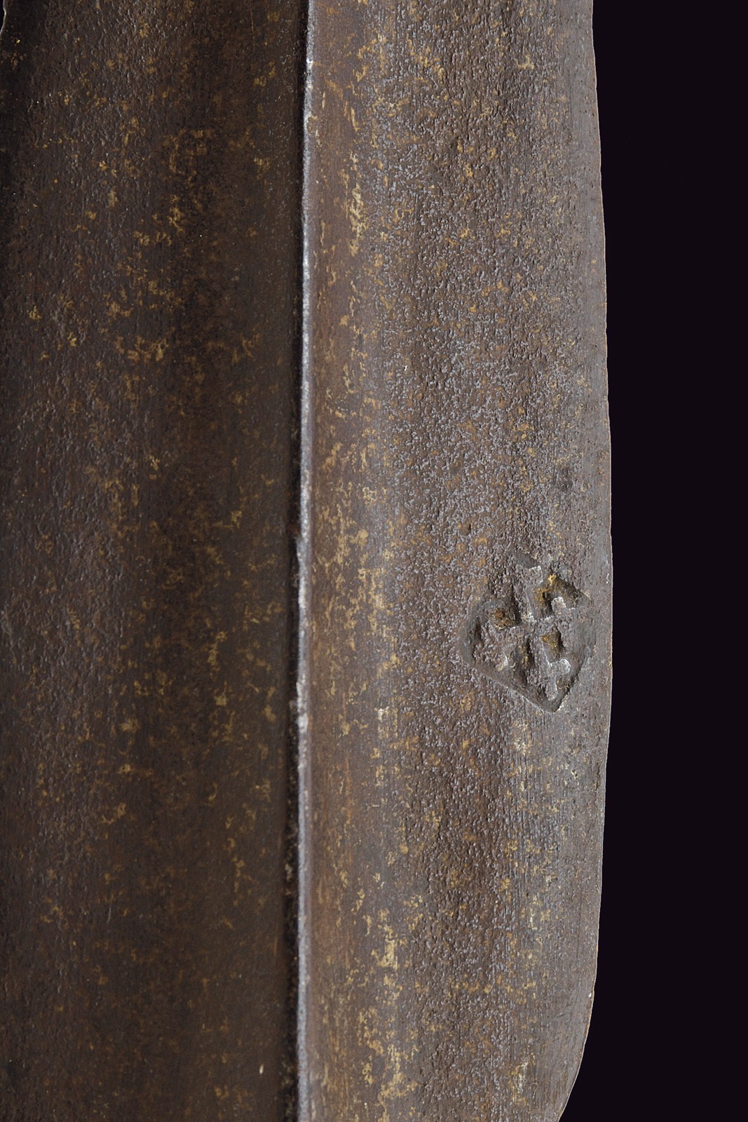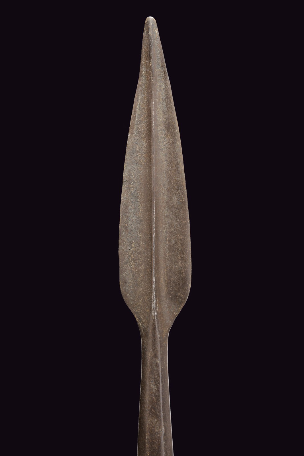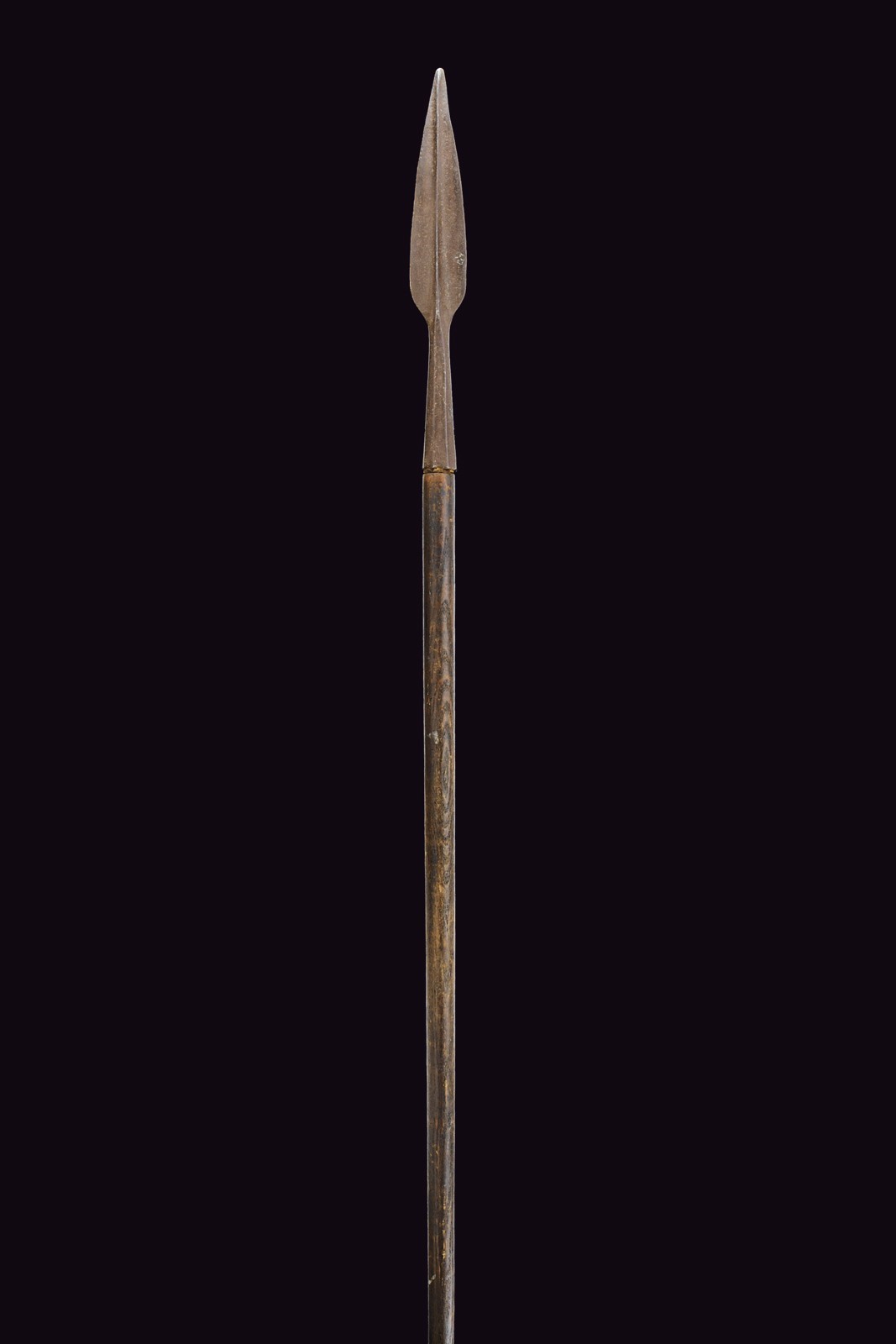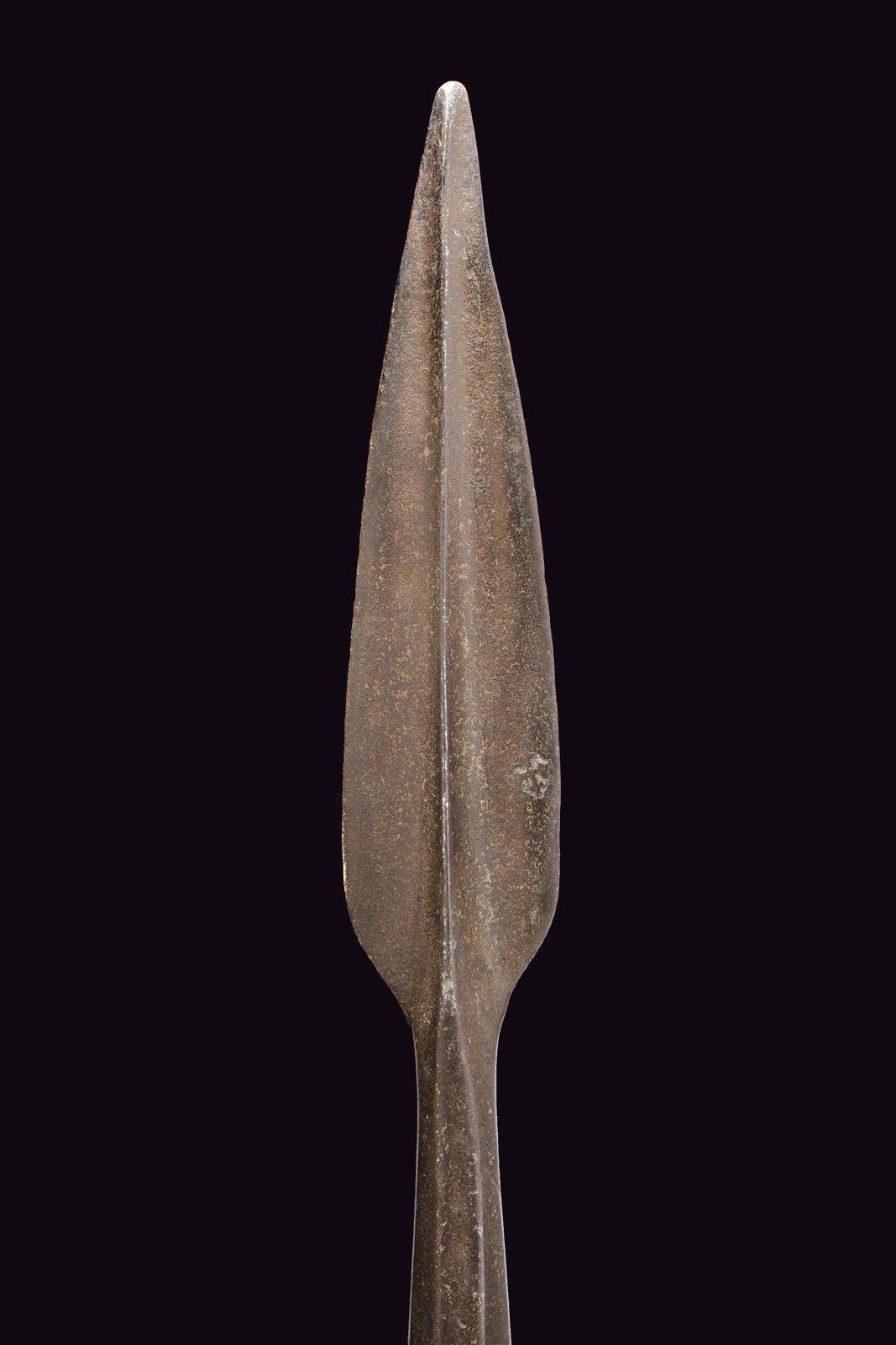 In ferro, a forma lanceolata con forte nervatura centrale, recante un'interessante punzone a forma di croce trilobata entro un rombo (S.S. Maurizio e Lazzaro); lunga gorbia faccetta. Asta lignea di epoca successiva.