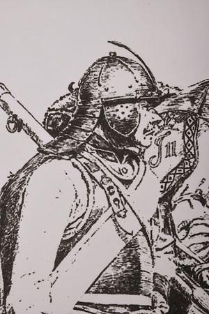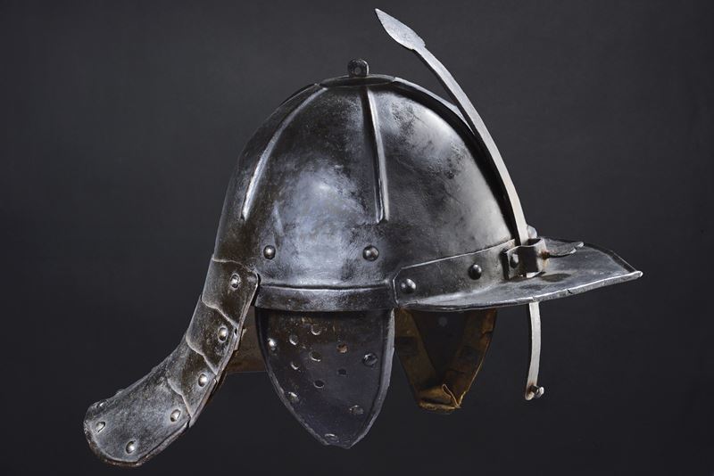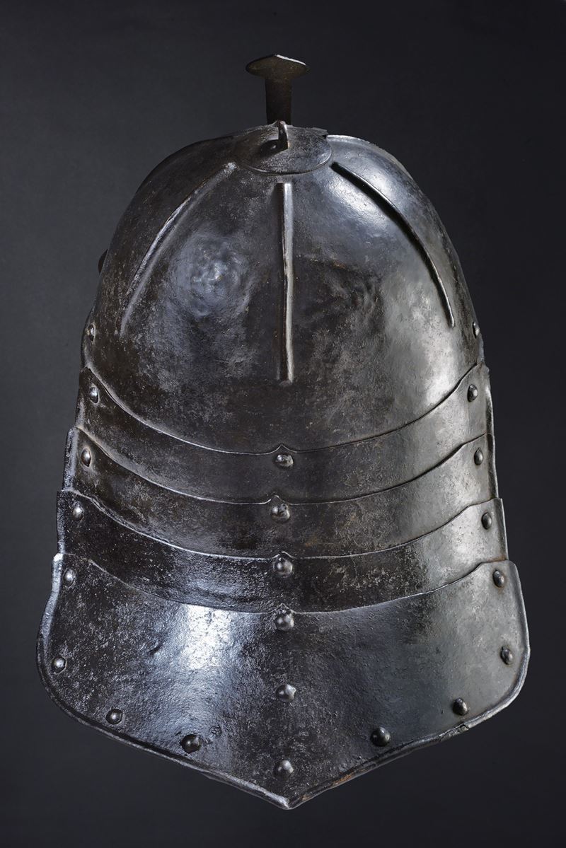 In ferro annerito; coppo monoblocco con sei nervature a sbalzo, al sommo anello su base circolare. Tesa appuntita con passante per nasale scorrevole, regolabile mediante vite a galletto; la punta con resti di marcatura. Gronda a quattro lame; guanciali mobili con fori d’aerazione disposti a rosetta. Coietti originali (in parte di restauro). Modello ancora in uso durante le guerre turche (1788–1789) presso la cavalleria pesante austriaca.