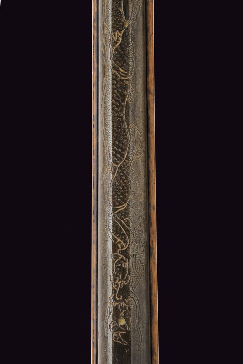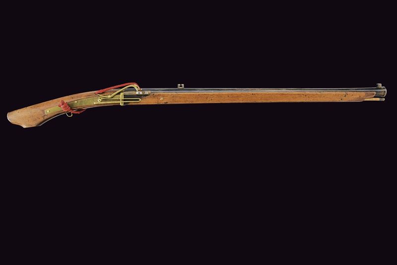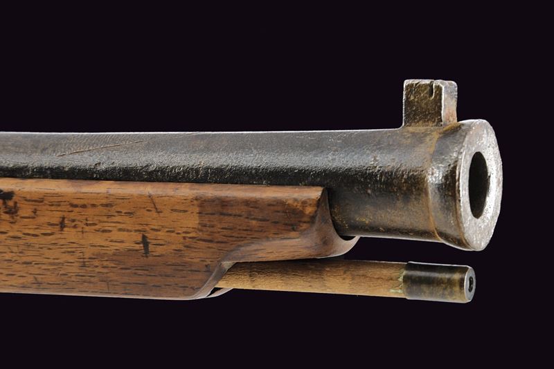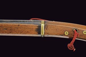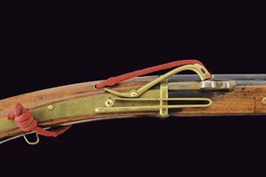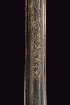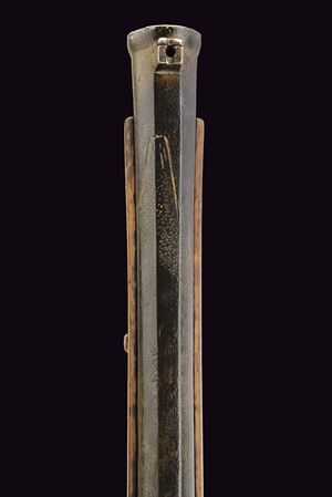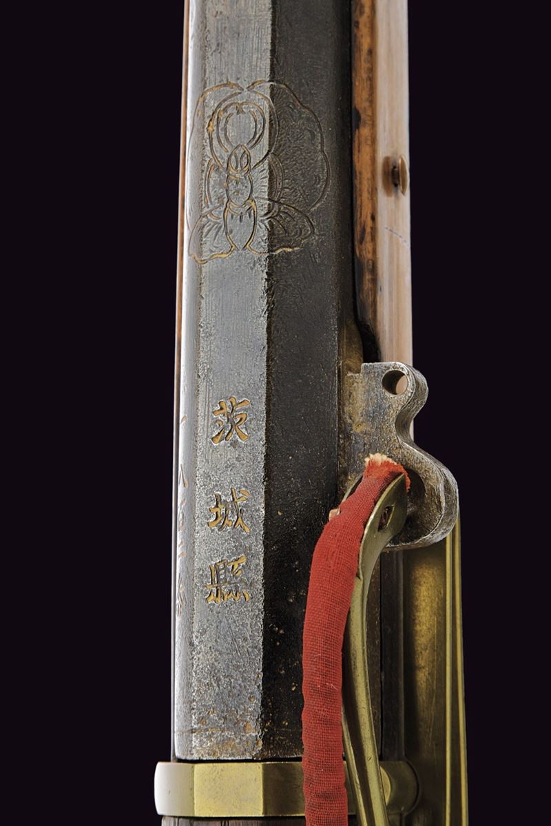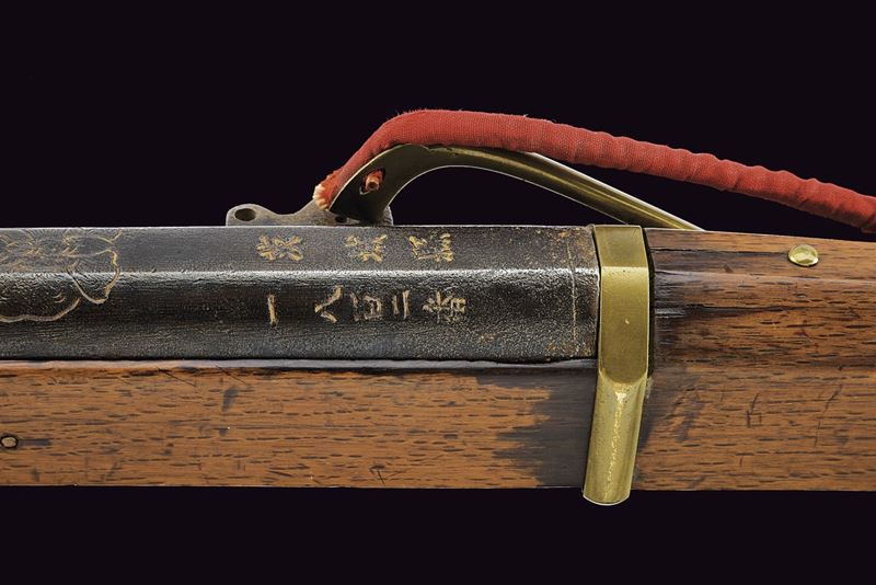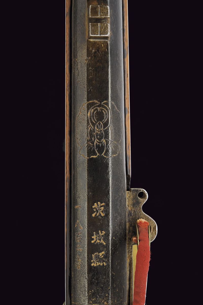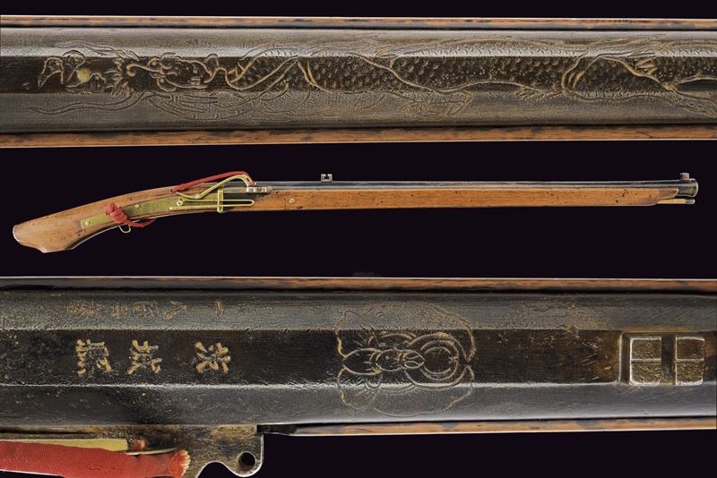 Canna ottagonale, liscia, dotata di alzo e mirino, inciso con firma (mei), mon (?), drago e a figura alata, gioia di bocca, cal. 14 mm; batteria e fornimenti in ottone inciso, il cane con testa di drago stilizzato. Cassa intera in legno con fornimenti in ottone (un piccolo fornimento sul dorso mancante). Bacchetta in legno.