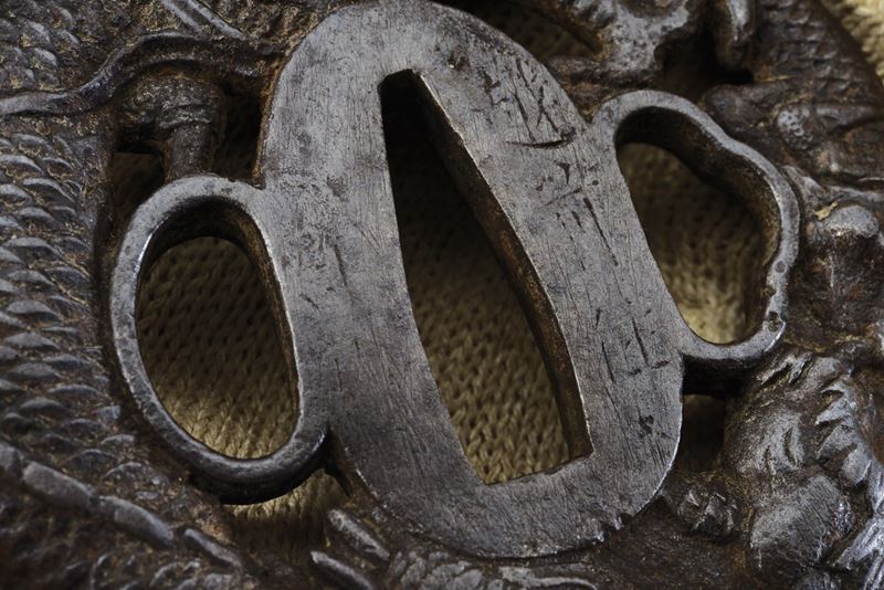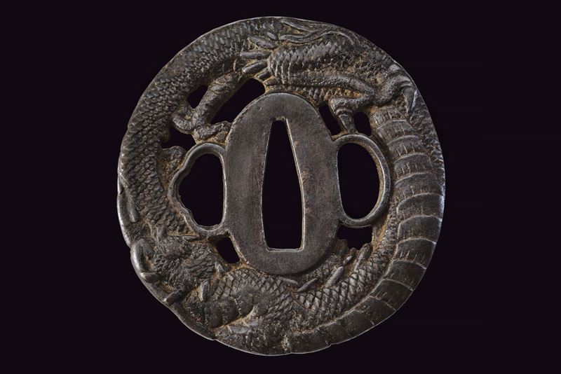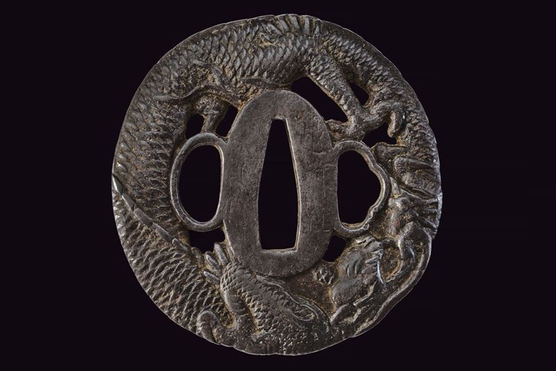 In ferro, tate-maru-gata, maru-bori raffigurante due draghi, mei appena visibile, kozuka e kogai-hitsu-ana. In kiri-box.