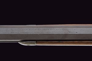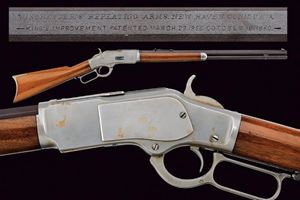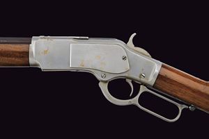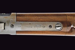 Canna ottagonale da 24", recante marcatura al dorso in due righe con indirizzo della ditta, "King's Improvement" e brevetti del 1860 e 1866; sempre al dorso indicazione del calibro "38. W.C.F." Mirino in metallo bianco (sostituito?) e alzo da fucile. Anima della canna pulita, rigatura visibile, un po' di pitting all'interno. Castello con carrello elevatore in ottone recante tracce di marcatura del calibro coevo alla canna. Guida del coperchio antipolvere in un unico pezzo con il telaio. Meccanica funzionante. Codolo dorsale con dicitura del modello, quello inferiore con matricola "256xxxB". Calcio ed astina in noce liscio (al collo un tassello sostituito). Calciolo munito di sportellino in ottone. Finiture molto probabilmente rinfrescate in epoca più tarda.