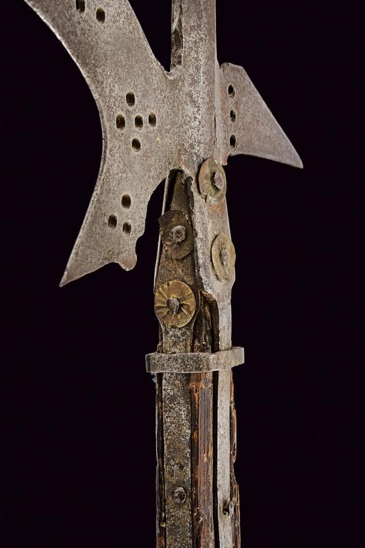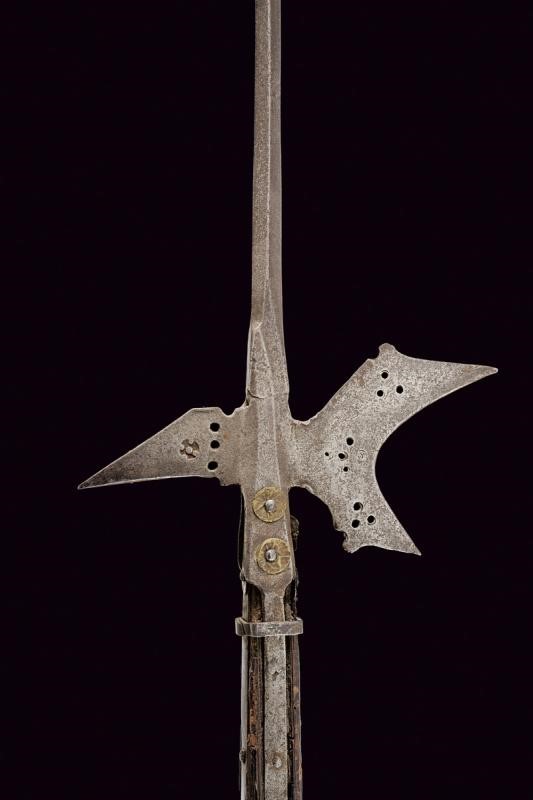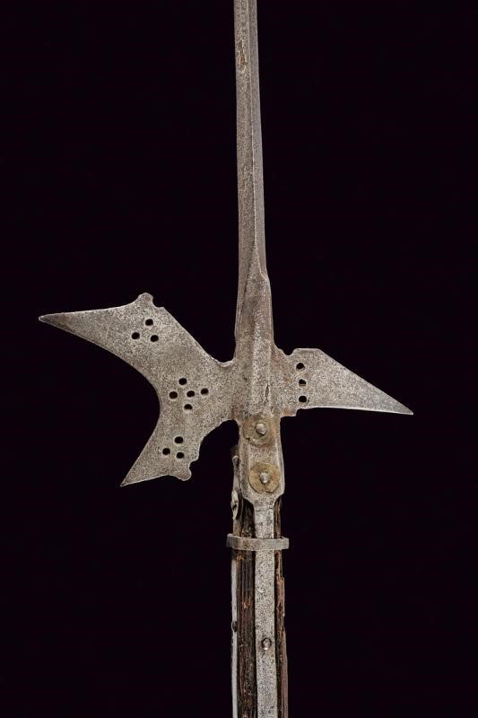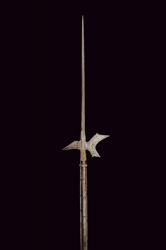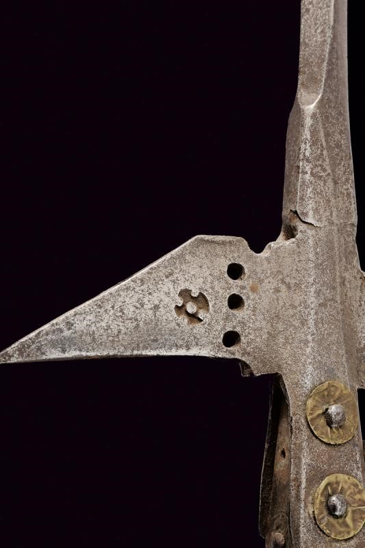 Lunghissima e robusta cuspide di sezione a losanga, scure fortemente incavata, con una punta prolungata, dotata di gobbe e trafori. Il becco quasi dritto, triangolare, traforato e punzonato su un lato con una profonda marca. Con quattro lunghe bandelle. Su asta lignea antica (mancanze), la gorbia decorata con rosette in ottone.
