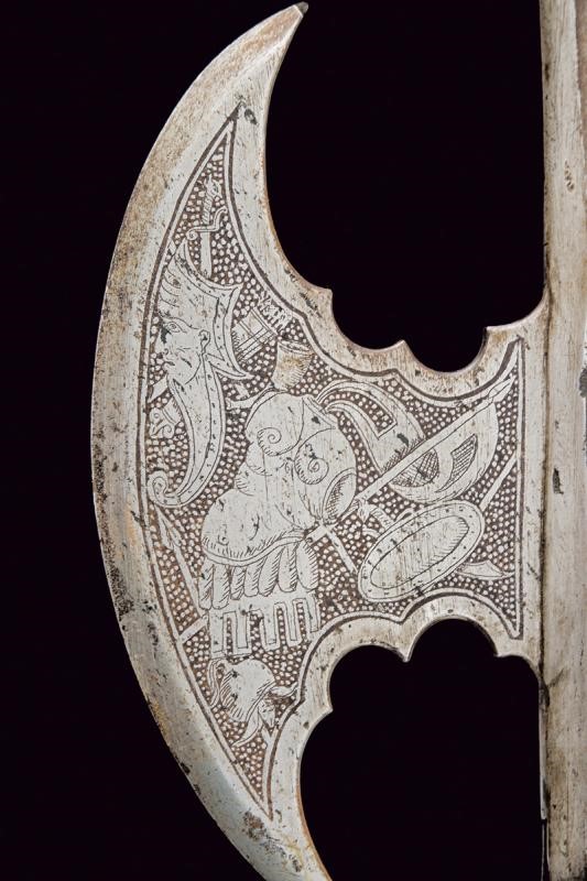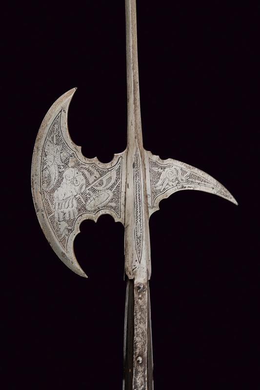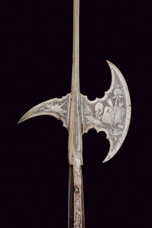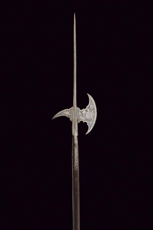 Cuspide in ferro di sezione quadra, scure convessa, becco incurvato verso il basso. Con belle incisioni a trofei d'armi e strumenti musicali su fondo puntinato. Gorbia con brevi bandelle. Asta lignea ottagonale.