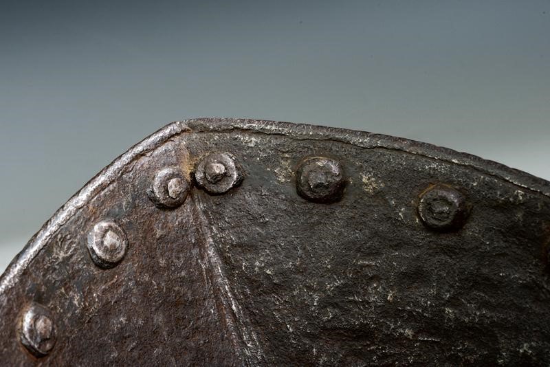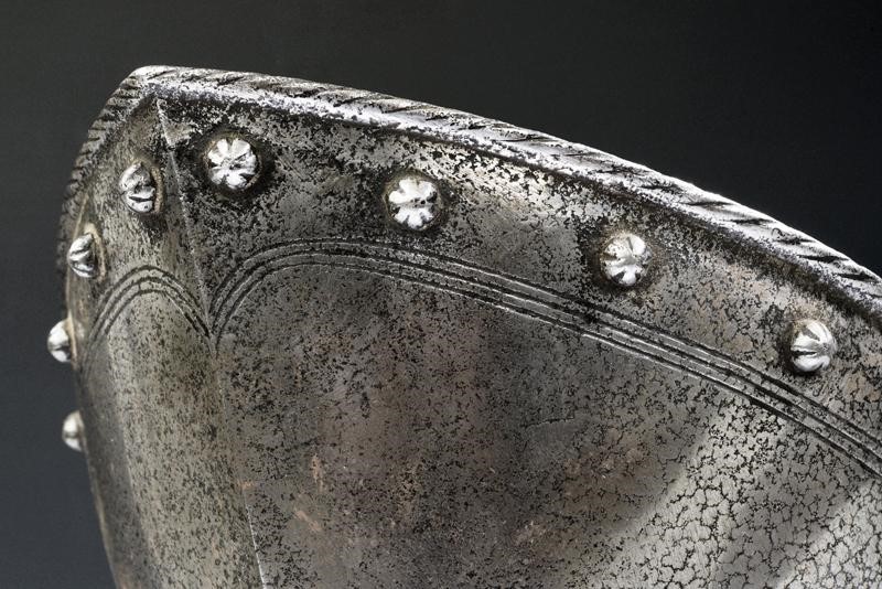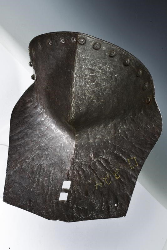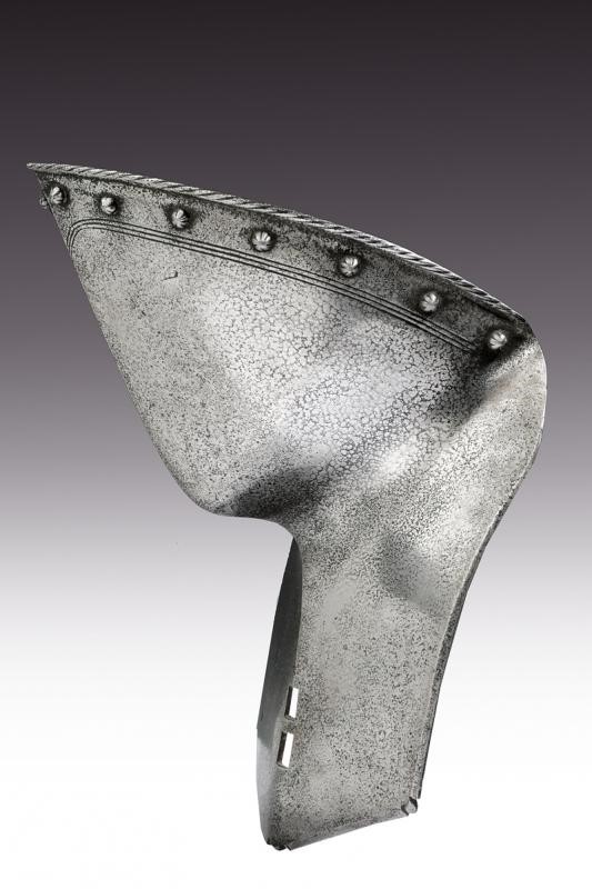 In ferro martellato in un solo pezzo e di foggia costolata in mezzeria. La parte superiore appuntita e dotata di bordo rilevato e lavorato a fingere il tortiglione e soprastante un giro di ribattini intagliati a raggi, ancor pi˘ in basso una delineatura a triplice linea. La parte inferiore sempre costolata e con due aperture rettangolari per il fissaggio sul petto, i margini inferiori obliqui e con intaglio a graffe al centro. Sul lato sinistro in basso un piccolo foro (per un gancio o un perno). L'interno con resti di cuoio sotto ai rivetti, i segni di martellatura ben visibili. Rara.