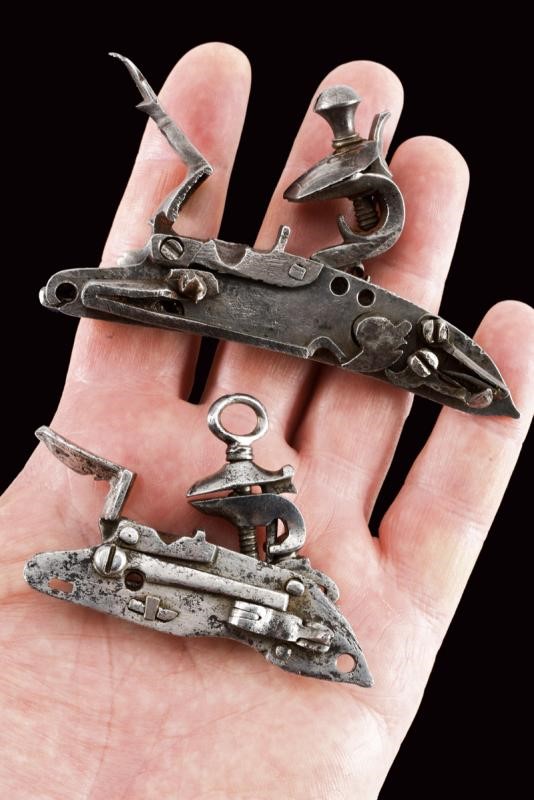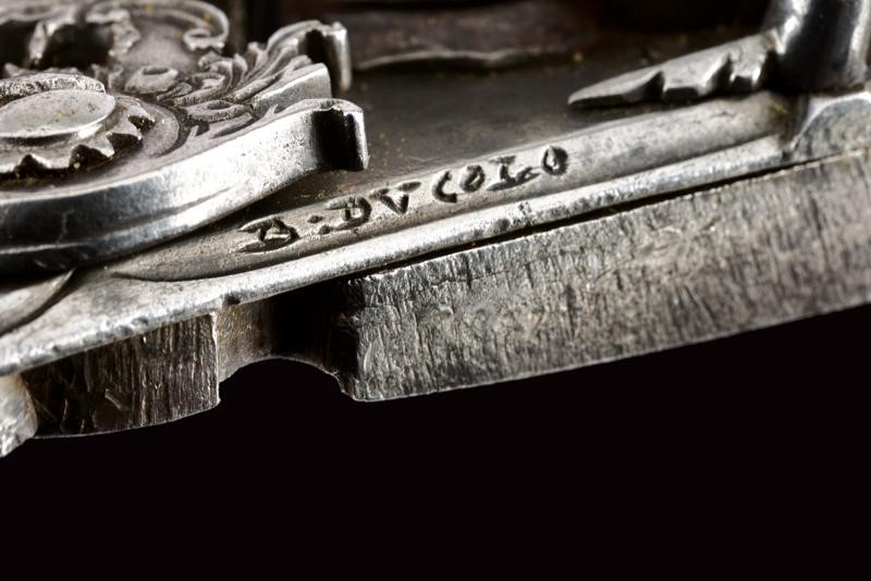 La prima con cartella, cane e martellina intagliati a motivi floreali, il bordo inclianto; recante la firma "B. DVCOLO". Insieme con una piccola batteria meridionale alla micheletta leggermente incisa ed intagliata.