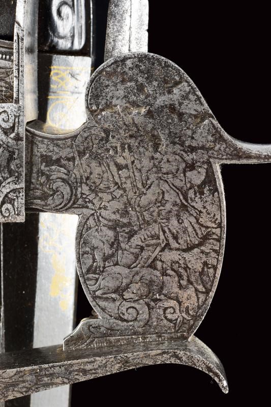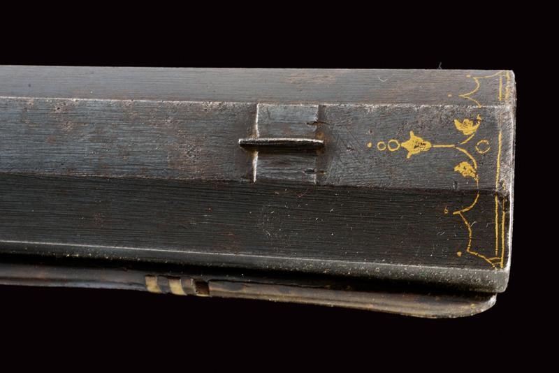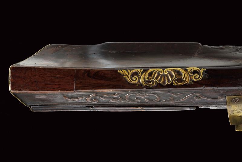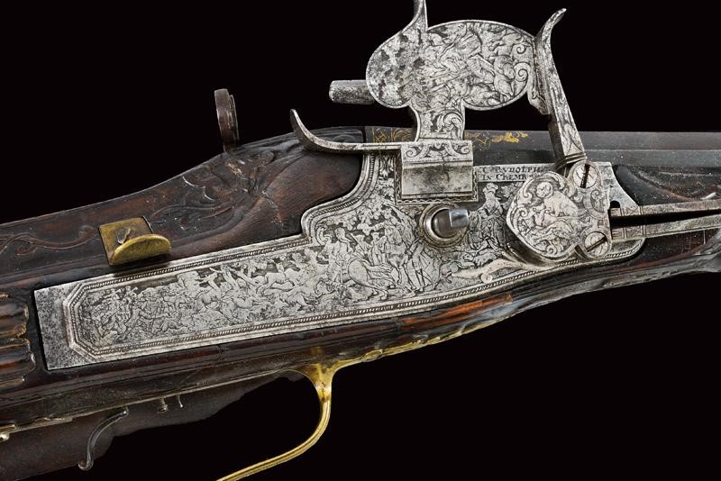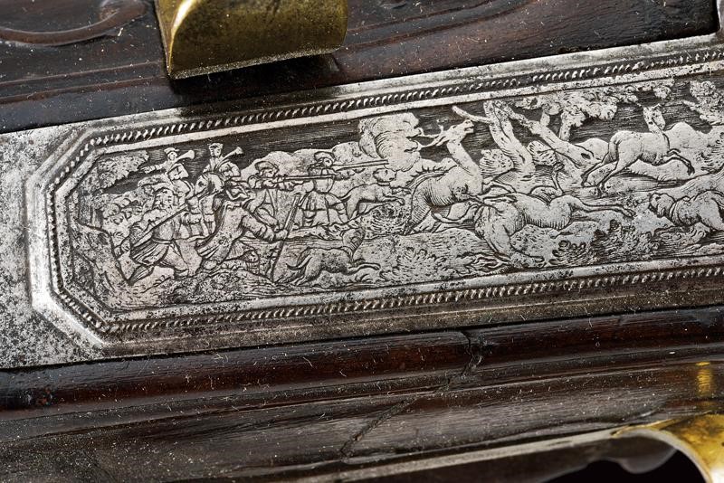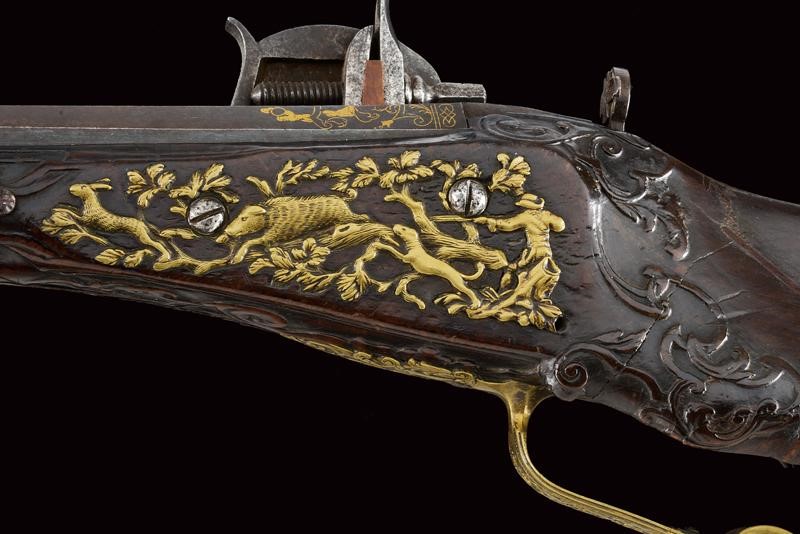 Canna ottagonale, rigata, strombata verso la volata, brunita, firmata "JOHANN CASPAR RUDOLPH" in oro, con un busto e ed altre decorazioni ageminate in oro, tacca di mira variabile decorata a foglie e dorata, mirino in ferro, cal. 16 mm in volata . Batteria a cartella piatta, quasi completamente ricoperta da un'eccezionale incisione effigiante una battuta di caccia al cervo nella quale uomini a piedi e a cavallo assieme ai loro segugi, guidati dal sovrano, inseguono tre prede; la copertura della molla raffigurante un altro segugio, l'ampia placca sul cane reca effigi di cacciatori in un bosco. La piastra è firmata davanti allo scodellino (il copriscodellino mancante) "C. RUDOLPH in CREMBS". Cassa intera in legno (fratture restaurate), scolpita a riccioli e racemi. Fornimenti in ottone; bellissima contropiastra riccamente traforata, recante una scena di caccia al cinghiale ed alla lepre fra racemi, il tutto in bassorilievo. Ponticello anatomico con scena cinegetica in rilievo. Calciolo piano ornato da incisioni raffiguranti animali e arabesche. patch-box ornato a bande longitudinali. Il fucile munito anche di poggiapollice, diottra e stecher. La bacchetta rimpiazzata.