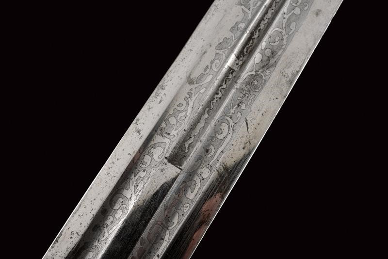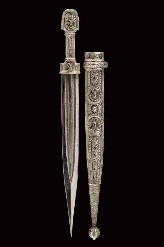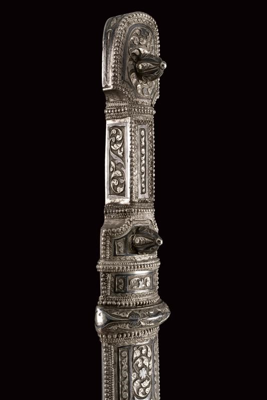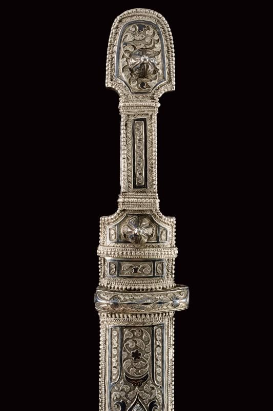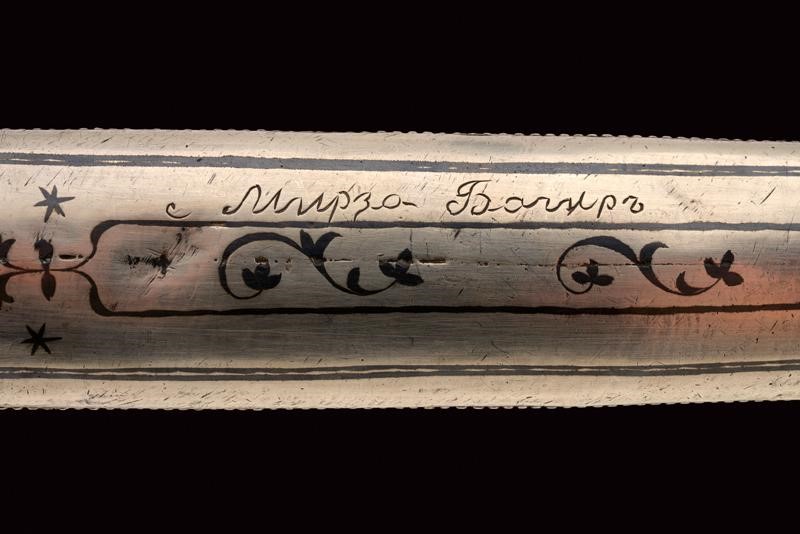 Lama dritta a due fili con triplice scanalatura incisa a motivi floreali su entrambi i lati. Fornimento di tipica foggia rivestito completamente d'argento, il lato anteriore finemente inciso e niellato a motivi floreali e geometrici. Fodero in legno decorato en suite. Il retro e con decorazioni a niello, resti di un punzone. Iscrizione in cirillico "Mirza Baghir".