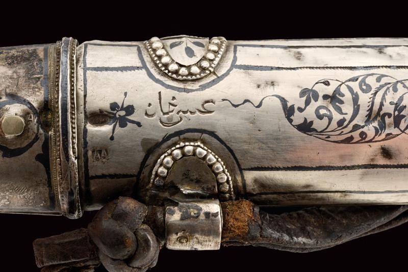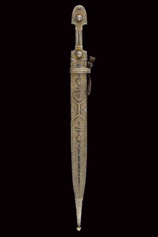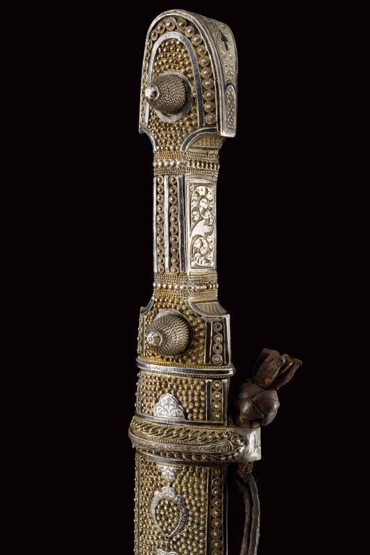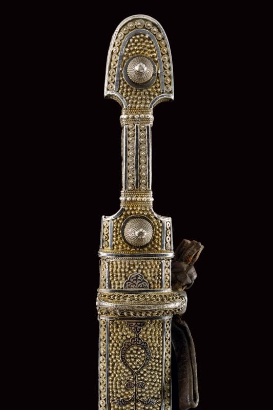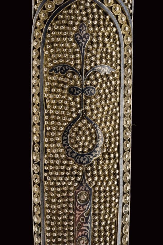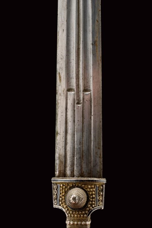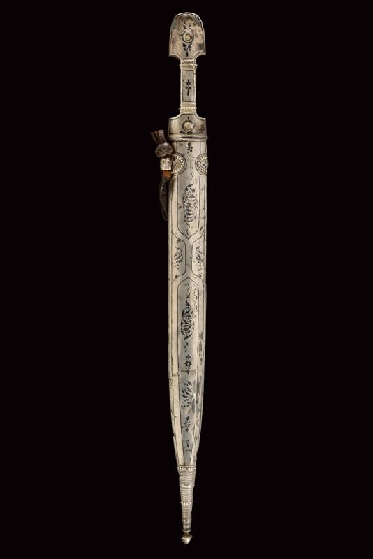 Lama dritta a due fili con triplice scanalatura. Fornimento di tipica foggia completamente rivestito con lamina d'argento parzialmente niellato; la parte anteriore lavorata in filigrana, il fianchi incisi a motivi floreali. Fodero in legno lavorato anteriormente en suite con il fornimento; il retro liscio (piccole intaccature) con decorazioni a niello, in alto il punzone "84" e "AA", due brevi iscrizioni in lingua araba, una riportante probabilmente il nome del proprietario, "Isa Khan", l'altra indecifrabile.