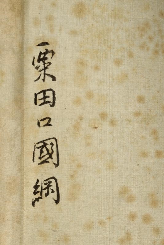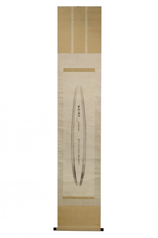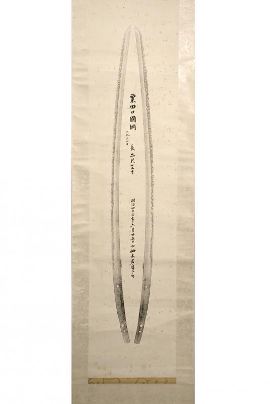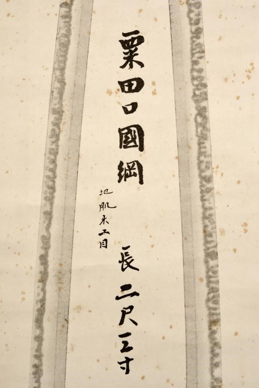 Bella stampa datata Meiji 25 Giugno anno 43 (1910) e raffigurante la famosa spada "Awataguchi Kunitsuma" del periodo Kamakura. Marcata "Awataguchi Kunitsuma - Mokume-hada". In antica siri-box con fornimenti in metallo.