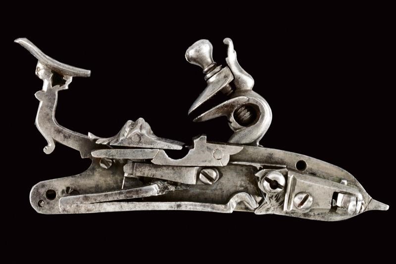 Cartella tondeggiante incisa a motivi floreali, con bel mascherone dalla barba appuntita alla codetta. Cane intagliato con un grande volto grottesco sul profilo del collo, la martellina con un serpente. Le viti del cane e della martellina con testa recante piccolo mascherone intagliato. Anche il copriscodellino con un mascherone e con coda lavorata a foglie.